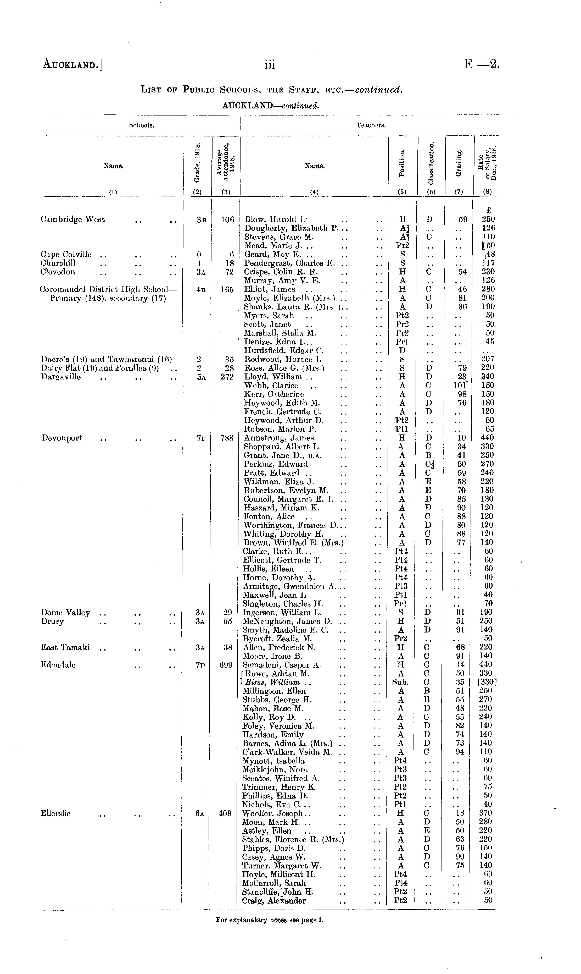 Schools. IVacl shers. Name. 00 a 1 5 a a a rt « oo a g 5> Name. -iltS 1 - 1 (3) (4) a o c S .2 «? 3 a 7n .. O a _ ■» o (5) (li) to o (7) O (- Ol M<ZJ a (8) (I) (2) Cain bridge West Capo Colvillo Churchill Clevedon Coroinandel District High School— Primary (148), secondary (17) Dacre's (19) and Tawharanui (16) Dairy Plat (19) and Fernilea (9) .. I )argavillo Devouport 2 2 5a 3b 0 1 3a 4b 7lf 106 Blow, Harold I.Dougherty, Elizabeth P. .. Stevens, Grace M. Mead, Marie J. .. 6 Gcard, May E. .. 18 Pendergrast, Charles E. .. 72 Crispe, Colin R. R. Murray, Amy V. E. 166 Elliot, James Moyle, Elizabeth (Mrs.) .. Shanks, Laura R. (Mrs. ).. Myers, Sarah Scott, Janet Marshall, Stella M. Denize, Edna I... Hurdsfield, Edgar C. 35 Redwood, Horace 1. 28 Ross, Alice G. (Mrs.) 272 Lloyd, William Webb, Clarice Kerr, Catherine I Icy wood, Edith M. French, Gertrude C. Hoywood, Arthur D. Robson, Marion P. 788 Armstrong, James Sheppard, Albert L. Grant, Jane I)., B.A. Perkins, Edward Pratt, Edward Wildman, Eliza J. Robertson, Evelyn M. Connell, Margaret E. 1. Haszard, Miriam K. Fenton, Alice Worthington, Prances D... Whiting, Dorothy H. Brown, Winifred E. (Mrs.) Clarke, Ruth E.. . Ellieott, Gertrude T. Hollis, Eileen Home, Dorothy A. Armitage, Gwendolen A. .. Maxwell, Jean L. Singleton, Charles H. 29 Ingerson, William L, 55 McNaughton, James D. Smyth, Madeline E. C. Bvcroft, Zealia M. 38 Allen, Frederick N. Moore, Irene B. 699 Semadeni, Casper A. (Rowe, Adrian M. 1 Birss, William Millington, Ellen Stubbs, George H. Mahon, Rose M. Kelly, Roy D. .. Foley, Veronica M. Harrison, Emily Barnes, Adina L. (Mrs.) . . Clark-Walker, Veida M. .. Mynott, Isabella Mciklejohn, Nora Sceates, Winifred A. Trimmer, Henrv K. Phillips, Edna D. Nichols, Eva C. .. 409 Woollcr, Jose ph... Moon, Mark H. .. Astley, Ellen Stables, Florence R. (Mrs.) Phipps, Doris D. Casey, Agnes W. Turner, Margaret W. Hoyle, Millicent H. MeCarroll, Sarah Stancliffe,%Iohn H. Craig, Alexander 100 0 18 72 165 35 28 272 788 11 A3 a1 Pr2 S s H A H A A Pt2 Pr2 Pr2 Prl D S s H A A A A Pt2 Ptl II A A A A A A A A A A A A Pt4 Pt4 Pt4 Pt4 Pt3 Ptl Prl S H A Pr2 H A II A Sub. A A A A A A A A Pt4 Pt3 ! Pt3 Pt2 Pt2 Ptl H A A A A A A Pt4 Pt4 Pt2 Pt2 D 0 c C c D D D C c D D D C B :;- ; E E I) D C D C D 59 64 46 81 80 79 23 101 98 70 10 34 41 50 59 58 70 85 90 88 80 88 77 £ 260 126 110 150 ,48 117 230 126 280 200 190 50 50 50 45 207 220 340 150 150 180 120 50 65 440 330 250 270 240 220 180 130 120 120 120 120 140 60 60 60 OO 60 40 70 190 250 140 50 220 140 440 330 [330] 250 270 220 240 140 140 140 110 OO 00 60 75 50 40 370 280 220 220 150 140 140 (1!) 00 50 50 Dome Valley Drury „ 3a 29 55 D l> D 91 51 91 East Tamaki 3a 38 C 0 C C C B B I) C D D D C 68 91 14 50 35 51 55 48 55 82 74 73 94 Edondale 7d 099 Ellerslie 6a 409 C D E D C I) 0 18 50 50 63 76 90 75 For e: For explanatary notes seo page i.