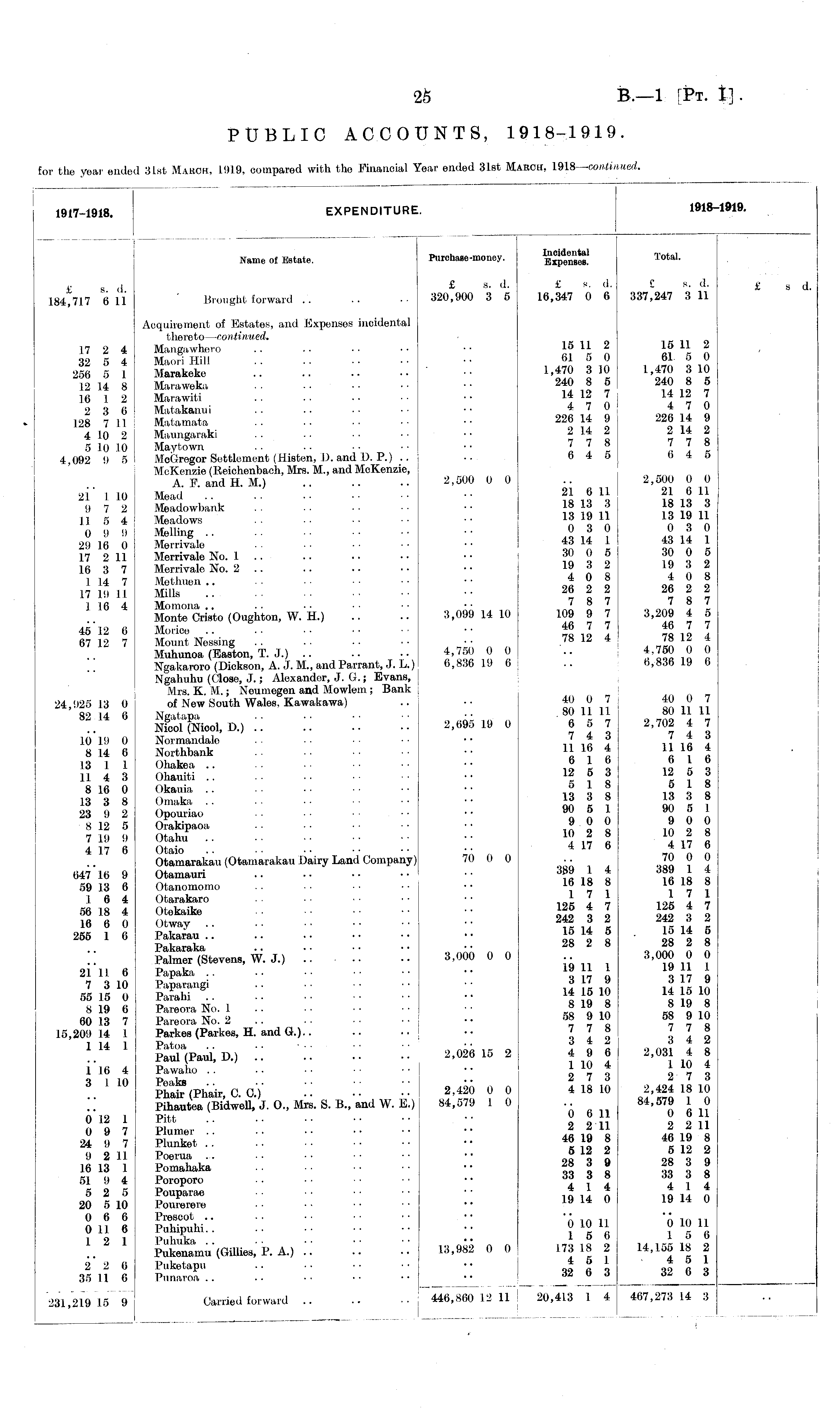 1917-1918. EXPENDITURE 1918-1919. Name ol Estate. Purchase-money. Incidental Expenses. Total. £ s. d. 184,717 6 11 Brou glit forward £ s. d. 320,900 3 5 £ s. d. 16,347 0 6 C s. d. 337,247 3 11 £ s d, 17 2 4 32 5 4 256 5 I 12 14 8 16 1 2 2 3 6 128 7 11 4 10 2 5 10 10 4,092 9 5 21 1 10 9 7 2 11 5 4 0 9 9 29 16 0 17 2 11 16 3 7 1 14 7 17 19 11 1 16 4 45 12 6 67 12 7 24,925 13 0 82 14 6 10 19 0 8 14 6 13 1 1 11 4 3 8 16 0 13 3 8 23 9 2 8 12 5 7 19 9 4 17 6 Acquirement of Estates, and Expenses incidental thereto — continued. Manga whero Maori Hill Marakeke Maraweka Marawiti Matakanuj Matamata Maungaraki Maytown McGregor Settlement (Histon, D. and D. P.) .. McKcnzie (Reichenbach, Mrs. M., and McKenzie, A. F. and H. M.) Mead Meadowbank Meadows Moiling Merrivalo Merrivale No. 1 .. Merrivale No. 2 .. Methuen Mills Momona Monte Cristo (Oughton, W. H.) Moriee Mount Nessing Muhunoa (Easton, T. J.) .. Ngakaroro (Dickson, A. J. M., andParrant, J. L.) Ngahuhu (Close, J.; Alexander, J. G.; Evans, Mrs. K. M.; Neumegen and Mowlem; Bank of New South Wales, Kawakawa) Ngatapa Niool (Niool, D.) .. Normandale Northbank Ohakea Ohauiti Okauia Omaka Opouriao ■ ■ • • , ■ ■ Orakipaoa Otahu Otaio Otamarakau (Otamarakau Dairy Land Company) Otamauri Otanomomo Otarakaro Otekaike Otway Pakarau Pakaraka Palmer (Stevens, W. J.) Papaka Paparangi Parahi Pareora No. 1 Pareora No. 2 Parkes (Parkes, H. and G.).. Patoa .. •• Paul (Paul, D.) Pawaho Peaks Phair (Phair, C. C.) Pihautea (Bidwell, J. O., Mrs. S. B., and W. E.) Pitt Piumer Plunket Poerua Pomahaka Poroporo Pouparae Pourerere Preseot Puhipuhi Puhuka Pukenamu (Gillies, P. A.) .. Puketapu Punaroa .. • • ■ • 2,500 0 0 3,099 14 10 4,750 0 0 6,836 19 6 2,695 19 0 15 11 2 61 5 0 1,470 3 10 240 8 5 14 12 7 4 7 0 226 14 9 2 14 2 7 7 8 6 4 5 21 6 1.1 18 13 3 13 19 11 0 3 0 43 14 1 30 0 5 19 3 2 4 0 8 26 2 2 7 8 7 109 9 7 46 7 7 78 12 4 40 0 7 80 II 11 6 5 7 7 4 3 11 16 4 6 1 6 12 5 3 5 18 13 3 8 90 5 I 9 0 0 10 2 8 4 17 6 15 11 2 61 5 0 1,470 3 10 240 8 5 1.4 12 7 4 7 0 226 14 9 2 14 2 7 7 8 6 4 5 I 2,500 0 0 21 6 11 18 13 3 13 19 11 0 3 0 43 14 1 30 0 5 19 3 2 4 0 8 26 2 2 7 8 7 3,209 4 5 46 7 7 78 12 4 4,750 0 0 6,836 19 6 40 0 7 80 11 11 2,702 4 7 7 4 3 11 16 4 6 1 6 12 5 3 5 18 13 3 8 90 5 1 9 0 0 10 2 8 4 17 6 70 0 0 389 1 4 16 18 8 1 7 1 126 4 7 242 3 2 15 14 5 28 2 8 3,000 0 0 19 11 1 3 17 9 14 15 10 8 19 8 58 9 10 7 7 8 3 4 2 2,031 4 8 1 10 4 2 7 3 2,424 18 10 84,579 1 0 0 6 11 2 2 11 46 19 8 5 12 2 28 3 9 33 3 8 4 1 4 19 14 0 70 0 0 389 1 4 16 18 8 1 7 1 125 4 7 242 3 2 15 14 5 28 2 8 647 16 9 59 13 6 I 6 4 56 18 4 16 6 0 255 1 6 3,000 0 0 19 11 1 3 17 9 14 15 10 8 19 8 58 9 10 7 7 8 3 4 2 4 9 6 1 10 4 2 7 3 4 18 10 21 11 6 7 3 10 55 15 0 8 19 6 60 13 7 15,209 14 1 1 14 1 2,026 15 2 i'l6 4 3 1 10 2,420 0 0 84,579 1 0 0 12 1 0 9 7 24 9 7 9 2 II 16 13 1 51 9 4 5 2 5 20 5 10 0 6 6 0 11 6 1 2 1 0 6 11 2 2 11 46 19 8 5 12 2 28 3 9 33 3 8 4 1 4 19 14 0 13,982 0 0 0 10 11 1 5 6 173 18 2 4 5 1 32 6 3 0 10 11 1 5 6 14,1.55 18 2 4 5 1 32 6 3 2' 2 6 35 11 6 231,219 15 9 Carried forward .. • • 446,860 12 11 20,41.3 1 4 467,273 14 3