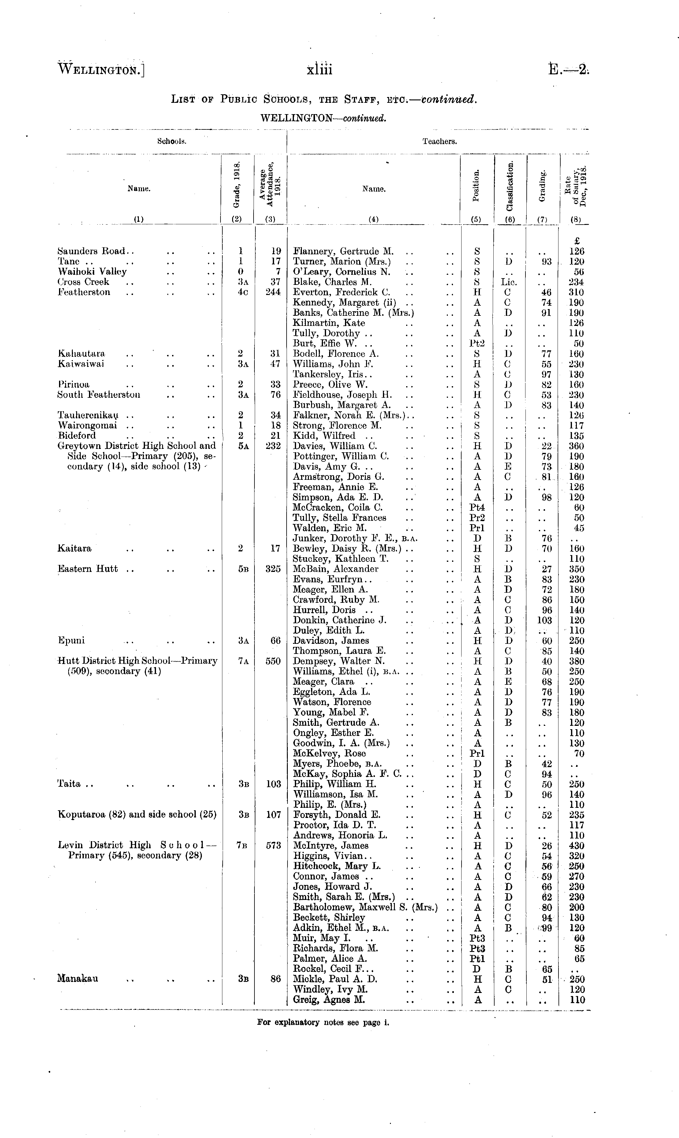 Sohools. Teachers. GO tS -i _, u S —S3 - « £ gS 2 «jr 9 < (2) (3) A o ts ame. 3 o s (4) , (5) § 1 O ..-00 bD s_*w fl : Z0 „ O1 1-17 fc. . rH n 0 9 -a °fl _JTl__ (8J_ Name. (D (6) Saunders Road Tane Waihoki Valley Cross Creek Featherston Kahautara Kaiwaiwai Pirinoa South Featherston Tauherenikau Wairongomai Bideford Greytown District High School and Side School —Primary (205), secondary (14), side school (13) - Kaitara Eastern Hutt .. 1 1 0 3a 4o 2 3a 2 :s.\ 2 1 2 5a 2 6b 17 325 19 17 7 37 244 31 47 33 76 34 18 21 232 Flannery, Gertrude M. .. .. S Turner, Marion (Mrs.) .. .. S O'Leary, Cornelius N. .. .. S Blake, Charles M. .. .. S Everton, Frederick C. .. .. II Kennedy, Margaret (ii) .. .. A Banks, Catherine M. (Mrs.) .. A Kilmartin, Kate .. .. A Tully, Dorothy .. .. .. A Burt, Erne W. .. .. .. Pt2 Bodell, Florence A. .. .. S Williams, John F. .. .. H Tankersley, Iris.. .. .. A Preece, Olive W. .. .. S Fieldhouse, Joseph H. .. .. H Burbush, Margaret A. .. A Falkner, Norah E. (Mrs.).. .. S Strong, Florence M. .. .. S Kidd, Wilfred .. . . .. S Da vies, William C. .. .. H Pottinger, William C. .. .. A Davis, Amy G. .. .. .. A Armstrong, Doris G. .. .. A Freeman, Annie E. .. .. A Simpson, Ada E. D. .. .. A McCracken, Coila C. .. .. Pt4 Tully, Stella Frances .. .. Pr2 Walden, Eric M. .. .. Prl Junker, Dorothy F. E., b.a. .. D Bowloy, Daisy R. (Mrs.) .. .. H Stuckey, Kathleen T. .. .. S MeBain, Alexander .. .. H Evans, Eurfryn.. .. .. A Meager, Ellen A. .. .. A Crawford, Ruby M. .. .. A Hurrell, Doris .. .. .. A Donkin, Catherine J. .. .. A Duley, Edith L. .'. .. A Davidson, James .. .. H Thompson, Laura E. .. .. A Dempsey, Walter N. .. .. H Williams, Ethel (i), b.a. .. .. A Meager, Clara .. .. .. A Eggleton, Ada L. .. .. A Watson, Florence .. .. A Young, Mabel F. .. .. A Smith, Gertrude A. .. .. A Ongley, Esther E. .. .. A Goodwin, I. A. (Mrs.) .. .. A McKelvey, Rose .. .. Prl Myers, Phoebe, b.a. .. .. D McKay, Sophia A. F. C. .. .. D Philip, William H. .. .. H Williamson, Isa M. .. ' .. A Philip, E. (Mrs.) .. .. A Forsyth, Donald E. .. .. H Proctor, Ida D. T. .. .. A Andrews, Honoria L. .. .. A Melntyre, James .. .. H Higgins, Vivian.. .. .. A Hitchcock, Mary L. .. ■ .. A Connor, James .. .. .. A Jones, Howard J. .. .. A Smith, Sarah E. (Mrs.) .. .. A Bartholomew, Maxwell S. (Mrs.) .. A Beckett, Shirley .. .. A Adkin, Ethel M., b.a. .. .. A Muir, May I. Pt3 Richards, Flora M. .. .. Pt3 Palmer, Alice A. .. .. Ptl Rockel, Cecil F... .. .. D Mickle, Paul A. D. .. .. H Windley, Ivy M. .. .. A Greig, Agnes M. .. .. A b Lie. C c D D D 0 c D C 1) D D E C :b D D B D 0 0 I) . D, D C D B E D D D B £ 120 93 120 50 234 46 310 74 190 91 190 126 110 50 77 160 55 230 97 130 82 160 53 230 83 140 120 117 135 22 360 79 190 73 180 81 160 .-. , 126 98 120 60 50 45 76 70 160 110 27 350 83 230 72 180 86 150 96 140 103 120 ..- 110 60 250 85 140 40 380 50 250 68 250 76 190 77 190 83 180 120 110 130 70 42 94 50 250 96 140 110 52 235 117 110 26 430 54 320 56 250 69 270 66 230 62 230 80 200 94 130 s99 120 60 85 65 65 51 250 120 110 Kpuni 3a 66 Hutt District High School—Primary (509), secondary (41) 7a 550 Taita B C c D 3b 103 Koputaroa (82) and side school (25) 3b 107 C Levin District High School — Primary (545), secondary (28) 7b 573 D 0 c c D D 0 c B Manakau B C c 3u 86 For exj ilanatory notes sec page i.