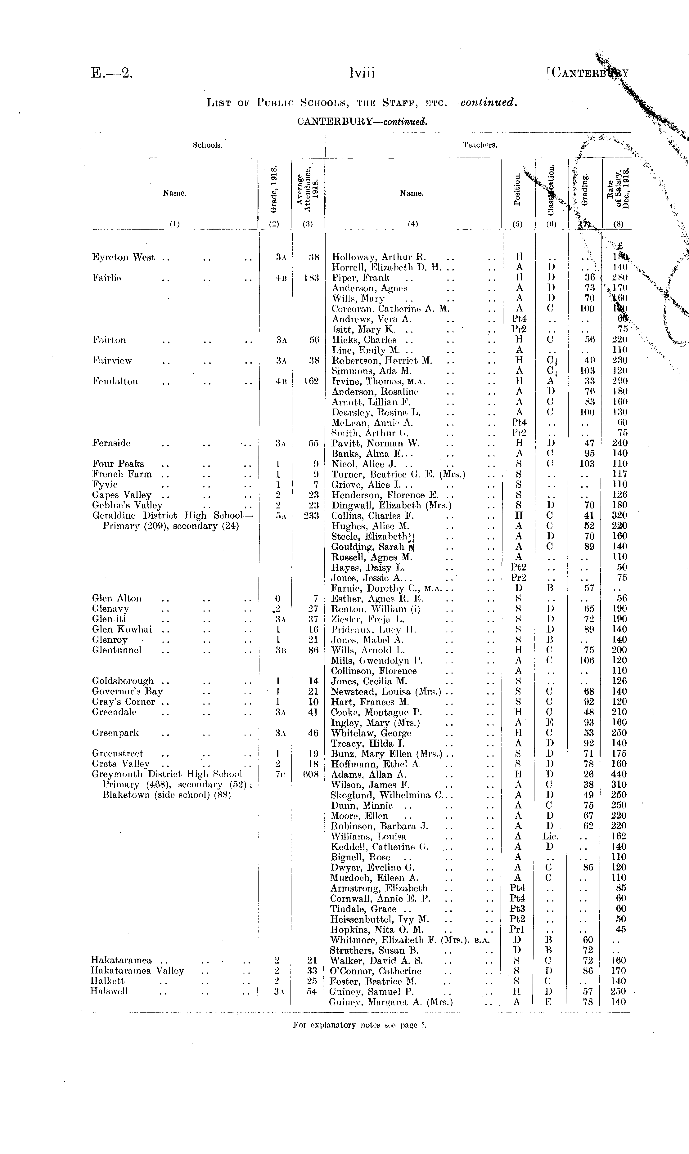 Schools. Teachers: CO Hi 3 |L I Name. •§" S 8 2 N ame - s 2 <S Si 9 < (.1.) (2) (8) ___ (4) (:,) Eyreton West .. .. .. 3a 38 Hollow-ay, Arthur.1st. .. .. H Horrell, Elizabeth D. 11. .. .. A Fairlio .. -.. .. 4u 183 Piper, Frank .. .. .. II Anderson, Agnes .. .. A Wills, Mary .. .. .. A Corcoran, Catherine A. M. .. A Andrews, Vera A. .. .. Pt4 Isitt, Mary K. .. .. '. .. Pr2 Fairton .. .. .. 3a 56 Hicks, Charles .. .. .. H Lino, Emily M. .. .. .. A Fairvicw .. .. .. 3a 38 Robertson, Harriet M, .. .. II Simmons, Ada M. .. .. A Fendalton .. .. .. 4n 162 Irvine, Thomas, m.a. .. .. H Anderson, Rosaline .. .. A Arnott, Lillian F. .. .. A Doarsloy, Rosina L. .. .. A McLean, Annie A. .. .. Pt4 Smith, Arthur G. .. .. Pr2 Fernside .. .. -.. 3a 55 Pavitt, Norman W. .'. .. H Banks, Alma E. • • • • • • A Four Peaks .. .. .. 1 9 Nicol, Alice J. .. . . .. I S French Farm .. .. .. 1 9 Turner, Beatrice G. 10. (Mrs.) .. I S Fyvie .. .. .. 1 7 Grieve, Alice I. .. .. .. S Gapes Valley .. .. .. 2 ! 23 Henderson, Florence E. ... .. S Gebbie's Valley .. .. 2 23 Dingwall, Elizabeth (Mrs.) .. S Geraldine District High School —• 5a ! 233 Collins, Charles F. .. .. II Primary (209), secondary (24) Hughes, Alice M. . . .. A Steele, Elizabeth,] .. .. A Goulding, Sarah fl .. .. A Russell, Agnes M. .. .. A Hayes, Daisy L. .. .. Pt2 Jones, Jessio A.. . ..' .. Pr2 Farnie, Dorothy G, m.a. .. .. I) Glen Alton .. ... .. 0 7 Esther, Agnes R. 10. .. .. S Glenavy .. .. .. .2 27 Ronton, William (i) . . .. S Glen-iti .. .. . . 3a 37 Ziesler, Freja L. .. .. S Glen Kowhai .. .. .. I 16 Prideaux, Lucy II. .. .. S Glenroy .. .. .. I 21 Jones, Mabel A. .. .. S Glentunnel .. .. .. 3b 86 Wills, Arnold L. .. .. II Mills, Gwendolyn P. .. .. A Collinson, Florence .. .. A Goldsborough .. .. .. I 14 Jones, Cecilia M. .. .. S Governor's Bay .. .. I 21 Newstead, Louisa (Mrs.) .. .. K Gray's Corner .. .. . . 1 10 Hart, Frances M. .. .. S Greendale .. .. .. 3a 41 Cooke, Montague P. .. .. H Ingley, Mary (Mrs.) .. .. A Greenpark .. .. .. 3a 46 Whitelaw, George .. .. II Treacy, Hilda T. . . .. A Greenstreet .. .. -.. I 19 Bunz,' Mary Ellen (Mrs.) . . .. S Greta Valley .. .. .. 2 18 j Hoffmann, Ethel A. .. .. S Greymouth District High School 7c 608 Adams, Allan A. .. .. II Primary (468), secondary (52) ; Wilson, James F. . . .. A Blaketown (side school) (88) Skoglund, Wilhelmina C... .. A Dunn, Minnie .. .. . . A Moore, Ellen .. .. .. A Robinson, Barbara J. .. A Williams, Louisa . . .. A Keddell, Catherine O. .. .. A Bignell, Rose .. .. .. A Dwyer, Eveline G. .. .. A Murdoch, Eileen A. .. .. A Armstrong, Elizabeth .. .. Pt4 Cornwall, Annie 10. P. .. .. Ptl Tindale, Grace .. .. .. Pt3 Heissenbuttel, Ivy M. .. .. Pt2 Hopkins, Nita 0.' M. .. .. Prl Whitmore, Elizabeth F. (Mrs.), b.a. D Struthers, Susan B. .. . . I) Hakataramea .. . . . . J 2 21 Walker, David A. S. .. . . S Hakataramea Valley .. .. 2 33 O'Connor, Catherine .. .. S Halkett .. .. . . 2 25 [ Foster, Beatrice M. ... .. S Halswell .. .. .. j 3a 54 Guiney, Samuel P. .. .. H Guiney, Margaret A. (Mrs.) .. A 3 A 4 b 3a 3a 56 38 fl o 1 5 («) I) I) 1) I) C c b) D C C 'il fl TJ 9 36 73 70 100 7i6 49 103 33 76 S3 100 a I 3 \ CO fl „ (8) ISO 140 -, . 280 Tk / _170 160 IL 75 220 110 230 120 290 180 160 130 60 75 240 140 110 117 110 120 180 320 220 160 1.40 UO 50 75 ■lis !62 3a 55 D C O 47 95 103 1 1 1 I 2 I 2 ! 5a 9 9 7 23 23 233 D 0 c D 0 70 41 52 70 89 P. 57 56 190 190 140 140 200 120 110 126 140 120 210 160 250 140 175 160 440 310 250 250 220 220 162 140 110 120 110 85 60 60 50 45 I) I) 1) P. C C 65 72 89 75 106 0 c 0 10 c D I) I) I) c I) c D I) Lie. D 68 92 48 93 53 92 71 78 26 38 49 75 67 62 c c 85 B B 0 I) C I) E 60 72 72 86 160 170 140 250 ■ 140 57 78 For explanatory notes see page i.
