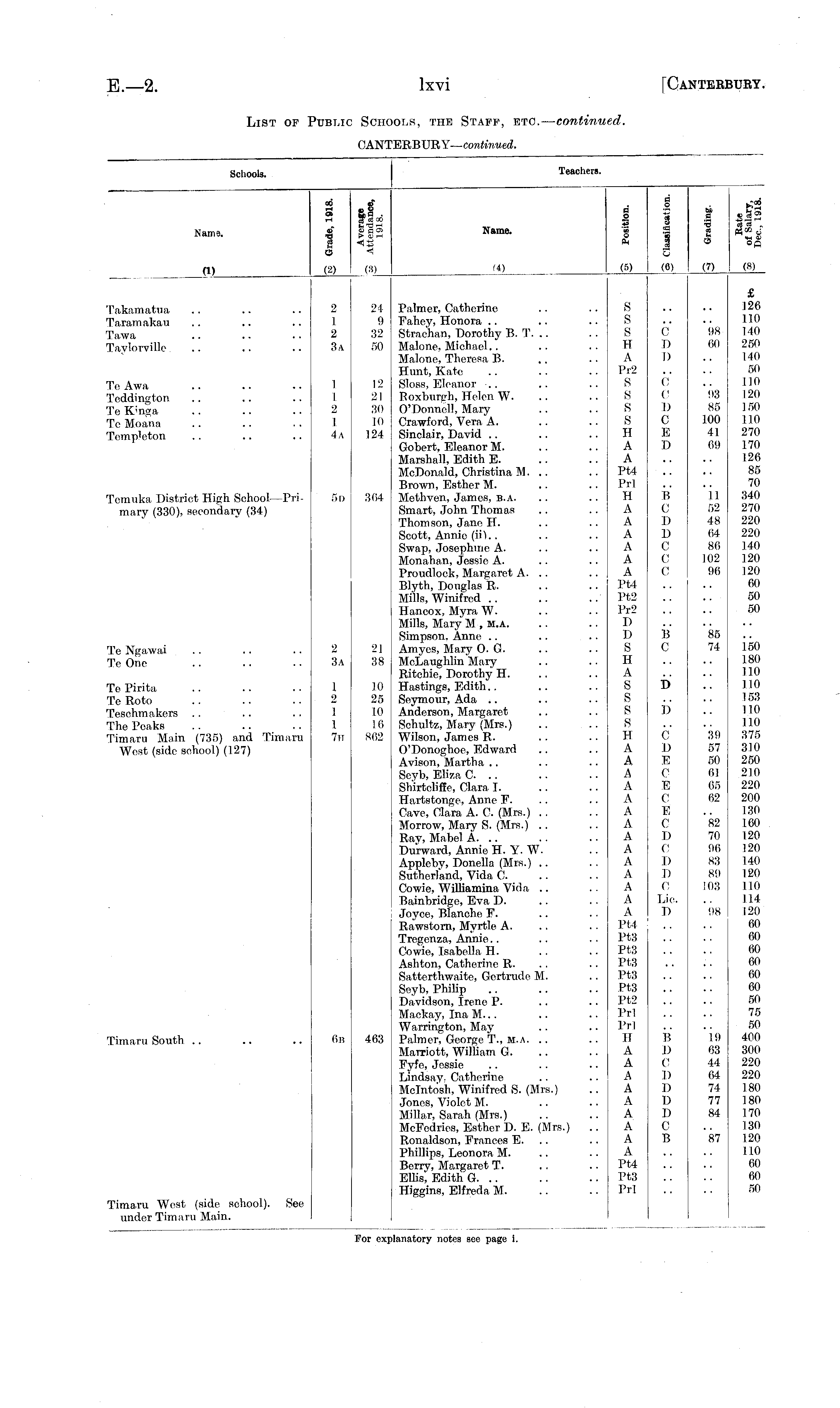 Schools. Teachers. Name. 00 S> 2 9 sra«5 <D rH 0> > VrH Name. d o te o Ph (5) © 1 <a 1 o <6) C_> s '■3 <3 (7) a_S (8) _0s__ _A 3 __ (4) (2) Takamatua Taramakau Tawa Tay lorville Te Awa Toddington To Kinga Te Moana Tomp'eton 2 1 2 3 a 1 1 2 1 4a 24 9 32 50 12 21 30 10 124 Palmer, Catherine Fahey, Honora Straehan, Dorothy B. T. Malone, Michael.. Malone, Theresa B. Hunt, Kate Sloss, Eleanor Roxburgh, Helen W. O'Donnoll, Mary Crawford, Vera A. Sinclair, David Gobert, Eleanor M. Marshall, Edith E. McDonald, Christina M. .. Brown, Esther M. Methven, James, b.a. Smart, John Thomas Thomson, Jane H. Scott, Annie (iii.. Swap, Josephine A. Monahan, Jessie A. Proudlock, Margaret A. .. Blyth, Douglas R. Mills, Winifred Hancox, Myra W. Mills, Mary M , M.A. Simpson, Anne Amycs, Mary O. G. McLaughlin Mary Ritchie, Dorothy H. Hastings, Edith.. Seymour, Ada Anderson, Margaret Schultz, Mary (Mrs.) Wilson, James R. O'Donoghoe, Edward Avison, Martha Scyb, Eliza C. .. Shirteliffe, Clara I. Hartstonge, Anne F. Cave, Clara A. C. (Mrs.) Morrow, Mary S. (Mrs.) Ray, Mabel A. .. Durward, Annie H. Y. W. Appleby, Donella (Mrs.) Sutherland, Vida C. Cowie, Williamina Vida Bainbridge, Eva D. Joyce, Blanche F. Rawstorn, Myrtle A. Tregenza, Annie Cowie, Isabella II. Ashton, Catherine R. Satterthwaite, Gertrude M. Seyb, Philip Davidson, Trc.no P. Mackay, Ina M... Warrington, May Palmer, George T., m.a. Marriott, William G. Fyfo, Jessie Lindsay. Catherine Mcintosh, Winifred S. (Mrs.) Jones, Violet M. Millar, Sarah (Mrs.) McFedries, Esther D. E. (Mrs.) .. Ronaldson, Frances E. .. Phillips, Leonora M. Berry, Margaret T. Ellis', Edith G. .. Higgins, Elfreda M. S S s H A Pr2 s s s s H A A Pt4 Prl H A A A A A A Pt4 Pt2 Pr2 I) I) S II A S s s s H A A A A A A A A A A A A A A Pt4 Pt3 Pt3 Pt,3 Pt3 Pt3 Pt2 Prl Prl II A A A A A A A A A Pt4 Pt3 Prl c D D C 0 I) c 10 I) 98 60 93 85 100 41 69 £ 126 110 140 250 140 50 110 120 150 110 270 170 126 85 70 340 270 220 220 140 120 120 60 50 50 Temuka District High School—Primary (330), secondary (34) 5 n 364 B c D D C c c 11 52 48 64 86 102 96 Te Ngawai Te One B c 85 74 150 180 1.10 110 153 110 110 375 310 250 210 220 200 130 160 120 120 140 120 110 114 120 60 60 60 60 60 60 50 75 50 400 300 220 220 180 180 170 130 120 110 60 60 50 2 3a 21 38 Te Pirita Te Roto Tesehmakers The Peaks Timaru Main (735) and Timaru West (side school) (127) 1 2 7h 10 25 10 16 862 b b c D E 0 E C E C 1) c I) I) c Lie. D 39 57 50 61 65 62 82 70 96 S3 89 103 98 Timaru South (in 463 B 1) C I) D D D C B 19 63 44 64 74 77 84 Tima.ru West (side school), under Timaru Main. See 87 ilanatory notes see page i. For ex]