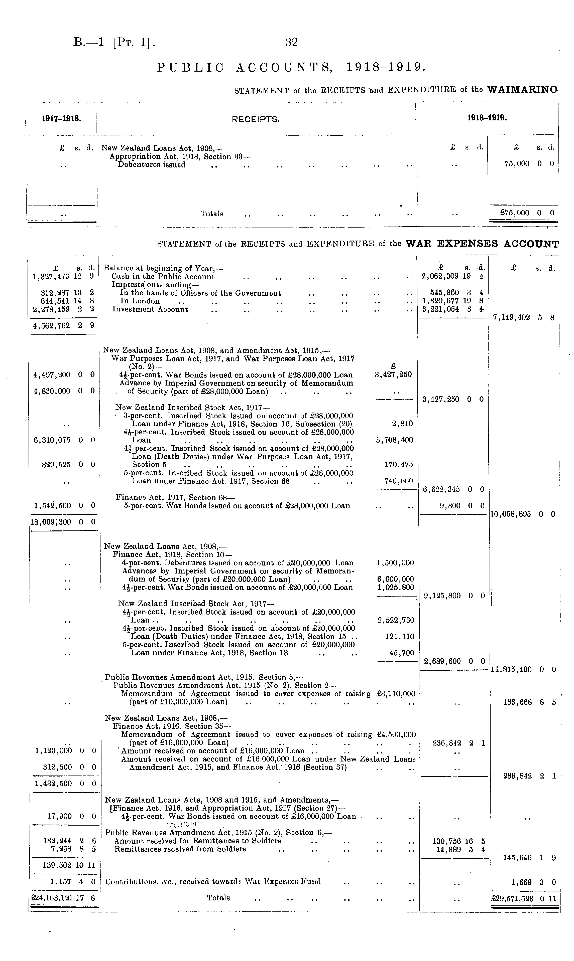 1917-1918. RECEIPTS. 1918 1919. £ s. d. New Zealand Loans Act, 1908, — Appropriation Act, 1918, Section 33— Debentures issued £ s. d. £ s. d. 75,000 0 0 £75,000 0 0 Totals STATEMENT of the RECEIPTS and EXPENDITURE of the WAR AR EXPENSI , E2 XP] ens: IS ACCOUNT £ s. d. 1,327,473 12 9 312,287 13 2 644,541 14 8 2,278,459 2 2 £ s. d. Balance at beginning of Year, — 1,327,473 12 9 Cash in the Public Account .. .. .. .. .. •• 2,0 Imprests'outstanding— 312,287 13 2 In the hands of Officers of the Government .. .. .. .. 5 644,54114 8 In London .. .. .. .. .. .. .. .. 1,8 2,278,459 2 2 Investment Account .. .. .. .. .. .. ..3,2 4,562,762 2 9 £ s. d. 2,062,309 19 4 545,360 3 4 1,320,677 19 8 3,221,054 3 4 £ 062, £ 545, £ 320,6 221,( 309 360 677 054 s. d. 19 4 3 4 19 8 3 4 £ s. d. 7,149,402 5 8 4,562,762 2 9 -, —, New Zealand Loans Act, 1908, and Amendmont Act, 1915, — War Purposes Loan Aot, 1917, and War Purposes Loan Act, 1917 (No. 2) - £ 4,497,200 0 0 4J-per-oent. War Bonds issued on account of £28,000,000 Loan 3,427,250 Advance by Imperial Government on seourity of Memorandum 4,830,000 0 0 of Security (part of £28,000,000 Loan) 4,497,200 0 0 4,830,000 0 0 3,427,250 0 0 3,4 6,310,075 0 0 New Zealand Inscribed Stock Aot, 1917 — ■ 3-per-cent. Inscribed Stook issued on account of £28,000,000 Loan under Finance Act, 1918, Section 16, Subseotion (20) 2,810 Inscribed Stook issued on account of £28,000,000 6,310,075 0 0 "Loan .. .. .. .. .. .. 5,708,400 41-por-cent. Inscribed Stook issued on aocount of £28,000,000 Loan (Death Dutios) under War Purposes Loan Act, 1917, 829,525 0 0 Section 5 .. .. .. .. .. .. 170,475 5-per-cent. Insoribod Stook issued on account of £28,000,000 Loan under Finanoe Act, 1917, Seotion 68 .. .. 740,660 829,525 0 0 6,f 6,622,345 0 0 622,; 345 1,542,500 0 0 Finance Act, 1917, Section 68— 1,542,500 0 0 5-per-cent. War Bonds issued on account of £28,000,000 Loan 18,009,300 0 0 9,800 0 0 9,: ,300 i 0 0 10,058,895 0 0 8,009,300 0 0 New Zealand Loans Aot, 1908, — Finance Aot, 1918, Section 10— 4-per-oent. Debentures issued on account of £20,000,000 Loan 1,500,000 Advances by Imperial Government on security of Memorandum of Security (part of £20,000,000 Loan) .. .. 6,600,000 4J-per-cent. War Bonds issued on aocount of £20,000,000 Loan 1,025,800 ; 9,: Now Zealand Inscribed Stock Aot, 1917 — 4J-per-oent. Inscribed Stock issued on account of £20,000,000 Loan.. .. .. .. .. .. .. 2,522,730 4J-per-cent. Inscribed Stook issued on aocount of £20,000,000 Loan (Death Duties) under Finance Act, 1918, Section 15 .. 121,170 5-per-cent. Inscribed Stock issued on account of £20,000,000 Loan under Finance Act, 1918, Section 13 .. .. 45,700 2,( 9,125,800 0 0 125,1 689, ,800 ,600 I 0 0 l 0 0 2,689,600 0 0 Publio Revenues Amendment Act, 1915, Section 5, — Public Revenues Amendment Act, 1915 (No. 2), Seotion 2— Memorandum of Agreement issued to cover expenses of raising £3,110,000 (part of £10,000,000 Loan) 11,815,400 0 0 163,668 8 5 New Zealand Loans Act, 1908, — Finance Act, 1916, Section 35 — Memorandum of Agreement issuod to covor expenses of raising £4,500,000 (part of £16,000,000 Loan) .. .. .. .. .. .. ! 1,120,000 0 0 Amount received on account of £16,000,000 Loan .. Amount received on account of £16,000,000 Loan under New Zealand Loans 312,500 0 0 Amendment Act, 1915, and Finance Act,' 1916 (Section 37) 1.432.500 0 0 1,120,000 0 0 236, 236,842 2 ,842 ! 2 1 1 312,500 0 0 ±, idfa, ouu u u New Zealand Loans Acts, 1908 and 1915, and Amendments, — [Finance Aot, 1916, and Appropriation Act, 1917 (Section 27) — 17,900 0 0 4J-por-eent. War Bonds issued on account of £16,000,000 Loan '/liV'fe''"'' Public Revenues Amendment Act, 1915 (No. 2), Section 6, — 132,244 2 6 Amount received for Remittances to Soldiers 7,258 8 5 Remittances received from Soldiers iBQjsna m n 1,432,500 0 0 130, 14, ,756 ,889 i 16 5 I 5 4 236,842 2 1 17,900 0 0 132,244 2 6 7,258 8 5 130,756 16 5 14,889 5 4 145,646 1 9 139,502 10 11 139,1)0.2 10 11 1,157 1 0 Contributions, &c, received towards War Expenses Fund 1,669 3 0 1,157 1 0 £24,163,12117 8 Totals 324,163,121 17 8 £29,571,523 0 11