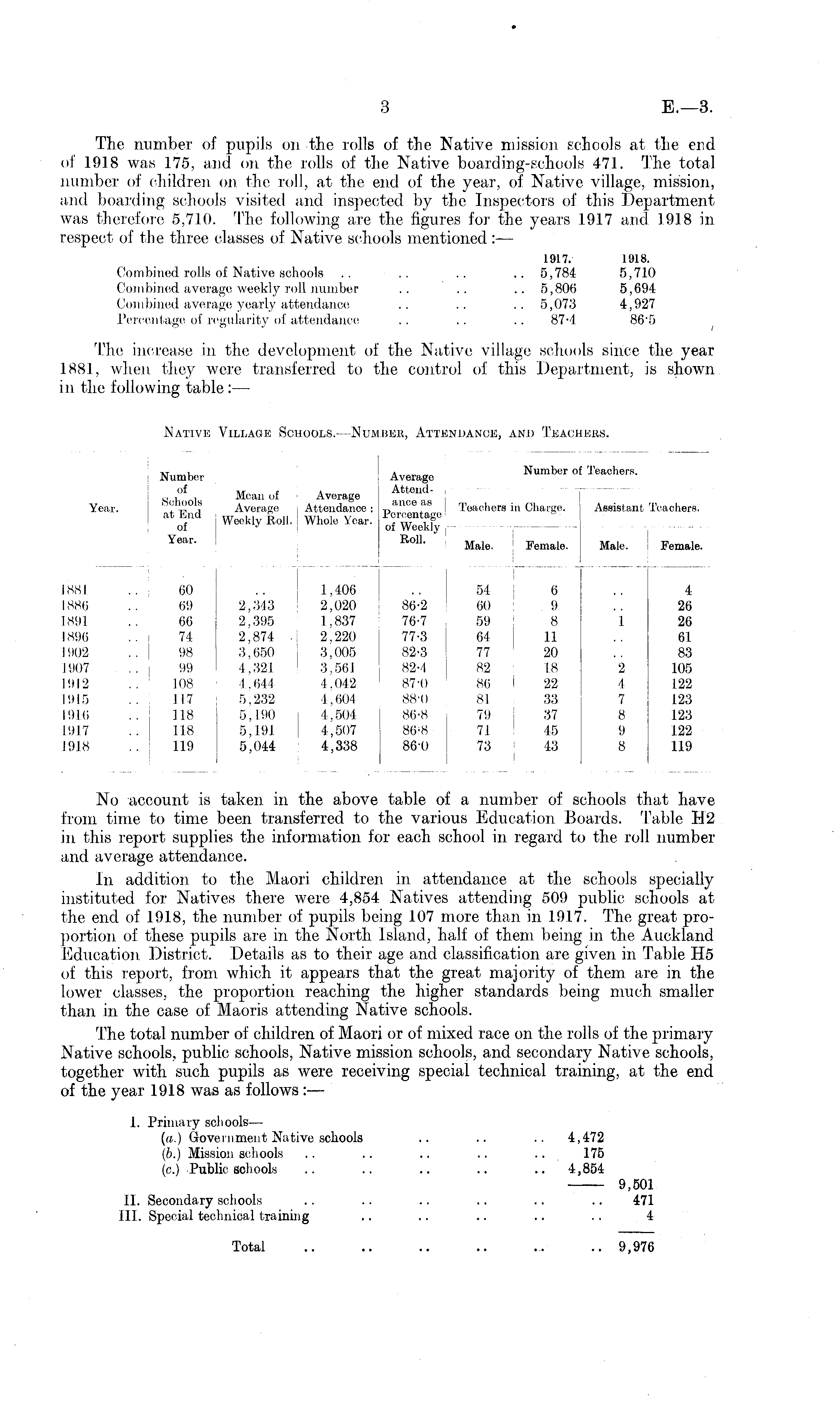 The number of pupils on the rolls of the Native mission schools at the end of 1918 was 175, and on the rolls of the Native boarding-schools 471. The total number of children on the roll, at the end of the year, of Native village, mission, and boarding schools visited and inspected by the Inspectors of this Department was therefore 5,710. The following are the figures for the years 1917 and 1918 in respect of the three classes of Native schools mentioned :— 1917. 1918. Combined rolls of Native schools .. .. .. .. 5,784 5,710 Combined average weekly roll number .. .. .. 5,806 5,694 Combined average yearly attendance .. .. .. 5,073 4,927 Percentage of regularity of attendance . . .. .. 87-4 865 The increase in the development of the Native village schools since the year 1881, when they were transferred to the control of this Department, is shown in the following table: —