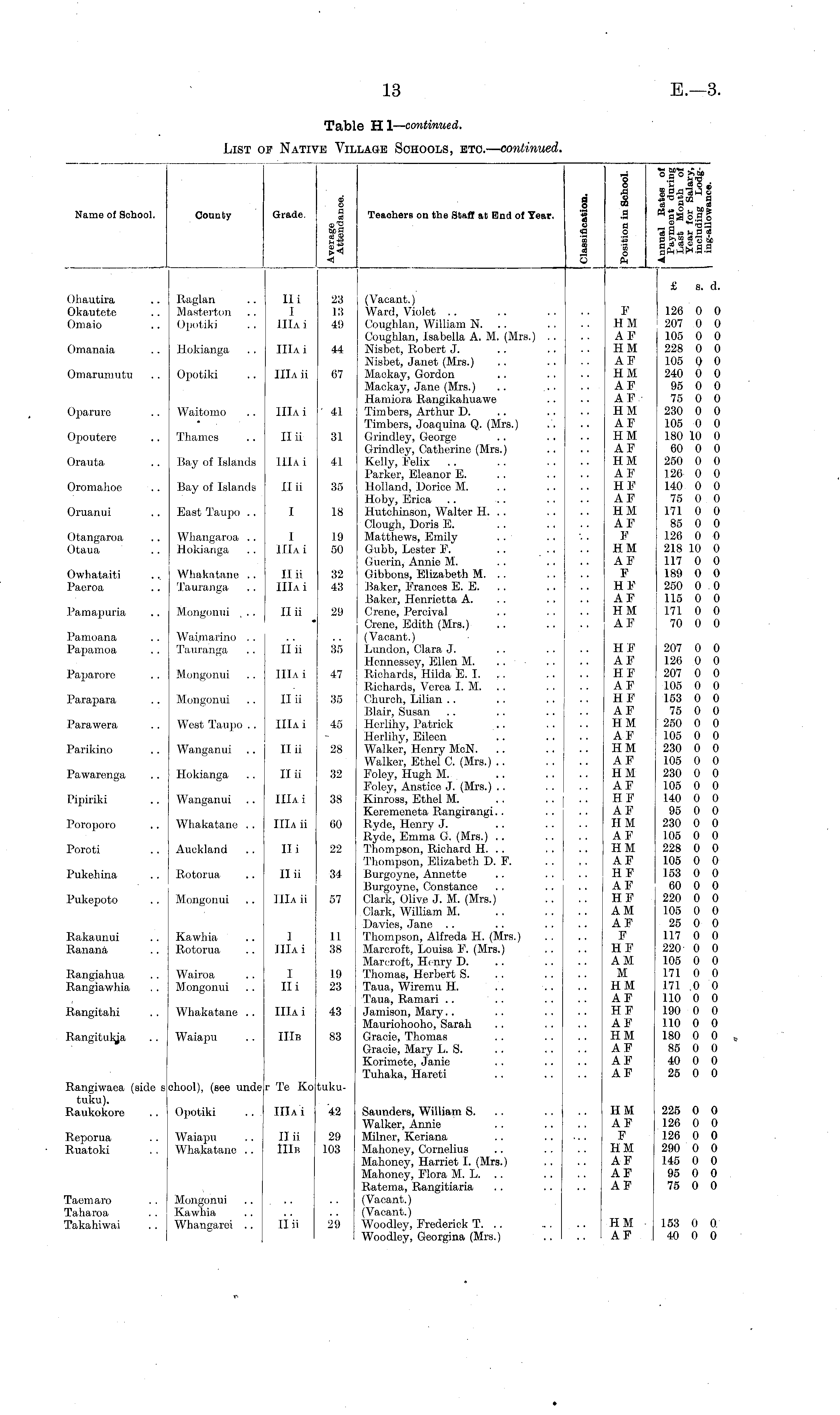 Name of School. County Grade. CO o a is rl-g Teachers on the Staff at End of Tear. a o a a S H o o o a o on a a o in O ft_ "iisft r-d " H ' S - d$ 0 4= h 3 ca a r>> CD aj T! fU aPniJrH.S.- ■« £ s. d. Ohautira Okautete Omaio Omanaia Omarunrutu Oparuro Opoutere Orauta Raglan Masterton Opotiki Hokianga Opotiki Waitomo Thames Bay of Islands Hi I IIlAi IIlAi IIIa ii IIlAi II ii IIIa i 23 13 49 44 67 41 31 41. (Vacant.) Ward, Violet Coughlan, William N. Coughlan, Isabella A. M. (Mrs.) . . Nisbet, Robert J. Nisbet, Janet (Mrs.) Mackay, Gordon Mackay, Jane (Mrs.) Hamiora Rangikahuawe Timbers, Arthur D. Timbers, Joaquina Q. (Mrs.) Grindley, George Grindley, Catherine (Mrs.) Kelly, Felix Parker, Eleanor E. Holland, Dorice M. Ho by, Erica Hutchinson, Walter H. . . Clough, Doris E. Matthews, Emily Gubb, Lester F. . . Guerin, Annie M. Gibbons, Elizabeth M. . . Baker, Frances E. E. Ba Isci-, Henrietta A. Crene, Pcrcival Crene, Edith (Mrs.) (Vacant.) Lundon, Clara J. Hennessey, Ellen M. Richards, Hilda E. I. Richards, Veroa I. M. . . Church, Lilian Blair, Susan Herlihy, Patrick Herlihy, Eileen Walker, Henry McN. Walker, Ethel C. (Mrs.) Foley, Hugh M. Foley, Anstice J. (Mrs.) Kinross, Ethel M. Keremeneta Rangirangi Ryde, Henry J. Ryde, Emma G. (Mrs.) Thompson, Richard H. .. Thompson, Elizabeth D. F. Burgoyne, Annette Burgoyne, Constance Clark, Olive J. M. (Mrs.) Clark, William M. Davies, Jane Thompson, Alfreda H. (Mrs.) Marcroft, Louisa F. (Mrs.) Marcroft, Henry D. Thomas, Herbert S. Taua, Wiremu H. Taua, Ramari .. Jamison, Mary.. Mauriohooho, Sarah Gracie, Thomas Gracie, Mary L. S. Korimete, Janie Tulraka, Hareti F HM AF HM AF HM AF AFHM AF HM AF HM AF HF AF HM AF F HM AF F II IAF HM AF 126 0 0 207 0 0 105 0 0 228 0 0 105 0 0 240 0 0 95 0 0 75 0 0 230 0 0 105 0 0 180 10 0 60 0 0 250 0 0 126 0 0 140 0 0 75 0 0 171 0 0 85 0 0 126 0 0 218 10 0 117 0 0 189 0 0 250 0 0 115 0 0 171 0 0 70 0 0 Oromahoe Bay of Islands II ii 35 Oruanrri East Taupo .. I 18 Otangaroa Otaua Whangaroa . . Hokianga I IIlAi 19 50 Owhataiti Paeroa Whakatane .. Tauranga II ii IIlAi 32 43 Pamapuria Mongonui . .. II ii 29 Parnoana Papamoa Waimarino . . Tauranga II ii 35 HF AF HF AF HF AF HM AF HM AF HM AF HF AF HM AF HM AF HF AF HF AM AF F II F AM M HM AF HF AF HM AF AF AF 207 0 0 126 0 0 207 0 0 105 0 0 153 0 0 75 0 0 250 0 0 105 0 0 230 0 0 105 0 0 230 0 0 105 0 0 140 0 0 95 0 0 230 0 0 105 0 0 228 0 0 105 0 0 153 0 0 60 0 0 220 0 0 105 0 0 25 0 0 117 0 0 220 0 0 105 0 0 171 0 0 171 ,0 0 110 0 0 190 0 0 110 0 0 180 0 0 85 0 0 40 0 0 25 0 0 Paparore Mongonui IIlAi 47 Parapara Mongonui II ii 35 Parawera West Taupo .. IIIa i 45 Parikino Wanganui II ii 28 Pawarenga Hokianga II ii 32 Pipiriki Wanganui IIlAi 38 Poroporo Whakatane .. IIIa ii 60 Poroti Auckland Hi 22 Pukehina Rotorua II ii 34 Pukepoto Mongonui IIIa ii 57 Rakaunui Ranana Kawhia Rotorua 1 IIlAi 11 38 Rangiahua Rangiawhia Wairoa Mongonui I Hi 19 23 Rangitahi Whakatane . . IIlAi 43 Rangitukja Waiapu IIIb 83 Rangiwaea (side s tuku). Raukokore ohool), (see unde r Te Ko tukuReporua Ruatoki Opotiki .. . Waiapu Whakatane . . IIIai II ii IIIb 42 29 103 Saunders, William S. Walker, Annie Milner, Keriana Mahoney, Cornelius Mahoney, Harriet I. (Mrs.) Mahoney, Flora M. L. .. Ratema, Rangitiaria (Vacant.) (Vacant.) Woodlcy, Frederick T. Woodloy, Georgina (Mrs.) HM AF F HM AF AF AF 225 0 0 126 0 0 126 0 0 290 0 0 145 0 0 95 0 0 75 0 0 Taemaro Taharoa Takahiwai Mongonui Kawhia Whangarei .. II ii 29 HM AF 153 0 0 40 0 0