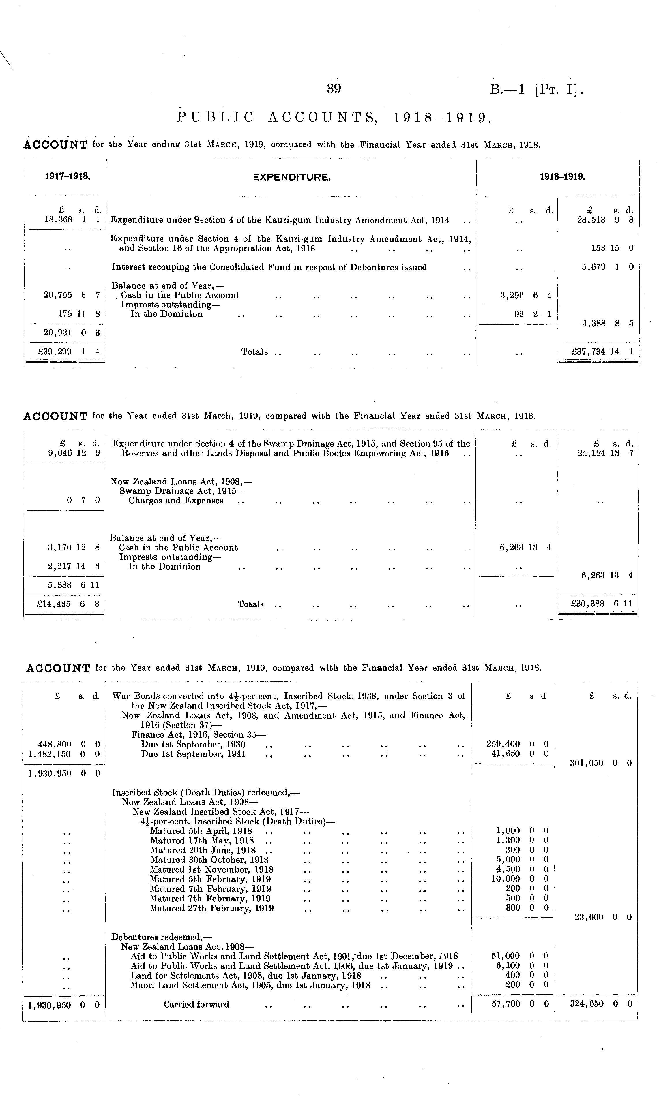 """ " """"" | 1917-1918. EXPENDITURE. 1918-1919. 1918-1919. £ s. d. : £ s. d. £ s. d. 18,368 1 1 | Expenditure under Section 4 of the Kauri-gum Industry Amendment Act, 1914 .. .. 28,513 9 8 £ s. d. £ s. d. 28,513 9 8 .... Expenditure under Section 4 of the Kauri-gum Industry Amendment Act, 1914, and Section 16 of the Appropriation Aot, 1918 .. .. .. .. .. 153 15 0 153 15 0 Interest recouping the Consolidated Fund in respoot of Debentures issued .. .. 5,679 1 0 5,679 1 0 Balance at end of Year, — 20,755 8 7 | , Cash in the Public Account .. .. .. .. .. .. 3,296 6 4 Imprests outstanding— 175 11 8 i In the Dominion .. .. .. .. .. .. .. 92 2 1 . ! a ass a fi 3,296 6 4 92 2 1 . ! 3,388 8 o 20,931 0 3 3,388 8 5 £39,299 1 4 Totals .. .. .. .. .. .. .. £37,734 14 1 £37,734 14 1 ACCOUNT for the Year ended 31st Maroh, 1919, compared with the Financial Year ended 31st March, 1918. I £ s. d. Expenditure under Section 4 of the Swamp Drainage Act, 1915, and Seotion 95 of tho £ s. d. £ s. d. 9,046 12 9 ; Rosorves and other Lands Disposal and Public Bodies Empowering AC, 1916 .. .. 24,124 13 7 . New Zealand Loans Act, 1908, — Swamp Drainage Act, 1915— 0 7 0 Charges and Expenses Balance at ond of Year, — 3,170 12 8 Cash in the Public Aooount .. .. .. .. .. .. 6,263 13 4 Imprests outstanding— 2,217 14 3 In the Dominion ' 6,263 13 4 5,388 6 11 £14,435 6 8 Totals .. .. .. .. .. .. .. £30,388 6 11 ACCOUNT for the Year ended 31st March, 1919, oompared with tho Financial Year ended 31st March, 1918. £ s. d. War Bonds converted into 4J-por-cent. Inscribed Stock, 1938, under Section 3 of £ s. d £ s. d. tho New Zealand Inscribed Stock Act, 1917, — New Zealand Loans Act, 1908, and Amendmont Act, 1915, and Finance Act, 1916 (Seotion 37)— Finance Act, 1916, Section 35— 448,800 0 0 Due 1st Septcmbor, 1930 .. .. .. .. .. .. 259,400 0 0 1,482,150 0 0 Due 1st September, 1941 .. .. .. .. .. .. 41,650 0 0 , j 301,050 0 0 1,930,950 0 0 Inscribed Stock (Death Duties) redeemed, —• New Zealand Loans Act, 1908— New Zealand Inscribed Stock Act, 1917— 4|-per-cent. Inscribed Stock (Death Duties) —■ Matured 5th April, 1918 .. .. .. .. .. .. 1,000 I) 0 Matured 17th May, 1918 .. .. .. .. .. .. 1,300 0 0 Ma'ured20th Juno, 1918 .. .. .. .. . ... .. 300 0 0 Matured 30th October, 1918 .. .. .. .. .. 5,000 0 0 Matured 1st November, 1.918 .. .. .. .. ... 4,500 0 0 Matured 5th February, 1919 .. .. .. .. .. 10,000 0 0 Matured 7th February, 1919 .. .. .. .. .. 200 0 0 Matured 7th February, 1919 .. .. .. .. .. 500 0 0 Matured 27th February, 1919 .. .. .. .. .. 800 0 0 — 23,600 0 0 Debentures rodeomod, — Now Zealand Loans Act, 1908 — Aid to Public Works and Land Settlement Act, 1901, due 1st December, 1918 51,000 0 0 Aid to Public Works and Land Settlement Act, 1906, due 1st January, 1919 .. 6,100 I) 0 Land for Settlements Act, 1908, due 1st January, 1918 .. .. .. 400 0 0 Maori Land Settlement Aot, 1905, duo 1st January, 1918 .. .. .. 200 0 0 1,930,950 0 0 Carried forward .. .. .. .. .. .. 57,700 0 0 324,650 0 0 57,700 0 0 324,650 0 0