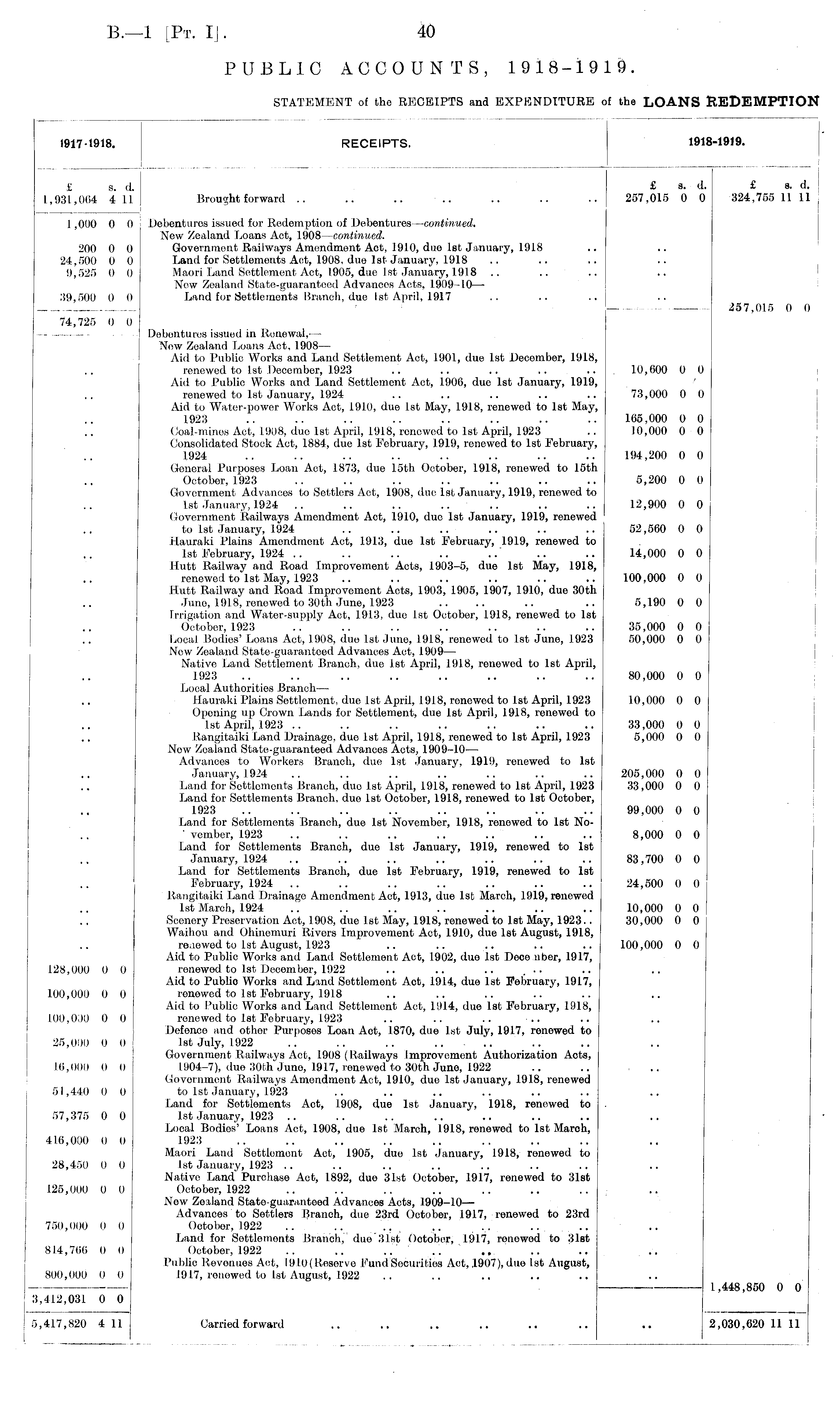 1917-1918. RECEIPTS. 1911 1-1919. £ s. d. 1,931,064 4 11 Brought forward .. .. .. £ s. d. 257,015 0 0 £ s. d. 324,755 11 11 1,000 0 0 200 0 0 24,500 0 0 9,525 0 0 Debentures issued for Redemption of Debentures -continued. New Zealand Loans Act, 1908 — continued. Government Railways Amendment Act, 1910, due 1st January, 1918 Land for Settlements Act, 1908, due 1st January, 1918 Maori Land Settlement Act, 1905, due 1st January, 1.918 Now Zoaland State-guaranteed Advances Acts, 1909-10 — Land for Settlements Branch, due 1st April, 1917 39,500 0 0 257,015 0 0 74,725 0 0 Debentures issued in Renewal, — Now Zealand Loans Act, 1908 — Aid to Public Works and Land Settlement Act, 1901, due 1st December, 1918, renewed to 1st December, 1.923 Aid to Public Works and Land Settlement Act, 1906, due 1st January, 1919, renewed to 1st January, 1.924 Aid to Water-power Works Act, 1910, due 1st May, 1918, renewed to 1st May, 1923 Coal-mines Act, 1908, duo 1st April, 1918, renewed to 1st April, 1923 Consolidated Stock Act, 1884, due 1st February, 1.919, renewed to 1st February, 1924 General Purposes Loan Aot, 1873, due 15th October, 1918, renewed to 15th October, 1923 Government Advances to Settlers Act, 1908, due 1st January, 1919, renewed to 1st January, 1924 .. .. .. Government Railways Amendment Act, 1910, due 1st January, 1919, renewed to 1st January, 1924 Hauraki Plains Amondment Act, 1913, due 1st February, 1919, renewed to 1st February, 1924 Hutt Railway and Road Improvement Acts, 1903-5, due 1st May, 1918, renewed to 1st May, 1923 Hutt Railway and Road Improvement Acts, 1903, 1905, 1907, 1910, due 30th Juno, 1918, renewed to 30th June, 1923 Irrigation and Water-supply Act, 1.913, due 1st October, 1918, renewed to 1st October, 1923 Local Bodies' Loans Act, 1908, due 1st June, 1.918, renowod to 1st June, 1923 New Zealand State-guaranteed Advances Act, 1909— Native Land Settlement Branch, due 1st April, 1918, renewed to 1st April, 1923 Local Authorities Branch— Hauraki Plains Settlement, due 1st April, 1918, renewed to 1st April, 1923 Opening up Crown Lands for Settlement, due 1st April, 1918, renewed to 1st April, 1923 .. Rangitaiki Land Drainage, due 1st April, 1918, renewed to 1st April, 1923 Now Zealand State-guaranteed Advances Acts, 1909-10— Advances to Workers Branch, due 1st January, 1919, renewed to 1st January, 1924 Land for Settlements Branch, duo 1st April, 1918, renewed to 1st April, 1923 Land for Settlements Branch, due 1st October, 1918, renewed to 1st October, 1923 Land for Settlements Branch, due 1st November, 1918, renewed to 1st November, 1923 Land for Settlements Branch, due 1st January, 1919, renewed to 1st January, 1924 Land for Settlements Branch, due 1st February, 1919, renewed to 1st February, 1924 Rangitaiki Land Drainage Amondment Act, 1913, due 1st March, 1919, renewed 1st March, 1924 Scenery Preservation Act, 1908, due 1st May, 1918, ronewed to 1st May, 1923.. Waihou and Ohinemuri Rivers Improvement Act, 1910, due 1st August, 1918, renewed to 1st August, 1923 Aid to Public Works and Land Sottlomont Act, 1902, due 1st Dece nber, 1917, renewed to 1st December, 1922 .. .. .. ... Aid to Publio Works and Land Settlement Aot, 1914, due 1st February, 191.7, renewed to 1st February, 1918 Aid to Public Works and Land Settlement Act, 1914, due 1st February, 1918, ronewed to 1st February, 1923 Defence and other Purposes Loan Act, 1870, due 1st July, 1917, renewed to 1st July, 1922 .. .. .. .... Government Railways Act, 1908 (Railways Improvement Authorization Acts, 1904-7), due 30th' Juno, 1917, renewed to 30th Juno, 1922 Govornment Railways Amendment Act, 1910, due 1st January, 1918, renewed to 1st January, 1923 Land for Settlements Act, 1908, due 1st January, 1918, renewed to 1st January, 1923 Local Bodies' Loans Act, 1908, due 1st March, 1918, renewed to 1st Maroh, 1923 Maori Land Settlement Act, 1905, due 1st January, 1918, renewed to 1st January, 1923 .. Native Land Purchase Act, 1892, duo 31st October, 1917, renewed to 31st October, 1922 Now Zoaland State-guaranteed Advances Acts, 1909-10 — Advances to Settlers Branch, due 23rd October, 1917, ronewed to 23rd Octobor, 1922 .. .. .. ,. . . .... Land for Settlements Branch, due '31st October, 1917, renewed to 31st October, 1922 .. .. .-, .. .. Public Revenues Act, l910(Roserve Fund Securities Act, 1907), due 1st August, 1917, renewed to 1st August, 1922 10,600 0 0 73,000 0 0 165,000 0 0 10,000 0 0 194,200 0 0 5,200 0 0 12,900 0 0 52,560 0 0 14,000 0 0 100,000 0 0 5,190 0 0 35,000 0 0 50,000 0 0 I 80,000 0 0 10,000 0 0 33,000 0 0 5,000 0 0 205,000 0 0 33,000 0 0 99,000 0 0 8,000 0 0 I 83,700 0 0 24,500 0 0 10,000 0 0 30,000 0 0 .100,000 0 0 128,000 0 0 100,000 0 0 ioo,o;io o o 25,000 0 0 16,001) 0 0 51,440 0 0 57,375 0 0 416,000 0 0 28,450 0 0 125,000 0 0 750,000 0 0 814,766 0 I) 800,000 0 0 3,412,031 0 0 1,448,850 0 0 5,417,820 4 11 Carriod forward 2,030,620 11 11