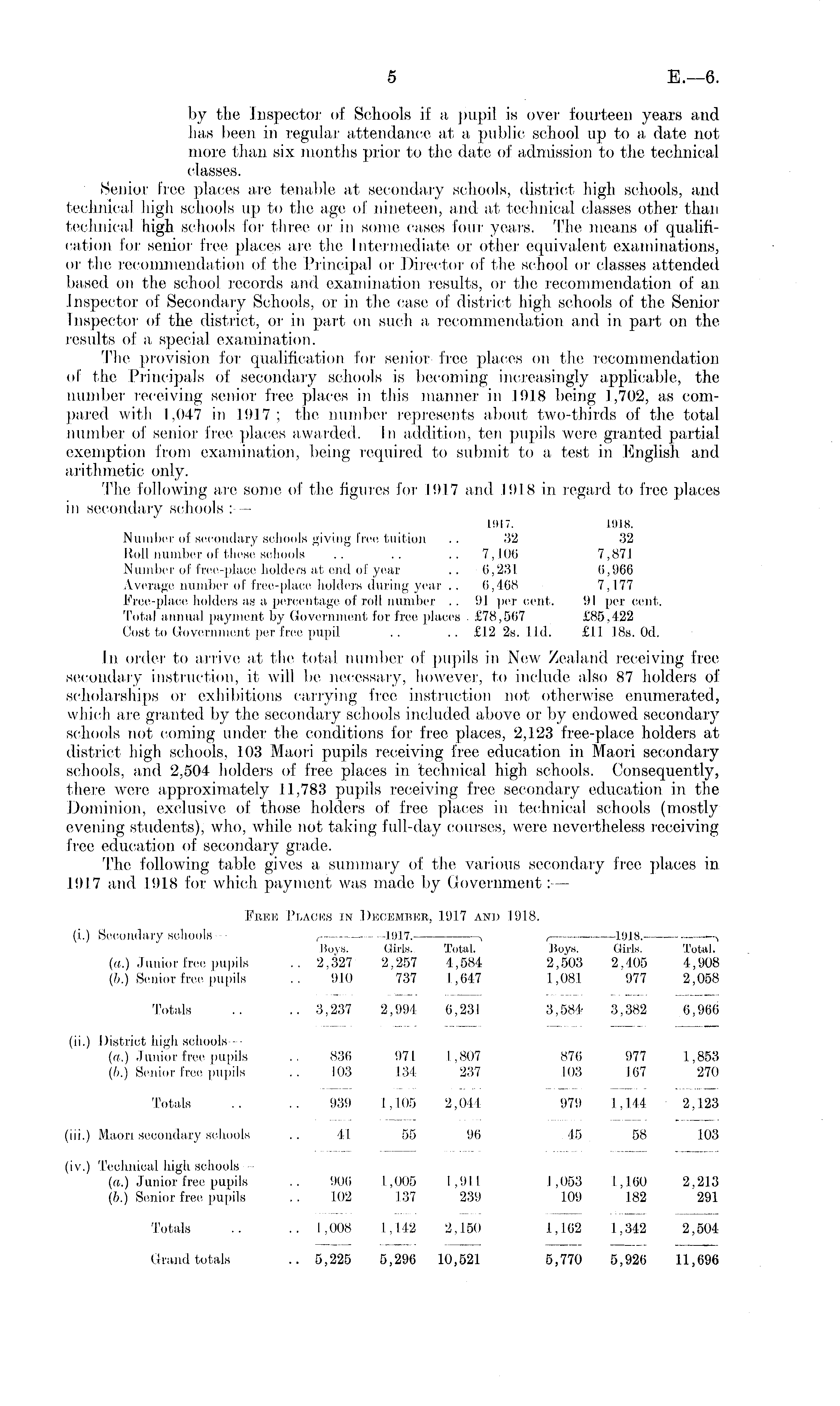 by the Inspector of Schools if a pupil is over fourteen years and has been in regular attendance at a public school up to a date not more than six months prior to the date of admission to the technical classes. Senior free places are tenable at secondary schools, district high schools, and technical high schools up to the age of nineteen, and at technical classes other than technical high schools for three or in some cases four years. The means of qualification for senior free places are the Intermediate or other equivalent examinations, or the recommendation of the Principal or Director of the school or classes attended based on the school records and examination results, or the recommendation of an Inspector of Secondary Schools, or in the case of district high schools of the Senior Inspector of the district, or in part on such a, recommendation and in part on the results of a, special examination. The provision for qualification for senior free places on the recommendation of the Principals of secondary schools is becoming increasingly applicable, the number receiving senior free places in this manner in 1918 being 1,702, as compared with 1,047 in 1917; the number represents about two-thirds of the total number of senior free places awarded. In addition, ten pupils were granted partial exemption from examination, being required to submit to a test in English and arithmetic only. The following are some of the figures for 1917 and 1918 in regard to free places in secondary schools : — 1.917. 1918. Number of secondary schools giving free tuition .. 32 32 Roll number of these schools .. .. .. 7,106 7,871 Number of free-place holders at end of year .. 6,231 (i,966 Average number of free-place holders during year .. 6,468 7,177 Free-place holders as a percentage of roll number .. 91 percent. 91 percent. Total annual payment by Government for free places £78,567 £85,422 Cost to Government per free pupil .. .. £12 2s. lid. £11 18s. od. In order to arrive at the total number of pupils in New Zealand receiving free secondary instruction, it will be necessary, however, to include also 87 holders of scholarships or exhibitions carrying free, instruction not otherwise enumerated, which are granted by the secondary schools included above or by endowed secondary schools not coming under the conditions for free places, 2,123 free-place holders at district high schools, 103 Maori pupils receiving free education in Maori secondary schools, and 2,504 holders of free places in technical high schools. Consequently, there were approximately 1.1,783 pupils receiving free secondary education in the Dominion, exclusive of those holders of free places in technical schools (mostly evening students), who, while not taking full-day courses, were nevertheless receiving free education of secondary grade. The following table gives a summary of the various secondary free places in 1917 and 1918 for which payment was made by Government:— Free Places in December, 1917 and 1918. (i.) Secondary schools , 1917. , c 1918. —. -^ Boys. Girls. Total. Boys. Girls. Total. (a.) Junior free pupils .. 2,327 2.257 4,584 2,503 2.405 4,908 (6.) Senior free pupils .. 910 737 1,647 1,081 977 2,058 Totals .. .. 3,237 2,994 6,231 3,584- 3,382 6,966 (ii.) District high schools (a.) Junior free pupils .. 836 971 1.807 876 977 1,853 (6.) Senior free pupils .. 103 134 237 103 107 270 Totals .. .. 939 1,105 2,044 979 1,144 2.123 (iii.) Maori secondary schools .. 41 55 96 45 58 103 (iv.) Technical high schools— (a.) Junior free pupils .. 906 1,005 1.911 1.053 1.160 2,213 (6.) Senior free pupils .. 102 137 239 109 182 291 Totals .. .. 1,008 1.112 2,-150 1,162 1,342 2,504 Grand totals .. 5,225 5,296 10,521 5,770 5,926 11,696