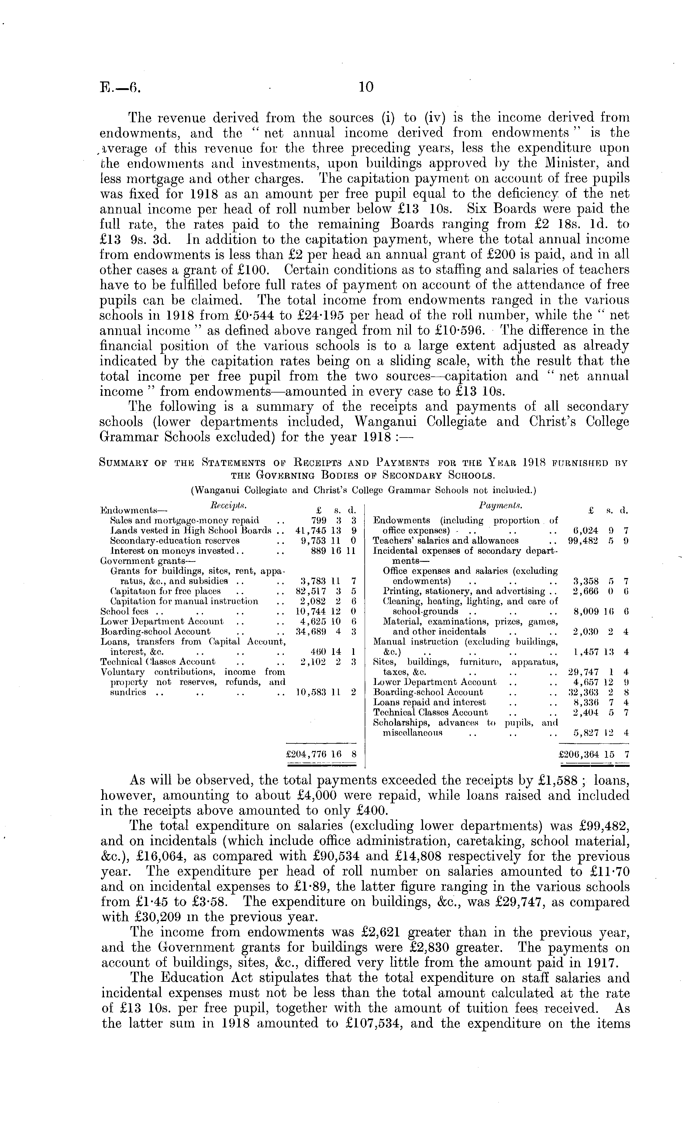 The revenue derived from the sources (i) to (iv) is the income derived from endowments, and the " net annual income derived from endowments " is the , iverage of this revenue for the three preceding years, less the expenditure upon the endowments and investments, upon buildings approved by the Minister, and less mortgage and other charges. The capitation payment on account of free pupils was fixed for 1918 as an amount per free pupil equal to the deficiency of the net annual income per head of roll number below £13 10s. Six Boards were paid the full rate, the rates paid to the remaining Boards ranging from £2 18s. Id. to £13 9s. 3d. In addition to the capitation payment, where the total annual income from endowments is less than £2 per head an annual grant of £200 is paid, and in all other cases a grant of £.100. Certain conditions as to staffing and salaries of teachers have to be fulfilled before full rates of payment on account of the attendance of free pupils can be claimed. The total income from endowments ranged in the various schools in 1918 from £0-544 to £24-195 per head of the roll number, while the " net annual income "as defined above ranged from nil to £10-596. The difference in the financial position of the various schools is to a large extent adjusted as already indicated by the capitation rates being on a sliding scale, with the result that the total income per free pupil from the two sources —capitation and " net annual income " from endowments —amounted in every case to £13 10s. The following is a summary of the receipts and payments of all secondary schools (lower departments included, Wanganui Collegiate and Christ's College Grammar Schools excluded) for the year 1918 : — Summary of the Statements oi? Receipts and Payments for the Year 1918 furnished by the Governing Bodies of Secondary Schools. (Wanganui Collegiate and Christ's College Grammar Schools not included.) ~ , , Receipts. ~ , Payments. ~ , Endowments— r £ s. d. J £ s. d. Sales and mortgage-money repaid .. 799 3 3 Endowments (including proportion of Lands vested in High School Boards .. 41,745 13 9 office expenses) .. .. .. 0,024 9 7 Secondary-education reserves .. 9,753 11 0 Teachers'salaries and allowances .. 99,482 5 9 Interest on moneys invested.. .. 889 16 11 Incidental expenses of secondary departGovernment grants — ments — Grants for buildings, sites, rent, appa- Office expenses and salaries (excluding ratus, &c, and subsidies .. .. 3,783 11 7 endowments) .. .. .. 3,358 5 7 Capitation for free places .. .. 82,517 3 5 Printing, stationery, and advertising .. 2,666 0 (i Capitation for manual instruction .. 2,082 2 ti Cleaning, heating, lighting, and care of School fees .. .. .. .. 10,744 12 0 school-grounds .. .. .. 8,009 Hi li Lower Department Account .. .. 4,625 10 6 Material, examinations, prizes, games, Boarding-school Account .. .. 34,689 4 3 and other incidentals .. .. 2,030 2 4 Loans, transfers from Capital Account, Manual instruction (excluding buildings, interest, &c. .. .. .. 460 14 1 &o.) .. .. .. .. 1,457 13 4 Technical ('lasses Account .. .. 2,102 2 3 Sites, buildings, furniture, apparatus, Voluntary contributions, income from taxes, &o. .. .. .. 29,747 1 4 property not reserves, refunds, and Lower Department Account .. .. 4,657 12 9 sundries .. .. .. .. 10,583 11 2 Boarding-school Account .. .. 32,303 2 8 Loans repaid and interest .. .. 8,336 7 4 Tochnical Classes Account .. 2,404 5 7 Scholarships, advances to pupils, and miscellaneous .. .. .. 5,827 12 4 £204,776 16 8 £206,364 15 7 As will be observed, the total payments exceeded the receipts by £1,588 ; loans, however, amounting to about £4,000 were repaid, while loans raised and included in the receipts above amounted to only £400. The total expenditure on salaries (excluding lower departments) was £99,482, and on incidentals (which include office administration, caretaking, school material, &c), £16,064, as compared with £90,534 and £14,808 respectively for the previous year. The expenditure per head of roll number on salaries amounted to £11-70 and on incidental expenses to £1-89, the latter figure ranging in the various schools from £1-45 to £3-58. The expenditure on buildings, &c, was £29,747, as compared with £30,209 m the previous year. The income from endowments was £2,621 greater than in the previous year, and the Government grants for buildings were £2,830 greater. The payments on account of buildings, sites, &c, differed very little from the amount paid in 1917. The Education Act stipulates that the total expenditure on staff salaries and incidental expenses must not be less than the total amount calculated at the rate of £13 10s. per free pupil, together with the amount of tuition fees received. As the latter sum in 1918 amounted to £107,534, and the expenditure on the items