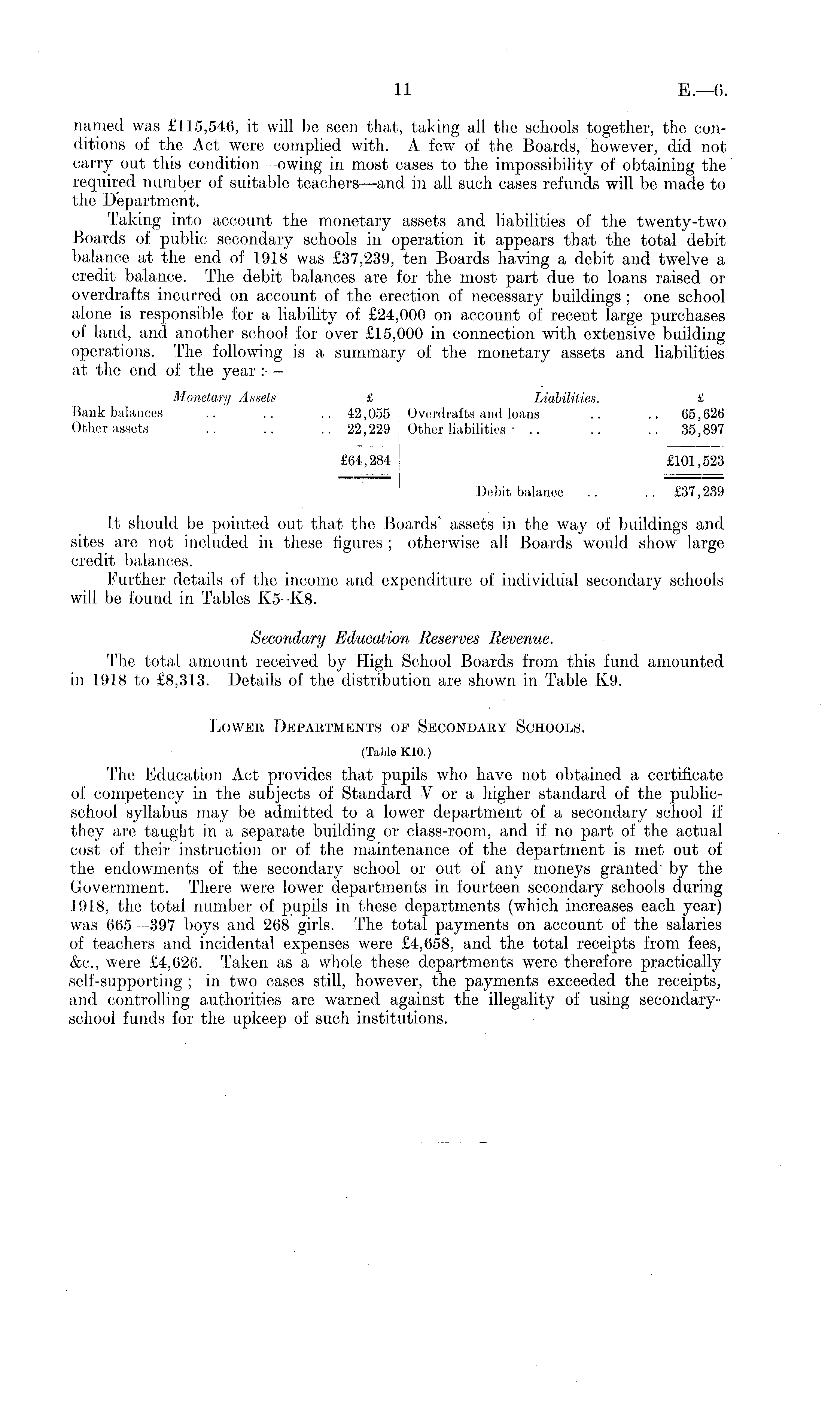 named was £115,546, it will be seen that, taking all the schools together, the conditions of the Act were complied with. A few of the Boards, however, did not carry out this condition —owing in most cases to the impossibility of obtaining the required number of suitable teachers—and in all such cases refunds will be made to the Department. Taking into account the monetary assets and liabilities of the twenty-two Boards of public secondary schools in operation it appears that the total debit balance at the end of 1918 was £37,239, ten Boards having a debit and twelve a credit balance. The debit balances are for the most part due to loans raised or overdrafts incurred on account of the erection of necessary buildings ; one school alone is responsible for a liability of £24,000 on account of recent large purchases of land, and another school for over £15,000 in connection with extensive building operations. The following is a summary of the monetary assets and liabilities at the end of the year : — Monetary Assets £ Liabilities. £ Bank balances .. .. .. 42,055 I Overdrafts and loans .. .. 65,626 Other assets .. .. ... 22,229 Other liabilities •.. .. .. 35,897 £64,284 £101,523 Debit balance .. .. £37,239 It should be pointed out that the Boards' assets in the way of buildings and sites are not included in these figures ; otherwise all Boards would show large credit balances. Further details of the income and expenditure of individual secondary schools will be found in Tables K5-KB. Secondary Education Reserves Revenue. The total amount received by High School Boards from this fund amounted in 1918 to £8,313. Details of the distribution are shown in Table K9. Lower Departments of Secondary Schools. (Table K10.) The Education Act provides that pupils who have not obtained a certificate of competency in the subjects of Standard V or a higher standard of the publicschool syllabus may be admitted to a lower department of a secondary school if they are taught in a separate building or class-room, and if no part of the actual cost of their instruction or of the maintenance of the department is met out of the endowments of the secondary school or out of any moneys granted' by the Government. There were lower departments in fourteen secondary schools during 1918, the total number of pupils in these departments (which increases each year) was 665 —397 boys and 268 girls. The total payments on account of the salaries of teachers and incidental expenses were £4,658, and the total receipts from fees, &c, were £4,626. Taken, as a whole these departments were therefore practically self-supporting ; in two cases still, however, the payments exceeded the receipts, and controlling authorities are warned against the illegality of using secondaryschool funds for the upkeep of such institutions.