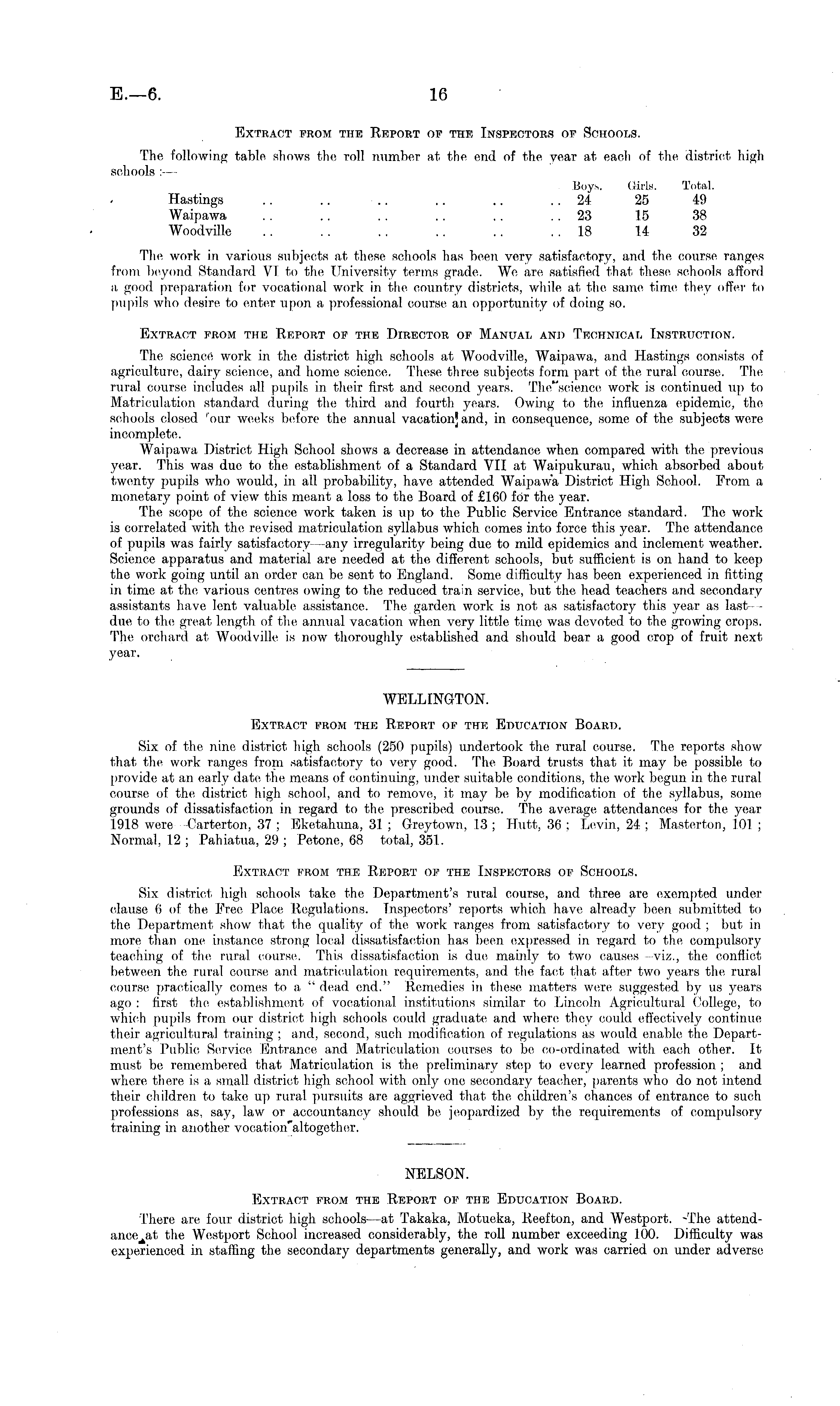Extract from the Report of the Inspectors of Schools. The following table shows the roll number at the end of the year at each of the district high schools :— Boys. Girls. Total. Hastings .. .. .. .. .. .. 24 25 49 Waipawa .. .. .. .. .. .. 23 15 38 Woodville .. .. .. .. .. .. 18 14 32 The work in various subjects at these schools has been very satisfactory, and the, course ranges from beyond Standard VI to the University terms grade. We are satisfied that these schools afford a good preparation for vocational work in the country districts, while at the same time they offer to pupils who desire to enter upon a professional course an opportunity of doing so. Extract from the Report of the Director of Manual and Technical Instruction. The science work in the district high schools at Woodville, Waipawa, and Hastings consists of agriculture, dairy science, and home science. These three subjects form part of the rural course. The rural course includes all pupils in their first and second years. Tho"seience work is continued up to Matriculation standard during the third and fourth years. Owing to the influenza epidemic, the schools closed 'our weeks before the annual vacation] and, in consequence, some of the subjects were incomplete. Waipawa District High School shows a decrease in attendance when compared with the previous year. This was due to the establishment of a Standard VII at Waipukurau, which absorbed about twenty pupils who would, in all probability, have attended Waipawa District High School. From a monetary point of view this meant a loss to the Board of £160 for the year. The scope of the science work taken is up to the Public Service Entrance standard. The work is correlated with the revised matriculation syllabus which comes into force this year. The attendance of pupils was fairly satisfactory—any irregularity being due to mild epidemics and inclement weather. Science apparatus and material are needed at the, different schools, but sufficient is on hand to keep the work going until an order can be sent to England. Some difficulty has been experienced in fitting in time at the various centres owing to the reduced train service, but the, head teachers and secondary assistants have lent valuable assistance. The garden work is not as satisfactory this year as last- - due to the great length of the annual vacation when very little time was devoted to the growing crops. The orchard at Woodville is now thoroughly established and should bear a good crop of fruit next year. WELLINGTON. Extract from the Report of the Education Board. Six of the nine district high schools (250 pupils) undertook the rural course. The reports show that the work ranges from satisfactory to very good. Tim Board trusts that it may be possible to provide at an early date, the means of continuing, under suitable conditions, the work begun in the rural course of the district high school, and to remove, it may be by modification of the syllabus, some grounds of dissatisfaction in regard to the prescribed course. The average attendances for the year 1918 were -Carterton, 37 ; Eketahuna, 31 ; Greytown, 13 ; Hutt, 30 ; Levin, 24 ; Masterton, 101 ; Normal, 12 ; Pahiatua, 29 ; Petone, 68 total, 351. Extract from the Report of the Inspectors of Schools. Six district high schools take the Department's rural course, and three are exempted under clause 6 of the Free Place Regulations. Inspectors' reports which have already been submitted to the Department show that the quality of the work ranges from satisfactory to very good ; but in more than one instance strong local dissatisfaction has been expressed in regard to the compulsory teaching of the rural course. This dissatisfaction is due mainly to two causes viz., the conflict between the rural course and matriculation requirements, and the fact that after two years the, rural course practically comes to a " dead end." Remedies in these matters were, suggested by us years ago : first the establishment of vocational institutions similar to Lincoln Agricultural College, to which pupils from our district high schools could graduate and wfiere they could effectively continue their agricultural training ; and, second, such modification of regulations as would enable the Department's Public Service Entrance and Matriculation courses to be co-ordinated with each other. It must be remembered that Matriculation is the preliminary step to every learned profession ; and where there is a small district high school with only one secondary teacher, parents who do not intend their children to take up rural pursuits are aggrieved that the, children's chances of entrance to such professions as, say, law or accountancy should be jeopardized by the requirements of compulsory training in another vocation'altogether. NELSON. Extract from the Report of the Education Board. There are four district high schools -at Takaka, Motueka, Reefton, and Westport. -The attendance the Westport School increased considerably, the roll number exceeding 100. Difficulty was experienced in staffing the secondary departments generally, and work was carried on under adverse