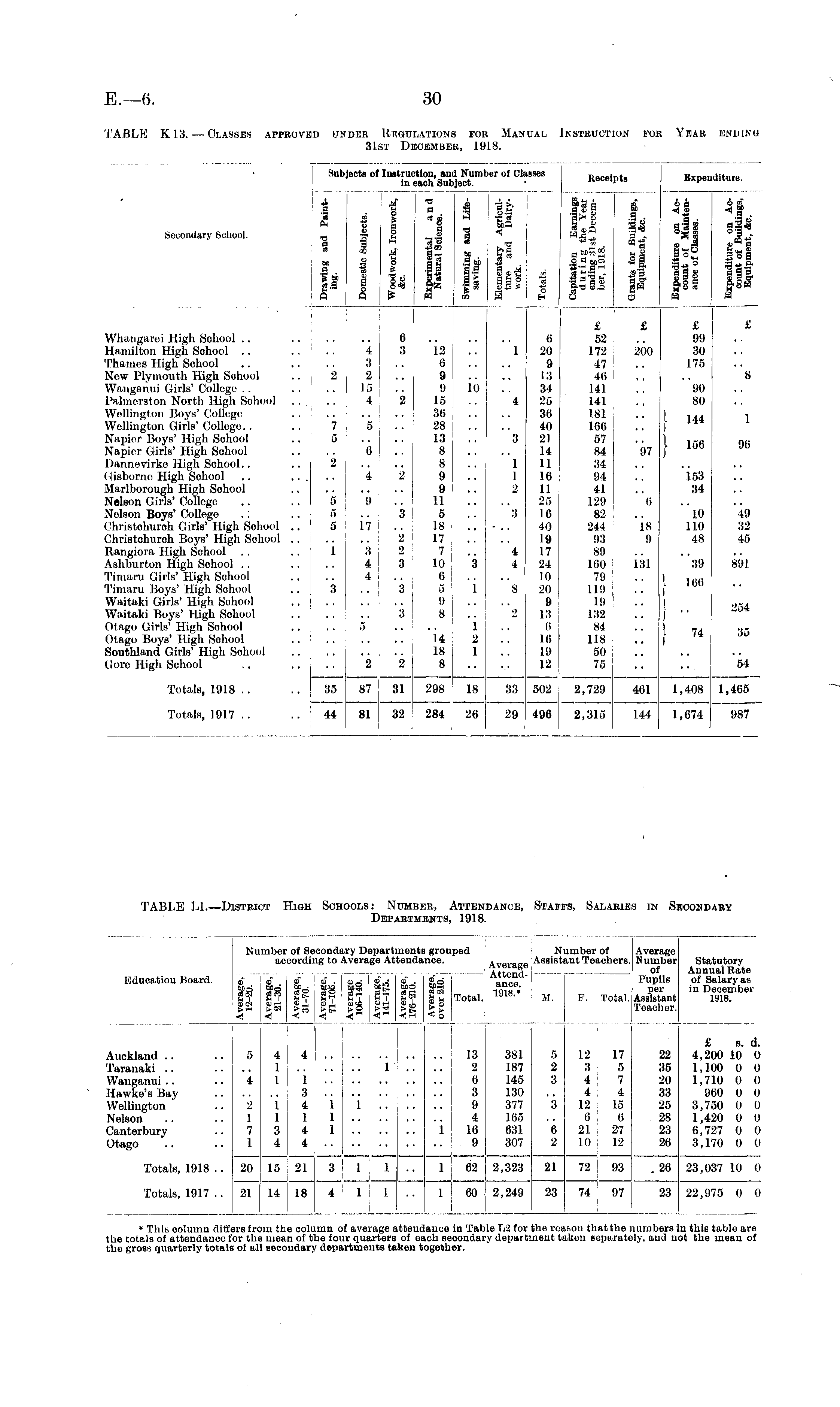 TABLE K13.—Classes approved under Regulations for Manual Instruction for Year ending 31st December, 1918.