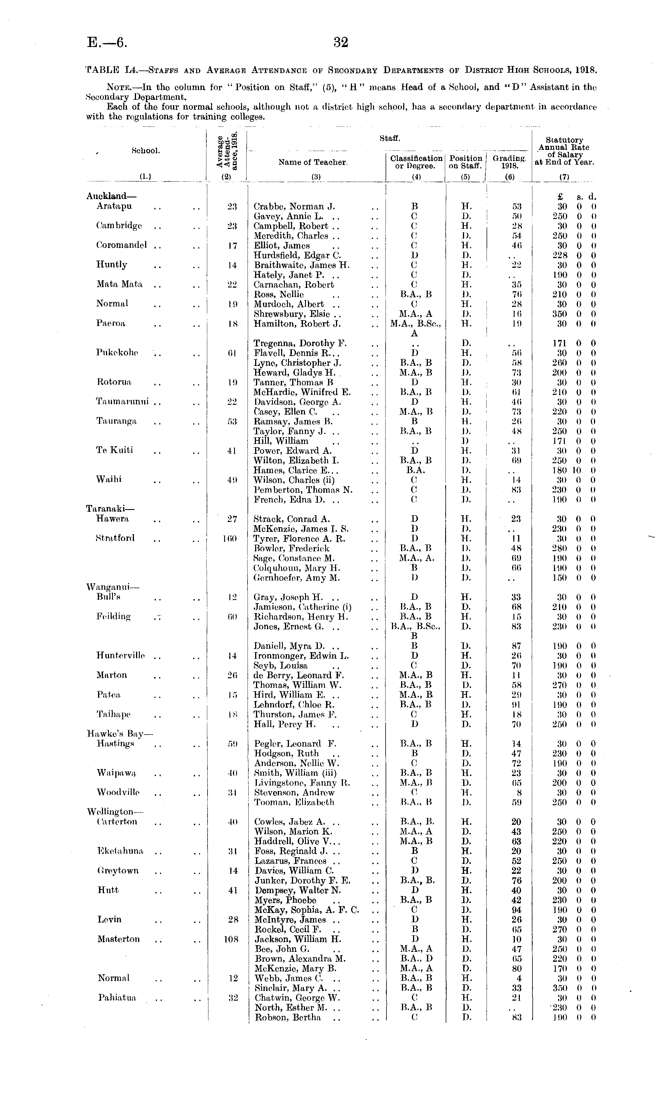 Norn.—In tho column for " Position on Staff," (5), " H " meai Secondary Department. Each of the four normal schools, although not a district high sc with tho regulations for training colleges. ns Head of a School, and "D" 1 ihool, has a secondary departmem in the t in accordance ie School. || g - .§5.a Name of Teacher. Od (2), (3) taff. Classification Position I Grading, or Degree. on Staff. 1918. (4) „ (5) J (6) ! Statutory Annual Bate of Salary at End of Year. (7) Auckland— Aratapu .. .. 23 Crabbe, Norman J. Gavey, Annie L. .. Cambridge .. .. 23 Campbell, Robert .. Moredith, Charles Coromandel .. .. 17 Elliot, James Hurdsfield, Edgar C. Huntly .. .. 14 Braithwaite, James H. Hately, Janet P. .. Mata Mata . . .. 22 Carnaohan, Robert Ross, Nellie Normal .. .. 19 Murdoch, Albert Shrewsbury, Elsie Paeroa .. .. 18 Hamilton, Robert J. B H. 53 C D. 50 C H. 28 C D. 54 0 H. 46 D D. C H. 22 C D. C H. 35 B.A., B I). 76 C H. 28 M.A., A 1). 16 M.A., B.Sc, H. 19 A £ s. d. 30 0 0 250 0 0 30 0 0 250 0 0 30 0 0 228 0 0 30 0 0 190 0 0 30 0 0 210 0 0 30 0 0 350 0 0 30 0 0 Tregenna, Dorothy E. Pukekohe .. .. 61 Flaveil, Dennis R... Lyne, Christopher J. Heward, Gladys H. . Rotorua .. .. 19 Tanner, Thomas B MeHardio, Winifred E. Taumarunui .. .. 22 Davidson, George A. Casey, Ellen C. .. Tauranga .. .. 53 Ramsay, James B. Taylor, Fanny J. .. Hill, William TeKuiti .. ., 41 Power, Edward A. Wilton, Elizabeth I. Hames, Clarice E... Waihi .. .. 49 Wilson, Charles (ii) Pemberton, Thomas N. French, Edna D. .. D. D H. 56 B.A., B D. 58 M.A., B D. 73 D 11. 30 B.A., B D. 61 D H. 46 M.A., B D. 73 B 11. 26 B.A., B I). 48 1) D 11. 31 B.A., B D. 69 B.A. 1). C il. 14 C I). 83 C D. 171 0 0 30 0 0 260 0 0 200 0 II 30 0 0 210 0 0 30 0 0 220 0 0 30 0 0 250 0 0 171 0 0 30 0 0 250 0 0 180 10 0 30 0 0 230 0 0 190 0 0 Taranaki— Hawera .. .. 27 Strack, Conrad A. McKenzie, James I. S. Stratford ,. .. 160 Tyrer, Florence A. R. Bowler, Frederick Sage, Constance M. Colquhoun, Mary H. Gernhoefer, Amy M. Wanganui— Bull's .. .. 12 Gray, Joseph H. .. Jamieson, Catherine (i) Feilding .7 .. 60 Richardson, Henry H. Jones, Ernest Q. ... D II. 23 1) I). 1) 11. 11 B.A., B I). 48 M.A., A. D. 69 B I). 66 I) I). 30 (I 0 230 0 0 30 0 0 280 0 0 190 0 II 190 0 0 150 0 0 Daniell, Myra D. Hunterville .. .. 14 Ironmonger, Edwin L. Seyb, Louisa ., Marton .. .. 26 de Berry, Leonard F. Thomas, William W. Patea. .. .. 15 Hird, William E. Lehndorf, (Ihloe R. Taihape .. .. IK Thurston, James F. Hall, Percy H. Hawke's Bay— Hastings .. .. 59 Pegler, Leonard F. Hodgson, Ruth Anderson, Nellie W. Waipawa .. .. 40 j Smith, William (iii) Livingstone, Fanny it. Woodville .. .. 31 Stevenson, Andrew Tooman, Elizabeth 12 60 14 D H. 33 B.A., B D. 68 B.A., B H. 15 B.A., B.Sc, D. 83 B B D. 87 D H. 26 0 D. 70 M.A., B H. II B.A., B I). 58 M.A., B H. 29 B.A., B I). 91 C H. 18 D D. 70 30 0 0 210 0 0 30 (I 0 230 0 0 190 0 0 30 0 0 190 0 (I 30 0 0 270 0 0 30 0 0 190 0 0 30 0 0 250 0 0 26 15 IK 59 B.A., B H. 14 B D. 47 C D. 72 B.A., B H. 23 M.A., B 1). 65 C 11. 8 B.A., B I). 59 30 0 0 230 0 0 190 0 0 30 0 0 200 0 0 30 0 0 250 0 0 40 31 Wellington— Carterton .. .. 40 Cowles, Jabez A. .. Wilson, Marion K. Haddrell, Olive V... Eketahuna .. .. 31 Fobs, Reginald J. .. Lazarus, Frances Grey town .. .. 14 Davies, William C. Junker, Dorothy F. E. Hutt .. .. 41 Dempsey, Waltor N. Myers, Phoebe McKay, Sophia, A. F. C. Levin .. .. 28 Mclntyre, James Rocke'l, Cecil F. .. Masterton .. .. 108 Jackson, William H. Bee, John G. Brown, Alexandra M. McKenzie, Mary B. Normal .. .. 12 Webb, James C. .. Sinclair, Mary A. .. Pahiatua ,. .. 32 Chatwin, George W. North, Esther M. .. Robson, Bertha 40 B.A., B. H. 20 M.A., A 1). 43 M.A., B D. 63 B H. 20 C D. 52 D H. 22 B.A., B. D. 76 I) H. 40 B.A., B 1). 42 C 1). 94 D H. 26 B .1). 68 D H. 10 M.A., A I). 47 B.A., D I). 65 M.A., A D. 80 B.A., B H. 4 B.A., B D. 33 C H. 21 B.A., B D. C D. 83 30 0 0 250 0 0 220 0 0 30 (I 0 250 0 0 30 (I 0 200 0 0 30 0 0 230 0 0 190 0 0 30 0 0 270 0 0 30 0 0 250 0 I) 220 0 0 170 (1 0 30 0 0 350 0 0 30 0 0 '230 0 0 190 0 0 31 14 41 28 108 12 32