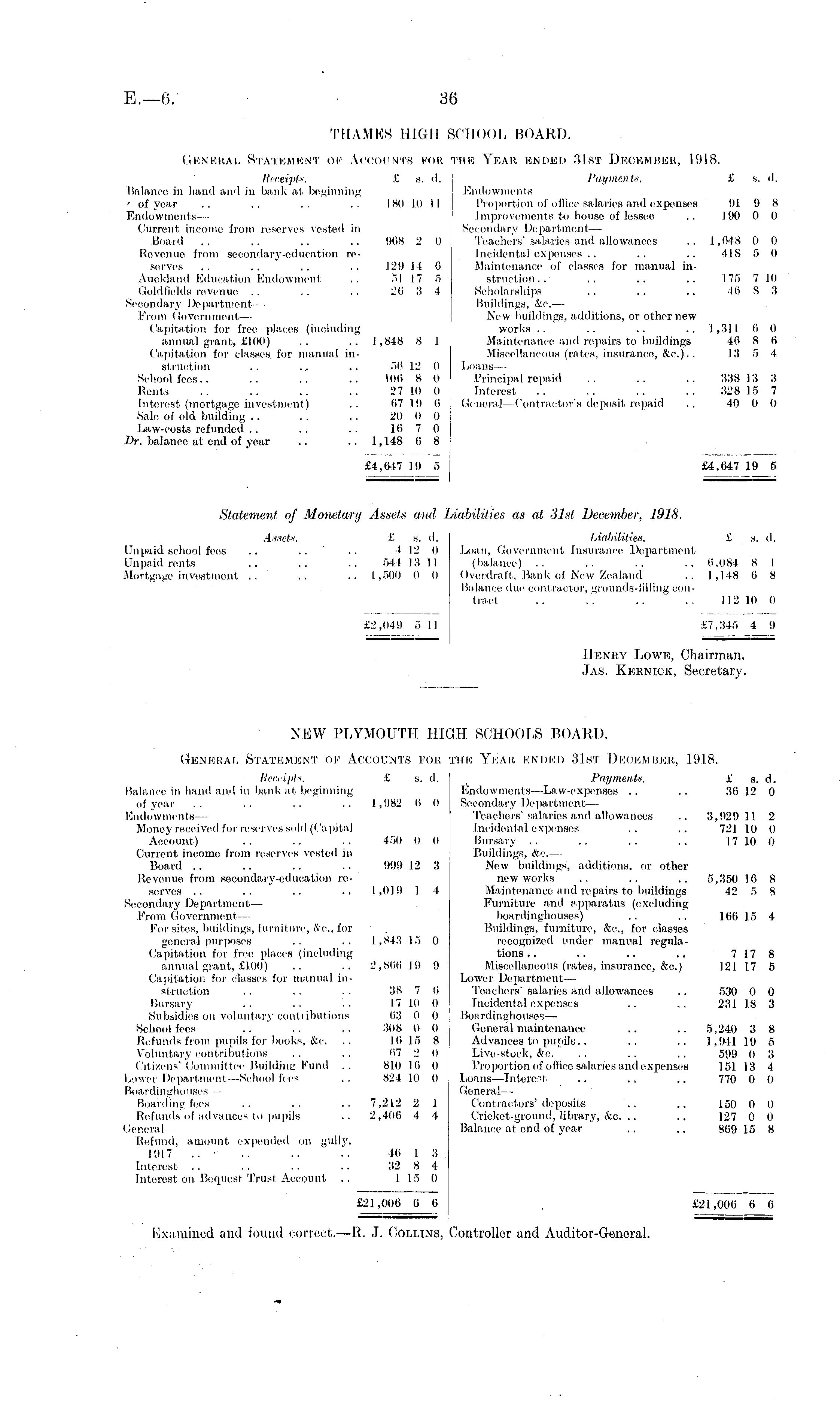 THAMES HIGH SCHOOL BOARD. General Statement of Accounts for the Year ended 31st December, 1918. Receipts, £ s. d. Payments, £ s. d. Balance in hand and in bank at beginning j Endowments— 'of yoar .. .. .. .. Ihoio II ' Proportion of office salaries and expensed 91 9 8 Endowments— Improvements to house of lessee .. 190 0 0 Current income from reserves vested in Secondary Department— Board .. .. .. .. 908 2 0 Teachers' salaries and allowances .. 1,048 0 0 Revenue from secondary-education re- Incidental expenses .. .. .. 418 5 0 serves .. .. .. .. 129 14 6 Maintenance of classes for manual inAuckland Education Endowment .. 51 17 5 struction.. .. .. .. 175 7 10 (loldticlds revenue .. .. .. 20 3 4 Scholarships .. .. .. 10 8 3 Secondary Department— Buildings, &c, — From Government— New buildings, additions, or other new Capitation for free places (including works .. .. .. 1,311' .6 0 annual grant, £100) .. .. 1,848 8 1 Maintenance and repairs to buildings 40 8 6 Capitation for classes, for manual in- Miscellaneous (rates, insurance, &c.).. 13 5 4 struction . . ~ .. 56 12 0 Loans— School fees.. .. .. .. 106 8 0 Principal repaid .. .. .. 338 13 3 Rents .. .. .. .. 27 10 0 : Interest .. .. .. .. 328 15 7 Interest (mortgage investment) .. 67 19 0 General—Contractor's deposit repaid .. 40 0 0 Sale of old building .. . . .. 20 0 0 Law-costs refunded .. .. .. 16 7 0 Dr. balance at end of year .. .. 1,148 6 8 £4,647 19 5 £4,647 19 6 Statement of Monetary Assets and Liabilities as at 31st December, 1918. Assets, £ s. d. Liabilities. £ s. d. Unpaid school fees .. .. .. 412 0 Loan, Government Insurance Department Unpaid rents .. .. .. 54113 11 (balance) .. .. .. .. 6,084 8 I Mortgage investment .. ' .. .. 1,500 0 0 Overdraft. Bank of New Zealand .. 1,148 0 8 Balance due contractor, grounds-tilling contract .. . . .. .. 112 10 0 £2,049 5 11 £7,345 4 9 Henry Lowe, Chairman. Jas. Kernick, Secretary. NEW PLYMOUTH HIGH SCHOOLS BOAR!). General Statement of Accounts for the Yeah, ended 31st December, 1918. Receipts, £ s. d, Payments. £ s. d. Balance in hand aii'l in bank at beginning Endowments—Law-expenses .. .. 36 12 0 of year .. .. .. .. 1,982 6 0 Secondary I lepartmcnt— Endowments — Teachers'salaries and allowances .. 3,929 11 2 Money received for reserves sold (Capital incidental expenses .. .. 721 10 0 Account) .. .. .. 45(1 0 0 Bursary .. .. .. .. 1,7 10 0 Current income from reserves vested in .Buildings, &c Board .. .. .. .. 999 12 3 New buildings, additions, or other Revenue from secondary-education re- new works .. . . .. 5,350 16 8 serves .. .. .. .. 1,019 1 4 Maintenance and repairs to buildings 42 5 8 Secondary Department— Furniture and apparatus (excluding From Government— boardinghouses) . . .. 166 15 4 For sites, buildings,'furniture, fto., for Buildings, furniture, &0., for classes genera] purposes .. .. 1,843 15 0 recognized under manual regnlaCapitation for free places (including tions.. .. .. .. 7 17 8 annual grant, £100) .. .. 2,860 19 9 Miscellaneous (rates, insurance, &o.) 121 17 5 Capitation for classes for manual in- Lower Department— struction .. .. .. 38 7 0 Teachers' salaries and allowances .. 530 0 0 Bursary .. .. '. ■ 17 10 0 Incidental expenses .. .. 231 18 3 Subsidies on voluntary contributions 63 0 0 Boardinghouses— School fees .. .. .. 308 0 0 General maintenance .. .. 5,240 3 8 Refunds from pupils for books, &c. .. 16 15 8 Advances to pupils.. .. .. 1,941 19 5 Voluntary contributions .. .. 67 2 0 Live-stock, &o. .. .. .. 599 0 3 Citizens' Committee Building Fund .. 810 10 0 Proportion of office salaries and expenses 151 13 4 Lower Department—School fi es .. 824 10 0 Loans—lnterest .. .. .. 770 0 0 Boardinghouses.— General— Boarding fees .. .. .. 7,212 2 1 Contractors' deposits .. .. 150 0 0 Refunds of advances to pupils .. 2,406 4 4 Cricket-ground, library, &c. .. .. 127 0 0 General— Balance at end of year .. .. 869 15 8 Refund, amount expended on gully, 1917 .. ■' .. .. .. 46 I 3 Interest .. .. .. .. 32 8 4 Interest on Bequest Trust Account .. 115 0 £21,006 6 6 £21,006 6 6 Examined and found correct.—R. J. Collins, Controller and Auditor-General.