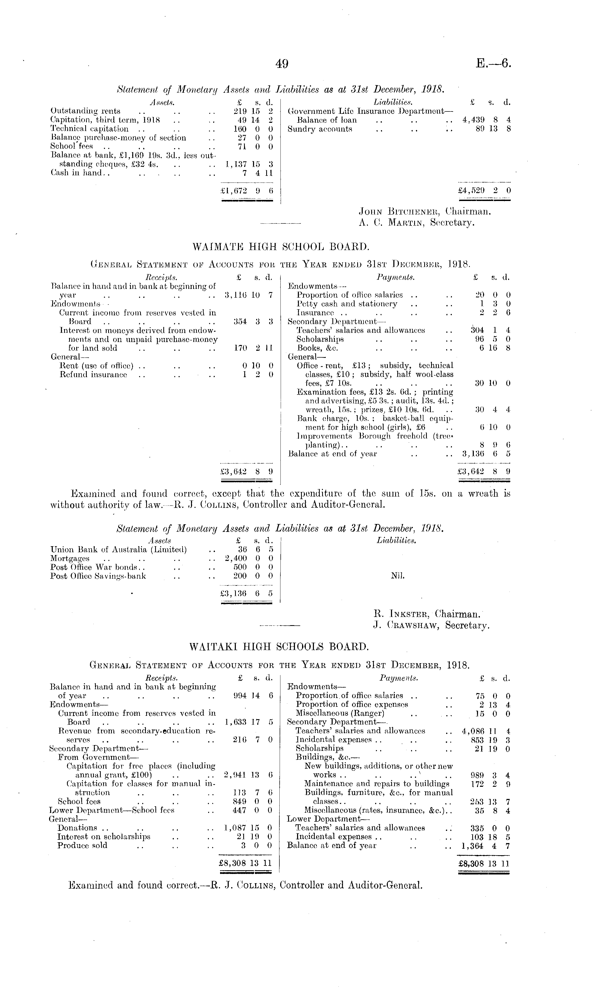 Statement of Monetary Assets and Liabilities as at 31st December, 1918. Assets. £ s. d. Liabilities. £ s. d. Outstanding rents .. . . . . 219 15 2 Government Life Insurance Department— Capitation,"third term, 1918 .. ~ 49 14 2 Balance of loan .. .. .. 4,439 8 4 Technical capitation .. .. .. 160 0 0 Sundry accounts .. .. .. 89 13 8 Balance purchase-money of section . . 27 0 0 School'fees .. ~ ~ .. 71 0 0 Balance at bank, £1,169 1.95. 3d... less outstanding cheques, £32 4s. .. .. 1,137 15 3 Cash in hand.. .. 7 4 11 £1,672 9 6 £4,529 2 0 John Bitchener, Chairman. A. C. Martin, Secretary. W AIM ATE HIGH SCHOOL BOARD. General Statement of Accounts for the Year ended 31st December, 1918. Receipts. £ s. d. Payments. £ s. d. Balance in hand and in bank at beginning of Endowments — year .. .. .. .. 3,110 10 7 Proportion of office salaries .. .. 20 0 0 Endowments— Petty cash and stationery .. .. 13 0 Current income from reserves vested in Insurance .. .. .. .. 2 2 0 Board . . .. .. .. 354 3 3 Secondary Department— Interest on moneys derived from endow- Teachers' salaries and allowances .. 304 1 4 ments and on unpaid purchase-money Scholarships .. .. .. 90 5 0 for land sold .. .. .'. 170 2 1,1 Books, &o. .. .. .. 610 8 General— General— Rent (use of office) .. .. .. 0 10 0 Office - rent, £13; subsidy, technical Refund insurance . . . . .. 12 0 classes, £10 ; subsidy, half wool-class fees, £7 10s. .. .. . . 30 10 0 Examination fees, £13 2s. (id. ; printing and advertising, £5 35.; audit, 13s. 4d.; wreath, 1.55. ; prizes, £10 10s. fid. . . 30 4 4 Bank charge, 10s. ; basket-ball equipment for high school (girls), £6 . . 0 1.0 0 Improvements Borough freehold (tree' planting).. .. .. .. 8 9 0 Balance at end of year .. .. 3,130 0 5 £3,642 8 9 £3,642 8 9 Examined and found correct, except that the expenditure of tho sum of 15s, on a wreath is without authority of law. -R. J. Collins, Controller and Auditor-General. Statement of Monetary Assets and Liabilities as at 31st December, 1918. Assets £ s. d. Liabilities. Union Bank of Australia (Limited) .. 30 6 5 Mortgages .. .. .. .. 2,400 0 0 Post Office War bonds.. .. .. 500 0 0 Post Office Savings-bank ... . , 200 0 0 Nil. £3,136 0 5 R. Inkster, Chairman. J. Crawshaw, Secretary.