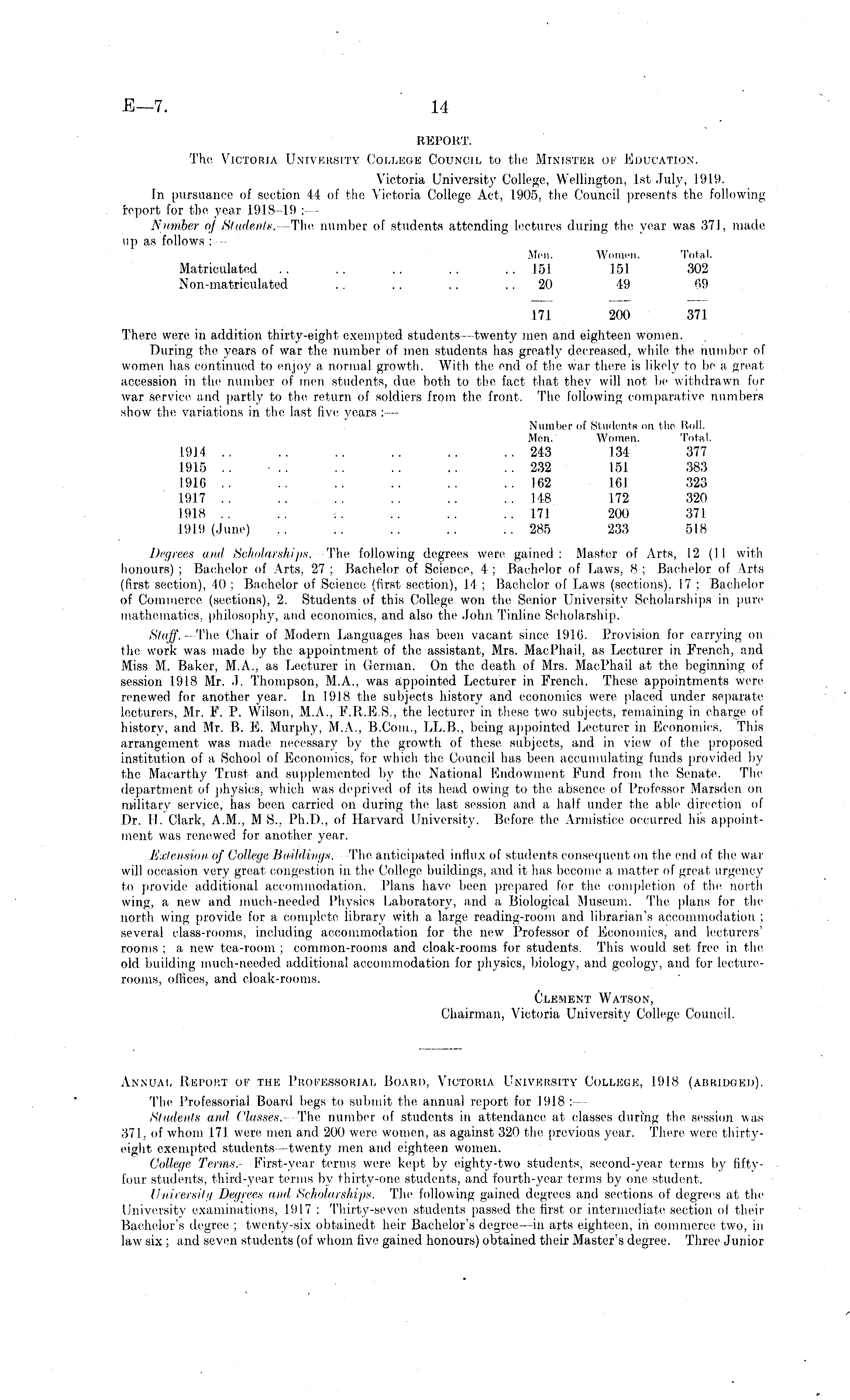 REPORT. The Victoria University College Council to the Minister of Education. Victoria University College, Wellington, Ist July, 1919. In pursuance of section 44 of the Victoria College Act, 1905, the Council presents the following report for the. year 1918-19 :--- Number of Students. —The number of students attending lectures during the year was 371, made up as follows ;— .Men. Women. Total. Matriculated .. .. .. .. ..151 151 302 Non-matriculated .. .. .. .. 20 49 69 171 200 371 There were in addition thirty-eight exempted students- twenty men and eighteen women. During the years of war the number of men students has greatly decreased, while the number of women has continued to enjoy a normal growth. With the end of the war there is likely to be a great accession in the number of men students, due both to the fact that they will not be withdrawn for war service and partly to the return of soldiers from the front, 'flic following comparative numbers show the variations in the last five years :■ — Number of Students on the 8011. .Men. Women. Total. 1.914 ~ .. .. .. .. .. 243 134 377 1915 .. • .. .. .. .. ..232 151 383 1916 .. .. .. .. .. ..162 161 323 1917 .. .. .. .. .. ..148 172 320 1918 .. .. i. .. .. .. 171 200 371 1919 (June) .. .. .. .. ..285 233 518 Degrees and Scholarships. The following degrees were gained: Master of Arts, 12 (11 with honours) ; Bachelor of Arts, 27 ; Bachelor of Science, 4 ; Bachelor of Laws, 8 ; Bachelor of Arts (first section), 40 ; Bachelor of Science (first section), 14 ; Bachelor of Laws (sections). 17 ; Bachelor of Commerce, (sections), 2. Students of this College won the Senior University Scholarships in pure mathematics, philosophy, and economics, and also the John Tinline Scholarship. Staff. —The Chair of Modern Languages has been vacant since 1916. Provision for carrying on the work was made by the appointment of the assistant, Mrs. MaePhail, as Lecturer in French, and Miss M. Baker, M.A., as Lecturer in German. On the death of Mrs. MaePhail at the beginning of session 1918 Mr. ,1. Thompson, M.A.. was appointed Lecturer in French. These appointments were renewed for another year. In 1918 the subjects history and economics were placed under separate lecturers, Mr. F. P. Wilson, M.A., F.R.E.S., the lecturer in these two subjects, remaining in charge of history, and Mr. B. E. Murphy, M.A., B.Cont., LL.B., being appointed Lecturer in Economics. This arrangement was made necessary by the growth of these subjects, and in view of the proposed institution of a School of Economics, for which the. Council has been accumulating funds provided by the Macarthy Trust and supplemented by the National Endowment Fund from the, Senate. The department of physics, which was deprived of its head owing to the, absence, of Professor Marsden on military service, has been carried on during the last session and a half under the able direction of Dr. 11. Clark, A.M., M S.. Ph.D., of Harvard University. Before the Armistice occurred his appointment was renewed for another year. Extension of College, Buildings. The anticipated influx of students consequent on the end of the war will occasion very great congestion in the College buildings, and it has become a matter of great urgency to provide additional accommodation. Plans have been prepared for the completion of the north wing, a new and much-needed Physics Laboratory, and a Biological Museum. The plans for the north wing provide for a complete, library with a large reading-room and librarian's accommodation ; several class-rooms, including accommodation for the new Professor of Economics, and lecturers' rooms ; a new tea-room ; common-rooms and cloak-rooms for students. This would set free in the old building much-needed additional accommodation for physics, biology, and geology, and for lecturerooms, offices, and cloak-rooms. Clement Watson, Chairman, Victoria University College Council. Annual Report of the Professorial Board, Victoria University College, 1918 (abridged). The Professorial Board begs to submit the annual report for 1918 : Students and Classes.--- -The number of students in attendance at classes during the session was 371, of whom 171 were men and 200 were women, as against 320 the previous year. There were thirtyeight exempted students - twenty men and eighteen women. College Terms. First-year terms were kept by eighty-two students, second-year terms by fiftyfour students, third-year terms by thirty-one students, and fourth-year terms by one student. Cnitersili/ Degrees and. Scholarships. The following gained degrees and sections of degrees at the University examinations, 1917 : Thirty-seven students passed the first or intermediate section of their Bachelor's degree ; twenty-six obtainedt heir Bachelor's degree—in arts eighteen, iii commerce, two, in law six ; and seven students (of whom five gained honours) obtained their Master's degree. Three Junior