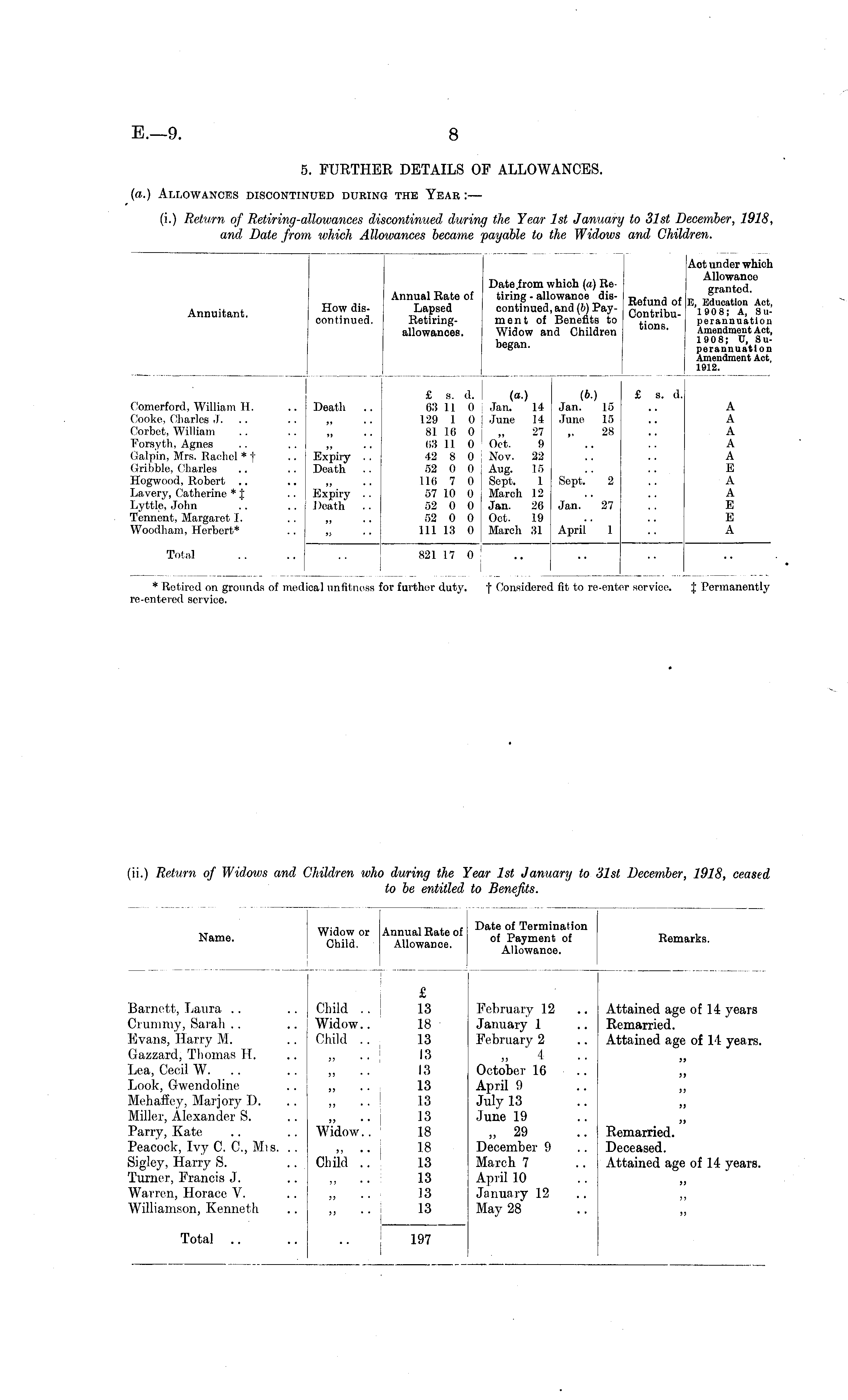 (i.) Return of Retiring-allowances discontinued during the Year 1st January to 31st December, 1918, and Date from which Allowances became payable to the Widows and Children.