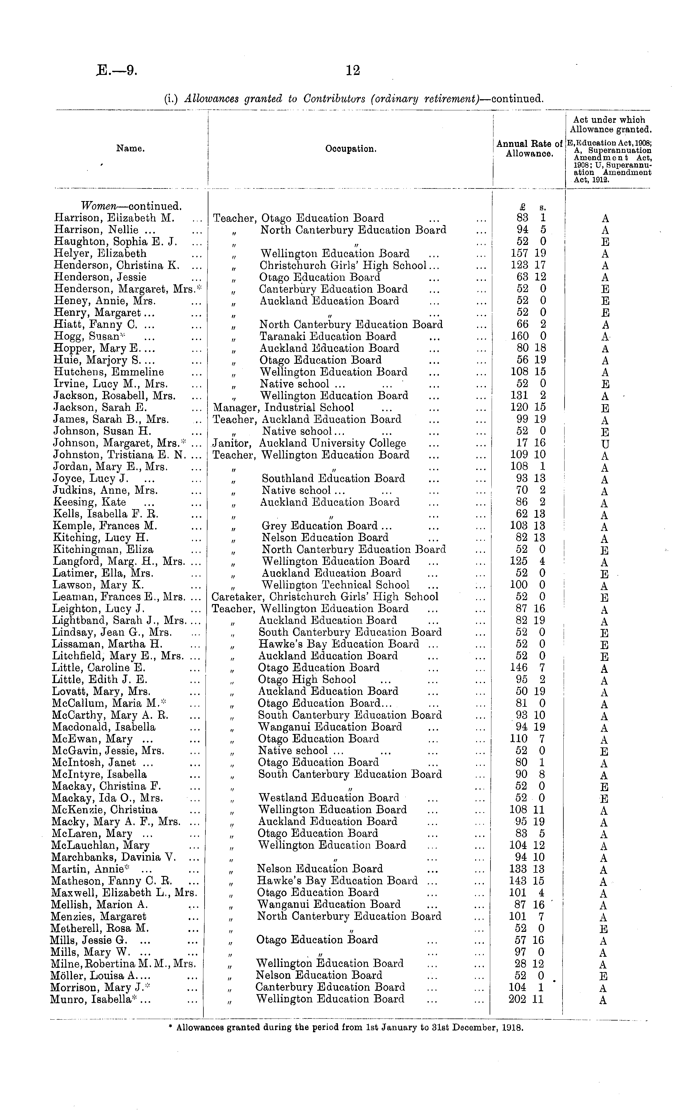 Act under whioh Allowance granted. Name. ,. Annua Oooupation. .jj Annual Rate of Allowance. E,Education Act, 1008; A, Superannuation Amendment Act, 1908; U, Superannuation Amendment Act, 1912. Women —continued. Harrison, Elizabeth M. Harrison, Nellie ... Haughton, Sophia B. J. Helyer, Elizabeth Henderson, Christina K. ... Henderson, Jessie Henderson, Margaret, Mrs.* Heney, Annie, Mrs. Henry, Margaret... Hiatt, Fanny C. ... Hogg, Susan ,,, Hopper, Mary E.... Huie, Marjory S. ... Hutchens, Emmeline Irvine, Lucy M., Mrs. Jackson, Eosabell, Mrs. Jackson, Sarah E. James, Sarah B., Mrs. Johnson, Susan H. Johnson, Margaret, Mrs.* ... Johnston, Tristiana E. N. ... Jordan, Mary E., Mrs. Joyce, Lucy J. Judkins, Anne, Mrs. Keesing, Kate Kells, Isabella F. B. Kemple, Frances M. Kitching, Lucy H. Kitchingman, Eliza Langford, Marg. II., Mrs. ... Latimer, Ella, Mrs. Lawson, Mary K. Leainan, Frances E., Mrs. ... Leigh ton, Lucy J. Lightband, Sarah J., Mrs. ... Lindsay, Jean G., Mrs. Lissaman, Martha H. Litchfield, Mary E., Mrs. ... Little, Caroline E. Little, Edith J. E. Lovatt, Mary, Mrs. McCallum, Maria M.* McCarthy, Mary A. E. Macdonald, Isabella McEwan, Mary ... McGavin, Jessie, Mrs. Mclntosh, Janet ... Mclntyre, Isabella Mackay, Christina F. Mackay, Ida 0., Mrs. McKenzie, Christina Macky, Mary A. F., Mrs. ... McLaren, Mary ... McLauchlan, Mary Marchbanks, Davinia V. Martin, Annie* Matheson, Fanny C. E. Maxwell, Elizabeth L., Mrs. Mellish, Marion A. Menzies, Margaret Metherell, Eosa M. Mills, Jessie G. Mills, Mary W. ... Milne, Eobertina M. M., Mrs. Moller, Louisa A— Morrison, Mary J.* Munro, Isabella* ... £ \ Teacher, Otago Education Board ... ... 8; „ North Canterbury Education Board ... 9? k< OS „ Wellington Education Board ... ... 15 r Christchurch Girls' High School... ... 12! „ Otago Education Board ... ... 6J „ Canterbury Education Board ... ... 5! „ Auckland Education Board ... ... 5i „ „ ... ... o. „ North Canterbury Education Board ... 6( „ Taranaki Education Board ... ... 16( „ Auckland Education Board ... ... 8( „ Otago Education Board ... ... 5( „ Wellington Education Board ... ... 10f „ Native school ... ... ... ... 5' ,, Wellington Education Board ... ... 13; Manager, Industrial School ... ... ... 12( Teacher, Auckland Education Board ... ... 9S „ Native school... ... ... ... 5' Janitor, Auckland University College ... ... 11 Teacher, Wellington Education Board ... ... 1(K ins 10 „ Southland Education Board ... ... 91 „ Native school ... ... ... ... 7( „ Auckland Education Board ... ... 8( c< 65 „ Grey Education Board ... ... ... 10; „ Nelson Education Board ... ... 85 „ North Canterbury Education Board ... bi „ Wellington Education Board ... ... 12' „ Auckland Education Board ... ... 55 „ Wellington Technical School ... ... 10( Caretaker, Christchurch Girls' High School ... 55 Teacher, Wellington Education Board ... ... Q r t „ Auckland Education Board ... ... 85 „ South Canterbury Education Board ... 55 „ Hawke's Bay Education Board ... ... 51 „ Auckland Education Board ... ... 55 „ Otago Education Board ... ... 14( Otago High School ... ... ... 91 „ Auckland Education Board ... ... 5( „ Otago Education Board... ... ... 8] „ South Canterbury Education Board ... 9c Wanganui Education Board ... ... 94 „ Otago Education Board ... ... IK „ Native school ... ... ... ... 55 „ Otago Education Board ... ... 8( „ South Canterbury Education Board ... 9C £ s. 83 1 94 5 52 0 157 19 123 17 63 12 52 0 52 0 52 0 66 2 160 0 80 18 56 19 108 15 52 0 131 2 120 15 99 19 52 0 17 16 109 10 108 1 93 13 70 2 86 2 62 13 103 13 82 13 52 0 125 4 52 0 100 0 52 0 87 16 82 19 52 0 52 0 52 0 146 7 95 2 50 19 81 0 93 10 94 19 110 7 52 0 80 1 90 8 52 0 52 0 108 11 95 19 83 5 104 12 94 10 133 13 143 15 101 4 87 16 ' 101 7 52 0 57 16 97 0 28 12 52 0 104 1 202 11 A A E A A A E E E A AA A A E A E A E U A A A A A A A A E A E A E A A E E E A A A A A A A E A A E E A A A A A A A A A A E A A A E A A 55 „ Westland Education Board ... ... 55 „ Wellington Education Board ... ... 10f „ Auckland Education Board ... ... 9t „ Otago Education Board ... ... 8c „ Wellington Education Board ... ... 104 94 „ Nelson Education Board ... ... 13c „ Hawke's Bav Education Board ... ... 14c „ Otago Education Board ... ... 101 „ Wanganui Education Board ... ... 87 „ North Canterbury Education Board ... 101 55 „ Otago Education Board ... ... 57 97 „ Wellington Education Board ... ... 26 „ Nelson Education Board ... ... 52 „ Canterbury Education Board ... ... 104 „ Wellington Education Board ... ... 202 • Allows nices granted during the period from 1st January to 31st December, 1918.