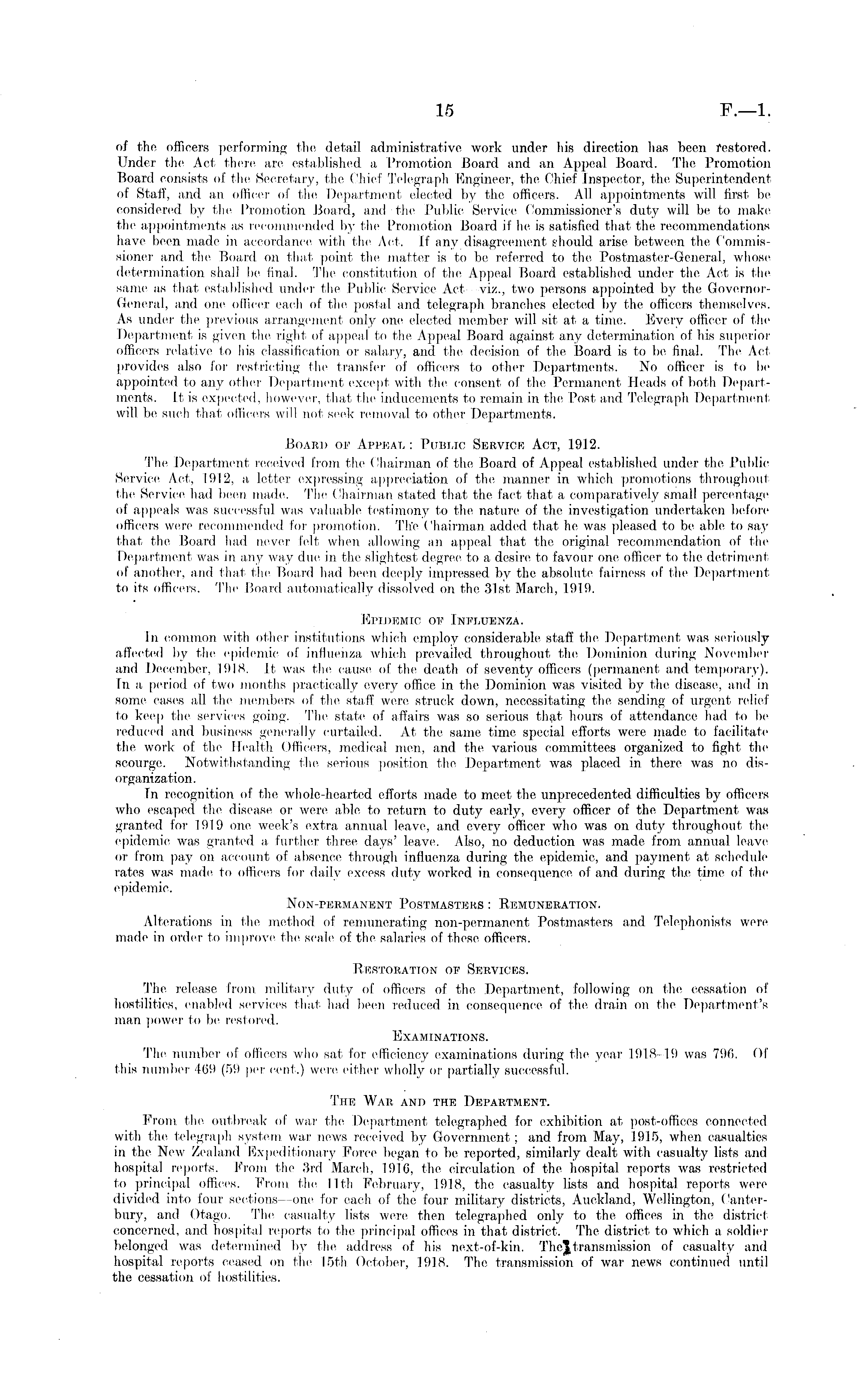 of the officers performing the detail administrative work under his direction has been restored. Under the Act there are established, a Promotion Board and an Appeal Board. The Promotion Board consists of the Secretary, the Chief Telegraph Engineer, the Chief Inspector, the Superintendent of Staff, and an officer of the Department elected by tho officers. All appointments will first be considered by the. Promotion Board, and the Public Service Commissioner's duty will be to make the appointments as recommended by the Promotion Board if he is satisfied that the recommendations have, been made in accordance with the Act, If any disagreement should arise between the Commissioner and the Board on that point the matter is to be referred to the Postmaster-General, whose determination shall be final. The constitution of the Appeal Board established under the Act is the same as that established under the Public Service Act viz., two persons appointed by the GovernorGeneral, and one officer each of the postal and telegraph branches elected by the officers themselves. As under the previous arrangement only one elected member will sit at a time. Every officer of the Department is given the right of appeal to the Appeal Board against any determination of his superior officers relative to his classification or salary, and the decision of the Board is to be final. The Act provides also for restricting the transfer of officers to other Departments. No officer is to be appointed to any other Department except with the consent of the Permanent Heads of both Departments. It is expected, however, that the inducements to remain in the Post and Telegraph Department will be such that officers will not seek removal to other Departments. Board of Appeal : Public Servicf, Act, 1912. The Department received from the Chairman of the Board of Appeal established under tin 1 Public Service Act, 1912, a letter expressing appreciation of the manner in which promotions throughout the Service had been made. The Chairman stated that the fact that a comparatively small percentage of appeals was successful was valuable testimony to the nature of the investigation undertaken before officers were recommended for promotion. The Chairman added that he was pleased to be able to say that the Board had never felt when allowing an appeal, that the original recommendation of the Department was in any way due in the slightest degree to a desire to favour one officer to the detriment of another, and that the Board had been deeply impressed by the absolute fairness of the Department to its officers. The Board automatically dissolved on the 31st March, 1919. Epidemic of Influenza. In common with other institutions which employ considerable staff the Department: was seriously affected by the epidemic of influenza which prevailed throughout the Dominion during November and December, 1918. It was the cause of the death of seventy officers (permanent and temporary). In a period of two months practically every office in the Dominion was visited by the disease, and in some cases all the members of the staff were struck down, necessitating the sending of urgent relief to keep the services going. The state of affairs was so serious that hours of attendance had to be reduced and business generally curtailed. At the same time special efforts were made to facilitate the work of the Health Officers, medical men, and the various committees organized to light the scourge. Notwithstanding the serious position the Department was placed in there was no disorganization. In recognition of the whole-hearted efforts made to meet the unprecedented difficulties by officers who escaped the disease or were able to return to duty early, every officer of the Department was granted for 1919 one week's extra annual leave, and every officer who was on duty throughout the epidemic was granted a further three days' leave. Also, no deduction was made from annual leave or from pay on account of absence through influenza during the epidemic, and payment at schedule rates was made to officers for daily excess duty worked in consequence of and during the time of the epidemic. Non-fermanent Postmasters : Remuneration. Alterations in. the method of remunerating non-permanent Postmasters and Telephonists were made in order to improve the scale of the salaries of these officers. Pf.rtoration of Services. The release from military duty of officers of the Department, following on the cessation of hostilities, enabled services that had been reduced in consequence of the drain on the Department's man power to be restored. Examinations. The number of officers who sat for efficiency examinations during the year 1918—19 was 796. Of this number 469 (59 per cent.) were either wholly or partially successful. The War and the Department. From the outbreak of war the Department telegraphed for exhibition at post-offices connected with the telegraph system war news received by Government; and from May, 1915, when casualties in the New Zealand Expeditionary Force began to be reported, similarly dealt with casualty lists and hospital reports. From the 3rd March. 1916, the. circulation of the hospital reports was restricted to principal offices. From the Nth February, 1918, the casualty lists and hospital reports were divided into four sections—one for each of the four military districts, Auckland, Wellington, Canterbury, and Otago. The casualty lists were then telegraphed only to the offices in the district concerned, and hospital reports to the principal offices in that district, The district to which a soldier belonged was determined by the address of his next-of-kin. The J transmission of casualty and hospital reports ceased on the 15th October, 1918. The transmission of war news continued until the cessation of hostilities.