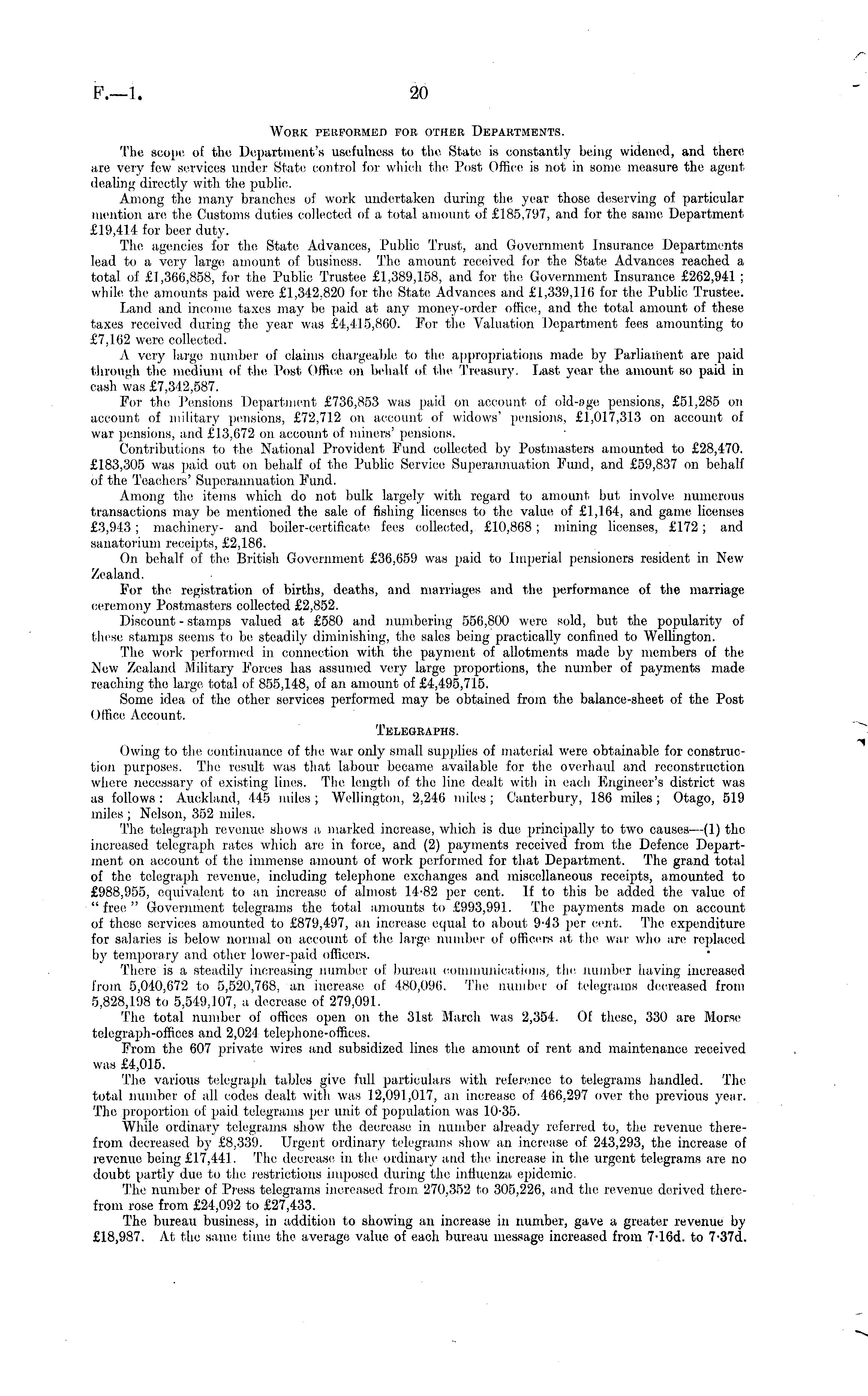 Work performed for other Departments. The scope of the Department's usefulness to the State is constantly being widened, and there are very few services under State control for which the Post Office is not in gome measure the agent dealing directly with the public. Among the many branches of work undertaken during the year those deserving of particular mention are the Customs duties collected of a total amount of £185.797, and for the same Department £19,414 for beer duty. The agencies for the State Advances, Public Trust, and Government Insurance Departments lead to a very large amount of business. The amount received, for the State Advances reached a total of £1,366,858, for the Public Trustee £1,389,158, and for the Government Insurance £262,941 ; while the amounts paid were £1,342,820 for the State Advances and £1,339,116 for the Public Trustee. Land and income taxes may be paid at any money-order office, and the total amount of these taxes received during the year was £4,415,860. For the Valuation Department fees amounting to £7,162 were collected. A very large number of claims chargeable to the appropriations made by Parliament are paid through the medium of the Post Office on behalf of the Treasury, hast year the amount so paid in cash was £7,342,587. For the Pensions Department £736,853 was paid on account of old-age pensions, £51,285 on account of military pensions, £72,712 on account of widows' pensions, £1,017,313 on account of war pensions, and £13,672 on account of miners' pensions. Contributions to the National Provident Fund collected by Postmasters amounted to £28,470. £183,305 was paid out on behalf of the Public Service Superannuation Fund, and £59,837 on behalf of the Teachers' Superannuation Fund. Among the items which do not bulk largely with regard to amount but involve numerous transactions may be mentioned the sale of fishing licenses to the value of £1,164, and game licenses £3,943; machinery- and boiler-certificate fees collected, £10,868; mining licenses, £172; and sanatorium receipts, £2,186. On behalf of the British Government £36,659 was paid to Imperial pensioners resident in New Zealand. For the registration of births, deaths, and marriages and the performance of the marriage ceremony Postmasters collected £2,852. Discount - stamps valued at £580 and numbering 556,800 were sold, but the popularity of these stamps seems to be steadily diminishing, the sales being practically confined to Wellington. The work performed in connection with the payment of allotments made by members of the New Zealand Military Forces has assumed very large proportions, the number of payments made reaching tho large total of 855,148, of an amount of £4,495,715. Some idea of the other services performed may be obtained from the balance-sheet of the Post (Mfice Account. Telegraphs. Owing to the continuance of the war only small supplies of material were obtainable for construction purposes. The result was that labour became available for the overhaul and reconstruction where necessary of existing lines. The length of the line dealt with in each Engineer's district was as follows : Auckland, 445 miles ; Wellington, 2,246 miles ; Canterbury, 186 miles; Otago, 519 miles ; Nelson, 352 miles. The telegraph revenue shows a. marked increase, which is due principally to two causes —(1) the increased telegraph rates which are in force, and (2) payments received from the Defence Department on account of the immense amount of work performed for that Department. The grand total of the telegraph revenue, including telephone exchanges and miscellaneous receipts, amounted to £988,955, equivalent to an increase! of almost 14-82 per cent. If to this be added the value of "free" Government telegrams the total amounts to £993,991. The payments made on account of these services amounted to £879,497, an increase equal to about 9-43 per cent, The expenditure for salaries is below normal on account of the large number of officers at the war who are replaced by temporary and other lower-paid officers. There is a steadily increasing number of bureau cm unications, the number having increased from 5,040,672 to 5,520,768, an increase of 480,096. The number of telegrams decreased from 5,828,198 to 5,549,107, a decrease of 279,091. The total number of offices open on the 31st March was 2,354. Of these, 330 are Morse telegraph-offices and 2,021 telephone-offices. From the 607 private wires and subsidized lines the amount of rent and maintenance received was £4,015. The various telegraph tables give full particulars with reference to telegrams handled. The. total number of all codes dealt with was 12,091,017, an increase of 466,297 over the previous year. The proportion of paid telegrams per unit of population was 10-35. While ordinary telegrams show the decrease in number already referred to, the revenue therefrom decreased by £8,339. Urgent ordinary telegrams show an increase of 243,293, the increase of revenue being £17,441. The decrease in the ordinary and the increase in the urgent telegrams are no doubt partly due to the restrictions imposed during the influenza, epidemic. The number of Press telegrams increased from 270,352 to 305,226, and the revenue derived therefrom rose from £24,092 to £27,433. The bureau business, in addition to showing an increase in number, gave a greater revenue by £18,987. At the same time the average value of each bureau message increased from 7-16 d. to 7-37 d.