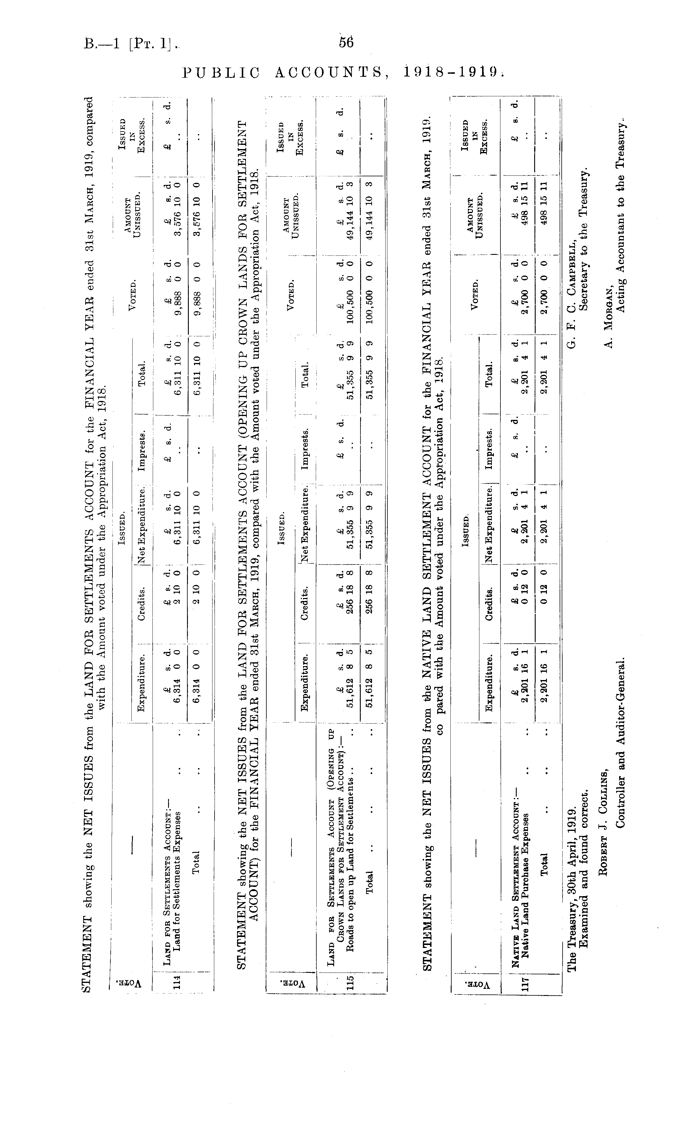 STATEMENT showing the NET ISSUES from the LAND FOR SETTLEMENTS ACCOUNT (OPENING UP CROWN LANDS FOR SETTLEMENT ACCOUNT) for the FINANCIAL YEAR ended 31st March, 1919, compared with the Amount voted under the Appropriation Act, 1918.