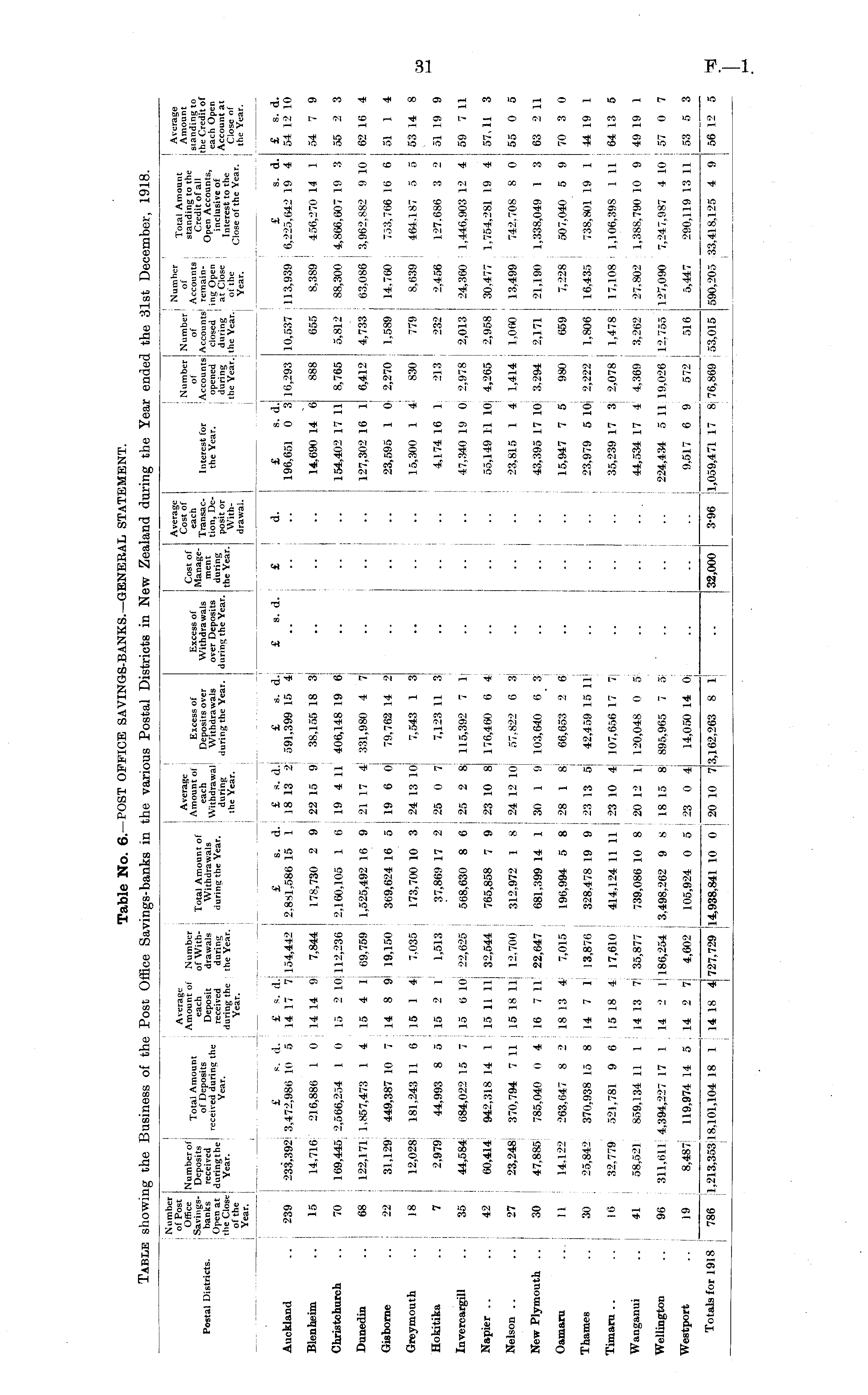 Number i of Post Average ■ Avera „„ Office Numberof T t . * . Amount ol Number a - *? r «.,.,; ™ r\ ■*. Total Amount , ,„,.. t- _. > a .. <■ Amount oi Excess of ■ savings- Deposits eacri of With- Total Amount of „„„ K r-. a .„ „ „ Postal Districts. ; banks received ««&&%. i Depo.1- drawals Withdrawals , vi £ wal ! wg S Open at dunngthe v „ - received during during the Year. , . , .. v_»„.. a the Close Year. Year - during the the Year. ! , h du " n B during the Year, d of the i Year. I ,he Ycar " £ s. d. £ s. d. £ s. d. £ s. d. £ s. d. Auckland .. 239 233,392 3,472,986 10 5 14 17 71154,442 2,881,586 15 1 18 13 2' 591,399 15 4 Blenheim .. 15 14,716 216,886 1 0 14 14 9 7,844 178,730 2 9 ! 22 15 9 38,155 18 3 Christchurch .. 70 169,445 2,506,254 1 0 15 2 10 112,236 2,160,105 1 6 19 4 11 406,148 19 6 Dunedin .. 68 122,171 1,857,473 1 4 15 4 1 09,759 1,525,492 16 9 21 17 4' 331,980 4 7 Gisborne .. 22 31,129 449,387 10 7 14 8 9 19,150 309,624 16 5 ! 19 6 0 79,762 14 2 Greymouth .. 18 12,028 181,243 11 6 15 1 4 7,035 173,700 10 3 24 13 10 7,543 1 3 Hokitika .. 7 2,979 44,993 8 5 15 2 1 1,513 37,869 17 2 j 25 0 7 7,123 11 3 Invereargill .. 35 44,584 084,022 15 7 15 6 10 22,625 568,630 8 6 : 25 2 8 115,392 7 1 Napier .. .. 42 60,414 942,318 14 1 15 11 11 32,544 765,858 7 9 23 10 8 170,460 6 4 Nelson .. .. 27 370,794 7 11 15 18 11 12.700 312,972 1 8 j 24 12 10| 57,822 6 3 New Plymouth .. 30 47,885 785,040 04 16 7 11 22,647 681,399 14 1 j 30 1 9 103,640 6 3 Oamaru ... 11 14.122 263,647 8 2 18 13 4 7,015 196,994 5 8 28 1 8| 66,653 2 6 Thames .. 30 25,842 370,938 15 8 14 7 1 13,876 j 328,478 19 9 23 13 5 42,459 15 11 Timaru.. .. 16 32,779 521,781 9 6 15 18 4 17,610 414,124 11 11 j 23 10 4 107,656 17 7i Wanganui .. 41 58,521 859,134 11 1 14 13 7 35,877 739,086 10 8 20 12 1 120,048 0 5 Wellington .. 96 311,011 4,394,227 17 1 14 2 ] 186,254 , 3,498,262 9 8 18 15 8 895,965 7 5 Westport .. j 19 8,487 : 119,974 14 5 14 2 7! 4,602 105,924 0 5 ' 23 0 4 14,050 14 0 Excess of Withdrawals over Deposits during the Year. W ov« ri a r i c Excess of M /ithdrawals ™ •er Deposits , ] ing the Year. , £ s. d. Cost of Management during the Year. Dost of lanagement during le Year £ A f < ti !r. f Average Cost of each Transaction, Deposit or Withdrawal. \verage - Number ~, _. *„„„ . r » «*- m v> kt — u c I otal Amount Cost of Number Number of .„ .. „ _ K „„ k \ t c A - standing to the Accounts Creditor all rransac- Interest for Accounts Accounts 1 remain- : n A ion, De- | the Year. opened closed ; ing Open ; Up ; e " ,„". " f ' posit or during during at Close , . I . 7C With- i the Year, the Year. of the rl ?, h vlr drawal. | : Year. Close of the Year. I I I I : d. £ s. d. £ s. d. 196,651 0 3 16,293 10,537 113,939:6,225,642 19 4 14,690 14 6 888 655 8,389 456,270 14 1 154,402 17 11 8,765 5,812 88,300 4,866,607 19 3 127,302 16 1 6,412 4,733 63,086 3,962,882 9 10 23,595 1 0i 2,270 1,589 14,760 753.706 16 6 15,300 1 4 830 779 8,639 ; 464.187 5 5 4,174 16 1 213 232 2,456 127.686 3 2 47,340 19 Oi 2,978 2,013 24,360 1,446,903 12 4 55,149 11 10; 4,265 : 2,958 30,477 1,754,281 19 4 23,815 1 4 1,414 i 1,000 13,499 742,708 8 0 43,395 17 10 3,294 : 2,171 21,190 1,338,049 1 3 15,947 7 5 980 059 7,228 507,040 5 9 23,979 5 10 2,222 1,806 16,435 738,80119 1 35,239 17 3 ; 2,078 | 1,478 I 17,108 1,106,398 1 11 .. . 44,534 17 4 4,369 3,262; 27,802 1,388,790 10 9 224,4:34 5 11 19,026 12.755 127,090 7,247.987 4 10 9,517 6 9 572 516 5,447 290,119 13 11 1 merest for the Year. ■ M k v h I Nun J ber Total Amount Number Number of standing to the ot o Accounts n ,.. & f ., a * a . i ~ ■ Credit of all Accounts Accounts remain- ~ a--.™;!*., , , j j-. Upen Accounts, opened closed ing Open - > _,* , ' during during at Close , illusive of the Year, the Yelr. of the rl 7, h V,lr v Close of the Year. I Average Amount standing to the Credit of each Open Account at Close of the Year. £ s. d. 54 12 10 54 7 9 55 2 3 62 16 4 51 1 4 53 14 8 51 19 9 59 7 11 57 II 3 55 0 5 63 2 11 70 3 0 44 19 1 64 13 5 49 19 1 57 0 7 53 5 3 Totals for 1918 786 1,213,35318,101,104 18 1 14 18 4J 727,729 14,938,841 10 0 20 10 7 3,162,263 8 1 3,162,263 S 1 32 32,000 2,000 I 3'96 1,059,4*71 17 8:76,869 53,015 3-96 |1,059,471 17 8 76,869 53,015 590,205 33,418,126 4 9 590,205 33,418,126 4 9 56 12