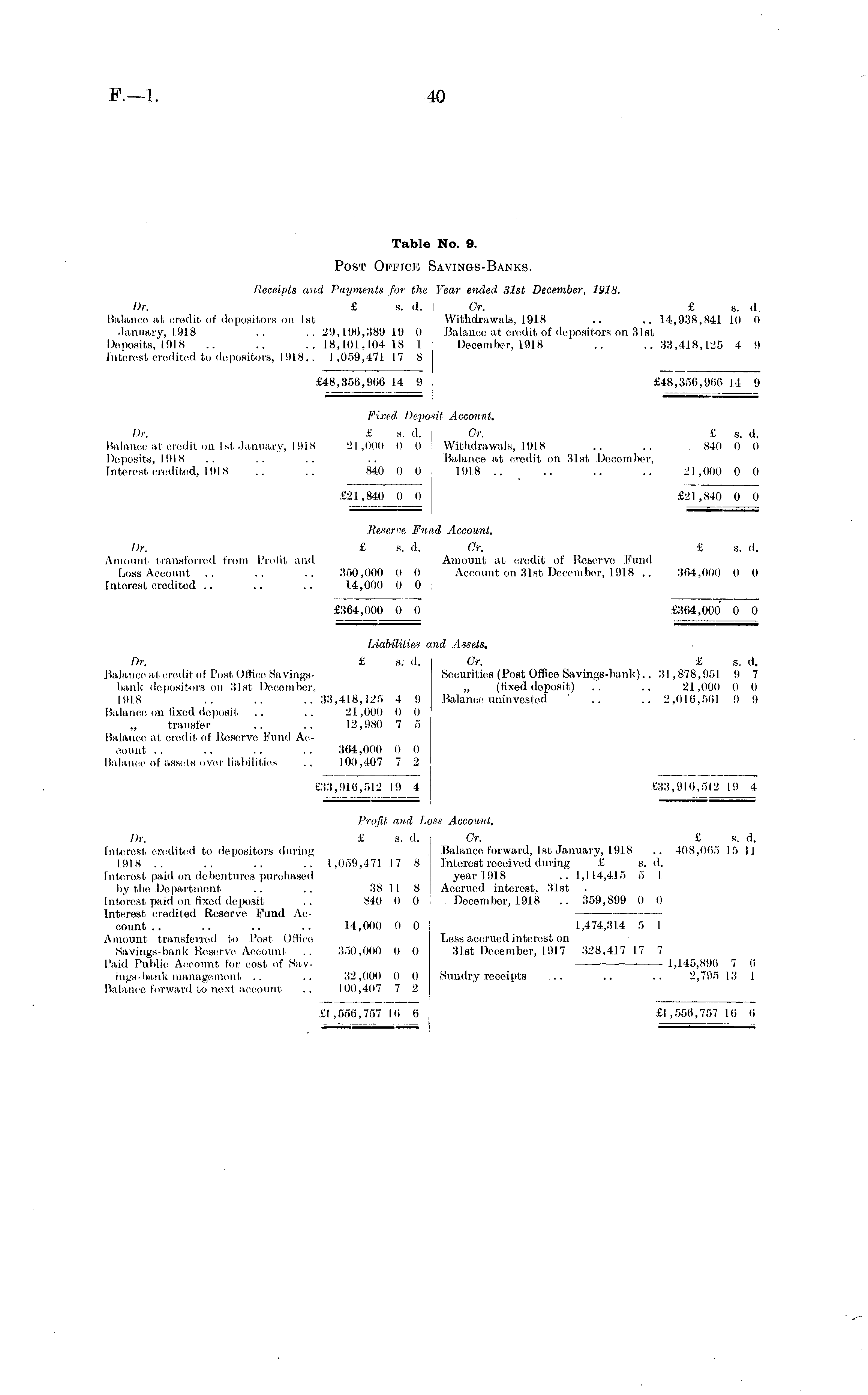 Table No. 9. Post Office Sayings-Banks. Receipts and Payments for the Year ended 31st December, 1918. Dr. S s. d. Or. £ s. d. Balance at credit of depositors on Ist Withdrawals, 1918 .. .. 14,938,84110 0 January, 191.8 .. ..29,196,389 19 0 Balance at credit of depositors on 31st Deposits, 1918 .. .. ..18,101,104 18 1 December, 1918 .. ..33,418,125 4 9 Interest credited to depositors, 1918.. 1,059,47117 8 £48,356,966 14 9 £48,356,966 14 9 Fixed Deposit Account. Dr. £ s. d. I Gr. £ s. d. Balance at credit on Ist January. 191S 21,000 0 0 I Withdrawals, 1918 .. .. 810 0 0 Deposits, 1918 .. .. .. .. Balance at credit on 31st December, Interest credited, 1918 .. .. 840 0 0 1918 .. .. .. .. 21,000 0 0 £21,840 0 0 £21,840 0 0 Reserve Fund Account. Dr. £ s. d. Or. £ s. d. Amount transferred from Profit and Amount at credit of Reserve Fund Loss Account .. .. .. 350,000 0 0 ' Account on 31st December, 1918 .. 364,000 o o Interest credited .. .. .. 14,000 0 0 £364,000 0 0 £364,000 0 0 Liabilities and Assets. Dr. £ s. d. Gr. £ s. d. Balanoe at credit of Post Office Savings- Securities (Post Office Savings-bank).. 31,878,951 9 7 bank depositors on 31st December, „ (fixed deposit) .. .. 21,000 0 0 1918 .. .. .. 33,41.8,125 4 9 Balance uninvostod .. .. 2,010,561 9 9 Balance on fixed deposit .. .. 21,000 0 0 transfer .. .. 12,980 7 5 Balance at credit of Reserve Fund Account .. .. .. .. 364,000 0 0 Balance of assets over liabilities .. 100,407 7 2 £33,910,512 19 4 £33,916,512 19 4 Profit and Loss Account. Dr. £ s. d. Gr. t s. d. Interest credited to depositors during . Balance forward, Ist January, 1918 .. 408,065 15 11 1918 .. .. .. .. 1,059,471 17 8 Interest received during £ s. d. Interest paid on debentures purchased year 1918 .. 1,114,415 5 I by the Department .. .. 38 11 8 Accrued interest. 31st Interest paid on fixed deposit .. 840 0 0 Decembor, 1918 .. 359,899 0 0 Interest credited Reserve Fund Aocount .. .. .. .. 14,000 0 0 1,474,314 5 1 Amount transferred to Post Office Less accrued interest on Savings-bank Reserve Account .. 350,000 0 0 31st December, 1917 328,417 17 7 Paid Public Account for cost of Say- 1,145,896 7 6 ings-bank management .. .. 32,000 0 0 Sundry receipts .. .. .. 2,795 13 1 Balance forward to next account .. 100,407 7 2 £1,556,757 16 6 £1,556,757 16 6