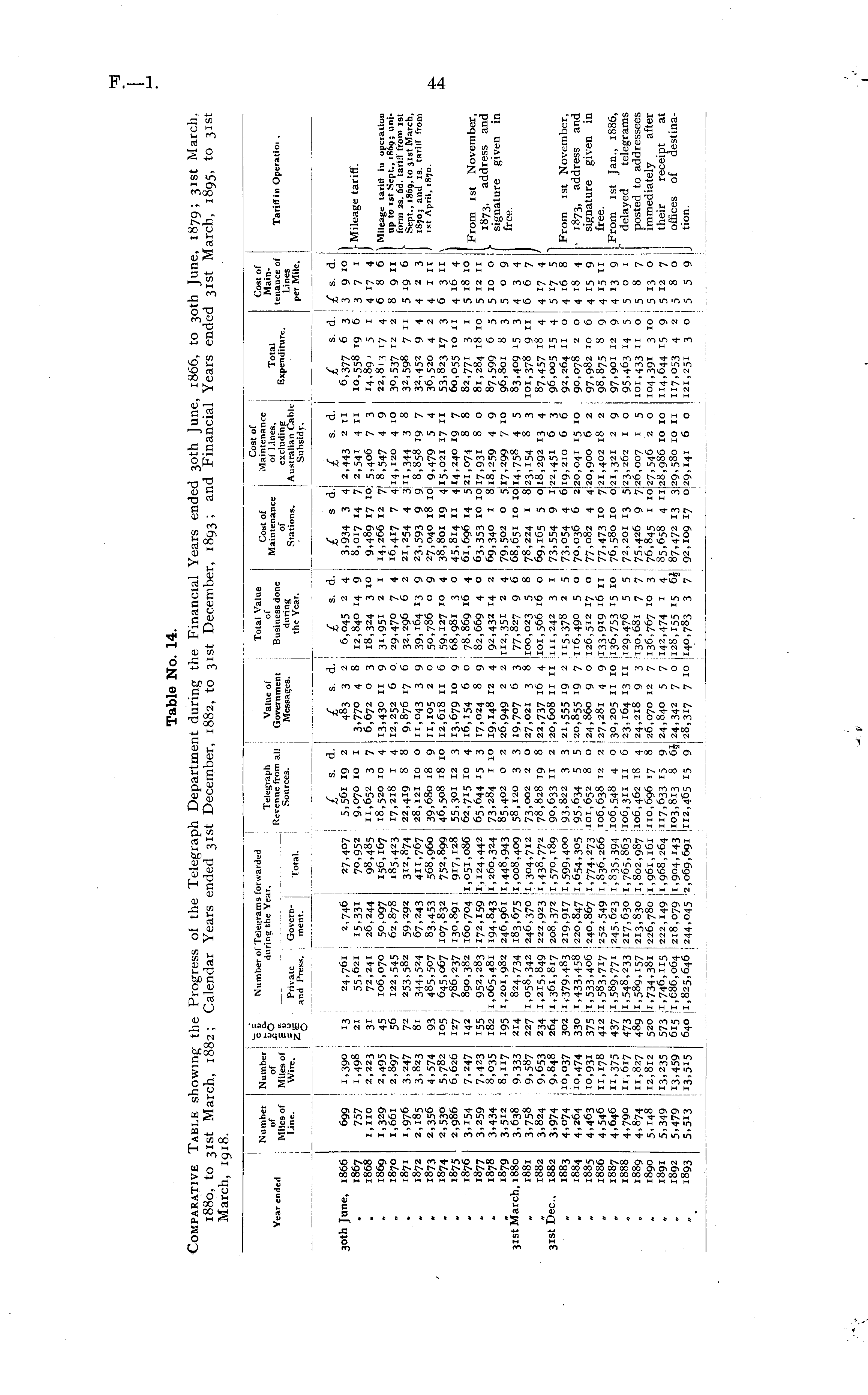 Table No. 14. Comparative Table showing the Progress of the Telegraph Department during the Financial Years ended 30th June, 1866, to 30th June, 1879; 31st March, 1880, to 31st March, 1882; Calendar Years ended 31st December, 1882, to 31st December, 1893; and Financial Years ended 31st March, 1895, to 31st March, 1918.