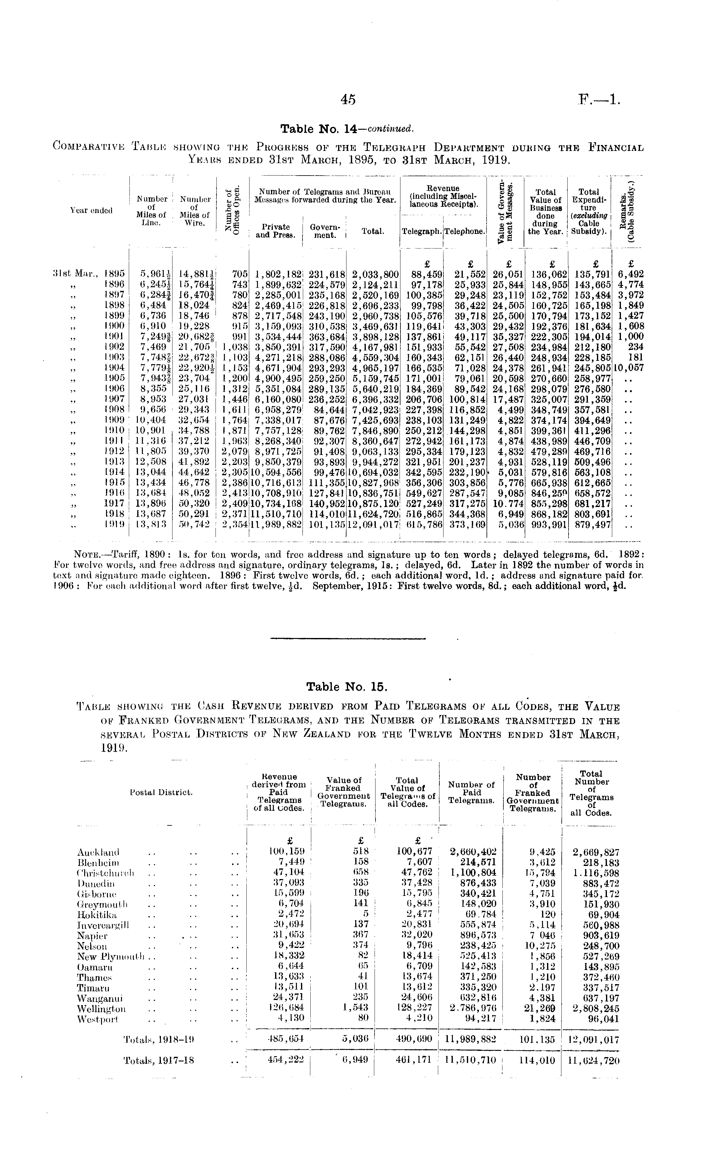 Table No. 14 — continued. Comparative Table showing the Progress of the Telegraph Department during the Financial Years ended 31st March, 1895, to 31st March, 1919.
