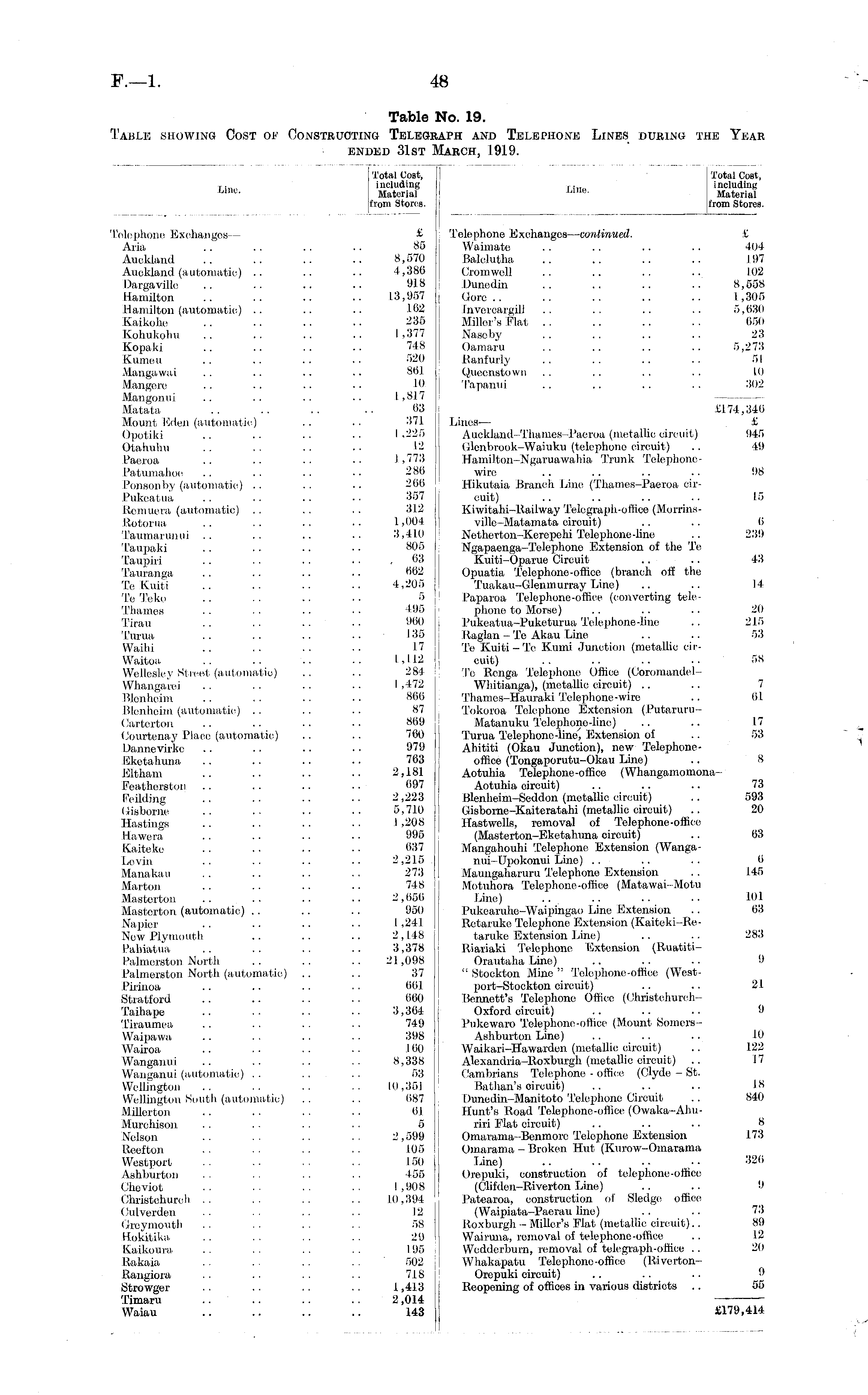 Line. Total Cost, including Material from Stores. Total Cost, I iu„ including um> - Material from Stores. Telephone Exchanges— Aria Auckland Auckland (automatic) .. Dargaville Hamilton Hamilton (automatic) .. Kaikohe Kohukohu Kopaki Kumeu Manga wai Mangere Mangonui Matata Mount Uden (automatic) Opotiki Otahuhu Paeroa Patumahoe Ponsonby (automatic) .. Pukeatua Remuera (automatic) .. Rotorua Taumarunui Taupaki Taupiri Tauranga Te Kuiti Te Teko Thames Tirau Turua Waihi Waitoa Wellesley Street (automatic) Whangarei Blenheim .. ' . . Blenheim (automatic) . . Carterton Courtenay Place (automatic) Uannevirkc Eketahuna Eltham Featherston Feilding Gisborne Hastings Hawera Kaiteke Levin Manakau Marton Masterton Masterton (automatic) .. Napier New Plymouth Pahiatua Palmerston North Palmerston North (automatic) Pirinoa Stratford Taihape Tiraumea VVaipawa Wairoa Wanganui Wanganui (automatic) .. Wellington Wellington South (automatic) Millerton Murchison Nelson Reefton Westport Ashburton Cheviot Christchurch Culverden Greymouth Hokitika Kaikoura Rakaia Rangiora Strowger Timaru Waiau £ 85 8,570 4,386 918 13,957 162 235 1,377 748 520 861 10 1.817 03 371 I ,225 12 1,773 280 200 357 312 1,004 3,410 805 , 63 662 4,205 5 495 960 135 17 I , 112 284 I ,472 866 87 869 760 979 763 2,181 697 2,223 5,710 I ,208 995 637 2,215 273 748 2,050 950 I ,241 2,148 3,378 21,1)98 37 661 660 3,364 749 398 100 8,338 53 10,351 687 61 5 2,599 105 150 455 1,908 10,394 12 58 29 195 502 718 1,413 2,014 143 i I Tele phone Exchanges — continued. £ Waimate . . .. .. .. 404 Balclutha .. .. .. .. 197 Cromwell . . .. . . .. 102 Dunedin .. .. .. .. 8,558 Gore.. .. .. .. .. 1,305 Invereargill .. .. .. .. 5,630 Miller's Flat . . .. .. .. 050 Nasoby . . . . .. . . 23 Oamaru . , .. .. .. 5,273 Ranf urly .. .. .. .. 51 Queenstown .. .. .. .. 10 Tapanui .. .. .. .. 302 £174,340 Lines— £ Auckland-Tliaines-Paeroa (metallic circuit) 945 Glenbrook-Waiuku (telephone circuit) .. 49 Hamilton-Ngaruawahia Trunk Telephonewire .. .. .. .. 98 Hikutaia Branch Line (Thamcs-Paeroa circuit) .. .. .. .. 15 Kiwitahi-Railway Telegraph-office (Morrinsville -Matamata circuit) .. .. 6 Netherton-Kcrepehi Telephone-line .. 239 Ngapaenga-Telephone Extension of the Te Kuiti-Oparue Circuit .. .. 43 Opuatia Telephone-office (branch off the Tuakau-Glenmurray Line) .. .. 14 Paparoa Telephone-office (converting telephone to Morse) .. . . .. 20 Pukeatua-Puketurua Telephone-line .. 215 Raglan - Te Akau Line .. . . 53 Te Kuiti-Te Kunvi Junction (metallic circuit) .. . . .. .. 58 Te Rcnga Telephone Office (CoromandelWhitianga), (metallic circuit) .. .. 7 Thamos-Hauraki Telephone-wire .. 61 Tokoroa Telephone Extension (PutaruruMatanuku Telephone-line) .. .. 17 Turua Telephone-line, Extension of .. 53 Ahititi (Okau Junction), new Telephoneoffice (Tongaporutu-Okau Line) .. 8 Aotuhia Telephone-office (WhangamomonaAotuhia circuit) .. .. .. 73 Blenheim-Seddon (metallic circuit) .. 593 Gisborne-Kaiteratahi (metallic circuit) .. 20 Hastwells, removal of Telephone -office (Masterton-Eketahuna circuit) .. 63 Mangahouhi Telephone Extension (Wanganui- Upokonui Line) .. . . .. 0 Maungaharuru Telephone Extension .. 145 Motuhora Telephone-office (Matawai-Motu Line) .. .. .. .. 101 Pukearuhe-Waipingao Line Extension .. 63 Retaruke Telephone Extension (Kaiteki-Re-taruke Extension Line) .. .. 283 Riariaki Telephone Extension (RuatitiOrautaha Line) .. . . .. 9 " Stockton Mine " Telephone-office (West-port-Stockton circuit) .. .. 21 Bennett's Telephone Office (OhristohurchOxford circuit) .. .. .. 9 Pukewaro Telephone-office (Mount SomersAshburton Line) .. .. .. 10 Waikari-Hawardcn (metallic circuit) .. 122 Alexandria-Roxburgh (metallic circuit) .. 17 Cambrians Telephone - office (Clyde - St. Bathan's circuit) .. .. .. 18 Ihuiotlin-Manitoto Telephone Circuit .. 840 Hunt's Road Telephone-office (Owaka-Ahu-riri Flat circuit) .. .. .. 8 Omarama-Benmorc Telephone Extension 173 Omarama - Broken Hut (Kurow-Omarama Line) .. .. .. .. 326 Orepuki, construction of telephone-office (Clifden-Riverton Line) .. .. 9 Patearoa, construction of Sledge office (Waipiata-Paerau line) . . .. 73 Roxburgh - Miller's Flat (metallic circuit).. 89 Wairuna, removal of telephone-office .. 12 Wedderburn, removal of telegraph-office .. 20 Whakapatu Telephone-office (RivcrtonOrepuki circuit) .. .. .. 9 Reopening of offices in various districts .. 55 £179,414