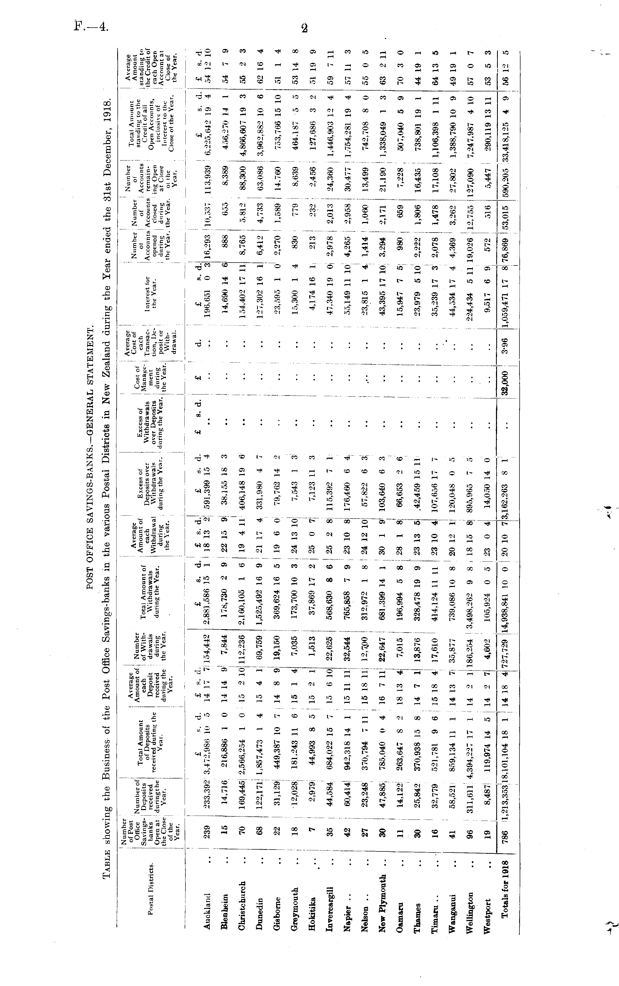 Postal Districts. Number i of Post , Average j Office Number of . , .„ . Amount of. Number Savings-i Deposits To ft f' A "S" Bt each of Withbanks I received 0E lje P°f 1IS Deposit drawals Open at dunngthe received during the durjng the Close Year. during the the Year, of the Year. Year. I Average ! 1 Average c , Cost of : tw.,1 a „,«.,.,♦ «r ! Amount of Excess of Excess of a . each lota Amount of . ,-, , Manage- -iWfVl ,„ _,_ each Depositsover Withdrawals • TransacHnVillSv,,, Withdrawal Withdrawals over Deposits , mc . nt tion, De-' during trie Year. , . , . .. ., ..u \> during • during during the Year, during the Year. {* 11 5 posit or ! the Year. tne Year "| Withdrawal. Interest for the Year. Number ! ,.. , . Number Number of lotal Amount ot of i Accounts ' standing to he Accounts Accounts remain- Credit ol al opened , closed ing Open Open Accounts, during ! dining at Close inclusive of the Year, the Year. o, the r-. , Jl. i Y „ r Close ot the Year. I Average Amount j standing to the Credit of I each Open i Account at Close of the Year. 239 ! £ s. d. £ s. d. £ s. d. £ s. d. £ s. d. ! 233.392 3,472,986 10 5 14 17 7 154,442 2.881,586 15 1 I ]8 13 2 591,399 15 4 £ s. d. £ ' I d. £ s. d. £ s. d. 196,651 0 3 16,293 10,537 113,939 6,225,642 19 4 £ s. d. 54 12 10 Auckland Blenheim 15 70 68 22 18 7 35 42 27 30 11 30 16 41 14.716 216,886 1 0 14 14 9 7,844 178,730 2 9 22 15 9 38.155 18 3 169,445 2,566,254 1 0 15 2 10:112,236 2,160,105 1 6 19 4 11 406,148 19 6 122,171 1,857,473 1 4 15 4 1 69,759 1,525,492 16 9 ! 21 17 4 331,980 4 7 31,129 449,387 10 7 14 8 9 19,150 369,624 16 5 : 19 6 0 79,762 14 2 12,028; 181.243 11 6 15 1 4 7,035 173,700 10 3 ! 24 13 10 1 7,543 1 3 2,979 44,993 8 5 j 15 2 1 1,513 37,869 17 2 j 25 0 7. 7,123 11 3 44,584 684,022 15 7 15 6 10 22,625 568,630 8 6 ! 25 2 8 115,392 7 1 60,414 942,318 14 1 15 11 11 32,544 765,858 7 9 23 10 8 176,460 6 4 23,248 370,794 7 11 15 18 11 12,7,00 312,972 1 8 24 12 10; 57,822 6 3 47,885 785.040 0 4 16 7 11 22,647 681.399 14 1 30 1 9' 103,640 6 3 14,122 263.647 8 2 18 13 4; 7,015 196,994 5 8 28 1 8 66,653 2 6 25,842 370,938 15 8 14 7 1! 13,876 328,478 19 9 23 13 5 .42,459 15 11 32,779 521,781 9 6 15 18 4 17,610 414.124 11 11 23 10 4 107,656 17 7 58,521 859,134 11 1 14 13 7 35,877 739.080 10 8 20 12 J. 120,048 0 5 14.690 14 6 888 655 8.389 456,270 14 1 154.402 17 11 8,765 5.812 88,300 4,866,607 19 3 127.302 16 1 6,412 4,733 63,086 3,962,882 10 6 23.595 1 0 ! 2,270 1,589 14.760 ! 753.706 15 10 15,300 1 4 83(1 779 8.639 464.1S7 5 5 4,174 16 1 213 232 : 2,456 i 127,686 3 2 47.340 19 0 2,978 2,013 24,360 | 1,446,903 12 4 55,149 11 10 4,265 2,958 j 30,477 ; 1,754,281 19 4 23,815 1 4 1,414 1.060 13.499 742.708 8 0 43,395 17 10 3,294 2,171 j 21,190 1,338,049 1 3 15,947 7 5 980 659 7,228 507,040 5 9 23.979 5 10 2,222 1,806 16,435 738,801 19 1 35,239 17 3 2,078 1,478 17,108 j 1,106,398 1 11 44,534 17 4 4.369 3,262 27,802 1,388,790 10 9 54 7 9 Christchurch 55 2 3 Dunedin 62 16 4 Gisborne 51 1 4 Greymouth 53 14 8 Hokitika 51 19 9 Invercargill 59 7 11 Napier 57 11 3 Nelson 55 0 5 New Plymouth .. 63 2 11 Oamaru 70 3 0 Thames 44 19 1 Timaru .. 64 13 5 Wanganui 49 19 1 Wellington 96 19 311,6114,394,227 17 1 14 2 l! 186,254 ' 3,498,262 9 8,18 15 8 895,965 7 5 8,487 ! 119,974 14 5 14 2 7 4,602 105,924 0 5 l 23 0 4I 14,050 14 0 224,4:34 5 11 19,026 12,755 127,090 7,247,987 4 10 9.517 6 9 572 516 5,447 ' 290,119 13 11 57 0 7 Westport 53 5 3 Totals for 1918 786 1,213,35318.101,104 18 1 ! 14 18 4| 727,729 114,938,841 10 0 20 10 1 ] 3,162.263 8 1 32,000 3-96 1,059,471 17 8 1 76,869 53.015 590,205 33,418,125 4 9 56 12 5