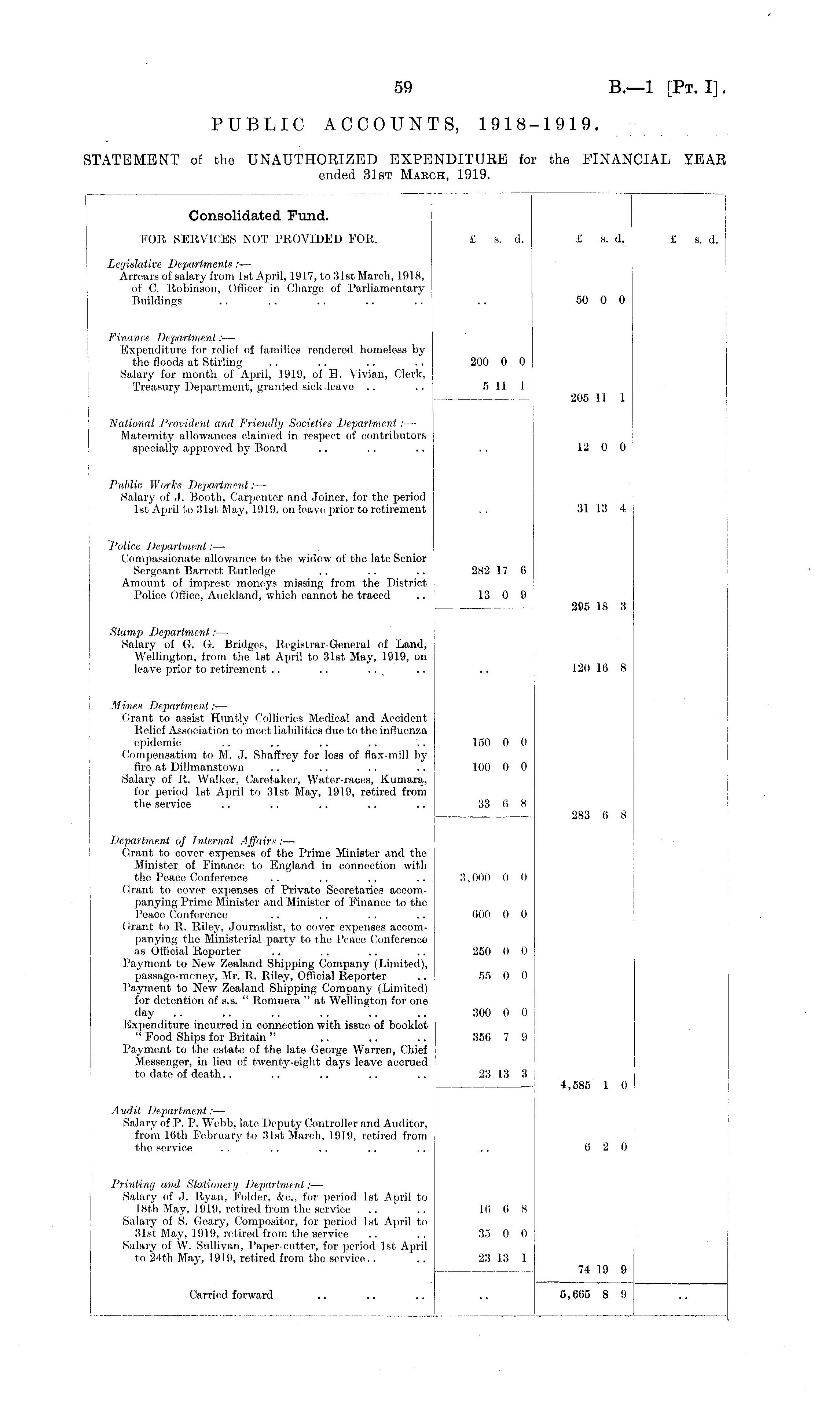 Consolidated Fund. £ s. d. FOR SERVICES NOT PROVIDED FOR. £ s. (1. £ s. d. Legislative Departments .-— Arrears of salary from 1st April, 1917, to 31st March, 1918, of C. Robinson, Officer in Charge of Parliamentary Buildings 50 0 0 Finance Department: — Expenditure for relief of families rendered homeless by the floods at Stirling Salary for month of April, 1919, of H. Vivian, Clerk, Treasury Department, granted sick-leave 200 0 0 205 11 1 5 11 1 National Provident and Friendly Societies Department: — Maternity allowances claimed in respect of contributors specially approved by Board 12 0 0 Public Works Department: — Salary of J. Booth, Carpenter and Joiner, for the period 1st April to 31st May, 1919, on leave prior to retirement 31 13 4 Police Department: — Compassionate allowance to the widow of the late Senior Sergeant Barrett Rutledge Amount of imprest mone}is missing from the District Police Office, Auckland, which cannot be traced 282 17 6 295 18 3 13 0 9 Stamp Department: — Salary of G. G. Bridges, Registrar-General of Land, Wellington, from the 1st April to 31st May, 1919, on leave prior to retirement .. .. 120 16 8 Mines Department: — Grant to assist Huntly Collieries Medical and Accident Relief Association to meet liabilities due to the influenza epidemic Compensation to M. J. Shaffrey for loss of flax-mill by fire at Dillmanstown Salary of R. Walker, Caretaker, Water-races, Kumara, for period 1st April to 31st May, 1919, retired from the service 150 0 0 100 0 0 33 6 8 283 ti 8 Department of Internal Affairs : — Grant to cover expenses of the Prime Minister and the Minister of Finance to England in connection with the Peace Conference Grant to cover expenses of Private Secretaries accompanying Prime Minister and Ministor of Finance to tho Peace Conference Grant to R. Riley, Journalist, to cover expenses accompanying the Ministerial party to the Peace Conference as Official Reporter Payment to New Zealand Shipping Company (Limited), passage-meney, Mr. R. Riley, Official Reporter Payment to New Zealand Shipping Company (Limited) for detention of s.s. " Remuera " at Wellington for one day .. Expenditure incurred in connection with issue of booklet " Food Ships for Britain " Payment to the estate of the late George Warren, Chief Messenger, in lieu of twenty-eight days leave accrued to date of death.. .. .. .. 3,000 0 0 600 0 0 250 0 0 55 0 0 300 0 0 356 7 9 23 13 3 Audit Department: — Salary of P. P. Webb, late Deputy Controller and Auditor, from 16th February to 31st March, 1919, retired from the service 4,585 1 0 6 2 0 Printing and Stationery Department: — Salary of J. Ryan, Folder, &c, for period 1st April to 18th May, 1919, retired from the service Salary of S. Geary, Compositor, for period 1st April to 31st May, 1919, retired from the-service Salary of W. Sullivan, Paper-cutter, for period 1st April to 24th May, 1919, retired from the service.. 16 6 8 35 0 0 23 13 I 74 19 9 Carried forward 5,665 8 9