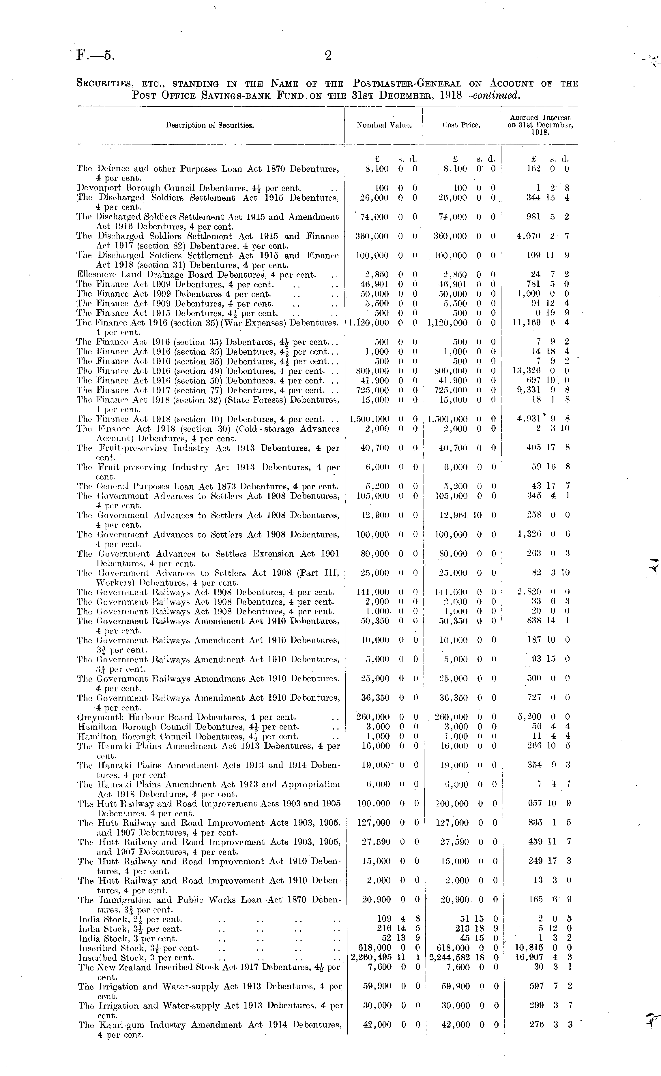 Description of Securities. Nominal Value. I < lost Price. Accrued Interest on 3lst December, 1918. , I £ s. (I. 8,100 0 0 C s. d. 8,100 o 0 £ s. ,1. 102 0 (I The Defence and other Purposes Loan Aet 1870 Debentures, 4 per cent. Dovonport Borough Council Debentures, 4J? per cent. The Discharged Soldiers Settlement Act 1915 Debentures, 4 per cent. 'The Discharged Soldiers Settlement Act 19.15 and Amendment Act 1916 Debentures, 4 per cent. The Discharged Soldiers Settlement Act 1915 and Binanco Aot 1917 (section 82) Debentures, 4 per cent. The Discharged Soldiers Settlement Act 1915 and Finance Act 1918 (section 31) Debentures, 4 per cent. Ellesmere Land Drainage Board Debentures, 4 per cent. .. The Finance Act 1909 Debentures, 4 per cent. .. The Finance Act 1909 Debentures 4 per cent. .. The Finance! Act 1909 Debentures, 4 per cent. .. The Pinanoe Act 1915 Debentures, i\ percent. .. .. | The Finance Act 1916 (section 35) (War Expenses) Debentures, 4 per cent. The Finance Act 1916 (section 35) Debentures, 41, per cent.. . The Finance Act 1916 (section 35) Debentures, 4J per cent.. . The Finance Act 1916 (section 35) Debentures, i\ per cent... The Finance Aet 1916 (section 49) Debentures, 4 per cent. . . The Finance Act 1916 (section 50) Debentures, 4 per cent. . . The Finance Aet 1917 (section 77) Debentures, 4 per cent. . . Thi! Finance Act 1918 (section 32) (State Forests) Debentures, 4 per cent. The Finance Act 1918 (section 10) Debentures, 4 per cent. . . The Finance Act 1918 (section 30) (Cold-storage Advances Account) Debentures, 4 per cent. Tin! Fruit-preserving Industry Aet 1913 Debentures, 4 per cent. The Fruit-preserving Industry Act 1913 Debentures, 4 per cent. The General Purposes Loan Act 1873 Debentures, 4 per cent. The Covernmcnt Advances to Settlers Act 1908 Debentures, 4 per cent. The Government Advances to Settlers Act 1908 Debentures, 4 per cent. The Government Advances to Settlers Act 1.908 Debentures, 4 per cent.. 'The Government Advances to Settlers Extension Act 1901 Debentures, 4 per cent. The Government Advances to Settlers Act 1908 (Part III, Workers) Debentures, 4 per cent. The Government Railways Act 1908 Debentures, 4 per cent. The Government Railways Act 1908 Debentures, 4 per cent. The Government Railways Act 1908 Debentures, 4 per cent. The Government Railways Amendment Aet 1910 Debentures, 4 per cent. The Government Railways Amendment Aet 1910 Debentures, 3J per cent. The Government Railways Amendment Act 1910 Debentures, 3| per cent. The Government Railways Amendment Act 1910 Debentures, 4 per cent. The Government Railways Amendment Act 1910 Debentures, 4 per cent, (ireyinouth Harbour Board Debentures, 4 per cent. Hamilton Borough Council Debentures, 4| per cent. Hamilton Borough Council Debentures, 4j percent. The Hauraki Plains Amendment Act 1913 Debentures, 4 per cent. Tb<! Hauraki Plains Amendment Acts 1913 and 1914 Debentures, 4 per cent. The Hauraki Plains Amendment Act 1913 and Appropriation Aet 1918 Debentures, 4 per cent. The Hutt Railway and Road Improvement Acts 1903 and 1905 I )ebentures, 4 per cent. The Hutt Railway and Road Improvement Acts 1903, 1905, and 1907 Debentures, 4 per cent. The Hutt Railway and Road Improvement Acts 1903, 1905, and 1907 Debentures, 4 per cent. The Hutt Railway and Road Improvement Act 1910 Debentures, 4 per cent. The Hutt Railway and Road Improvement Act .1910 Debentures, 4 per cent. The Immigration and Public Works Loan Aet 1870 Debentures, 3| per cent. India Stock, 21- per cent. India, Stock, 3i per cent. India Stock, 3 per cent. Inscribed Stock, 3J per cent. .. .. .. .. Inscribed Stock, 3 per cent. Tho New Zealand Inscribed Stock Act 1917 Debentures, 4| per cent. 'The Irrigation and Water-supply Act 1913 Debentures, 4 per cent. Tho Irrigation and Water-supply Act 1913 Debentures, 4 per cent. The Kauri-gum Industry Amendment Act 1914 Debentures, 4 per cent. 100 0 0 26,000 o o 74,000 0 0 360,000 0 0 100,000 0 0 2,850 0 0 46,901 0 0 50,000 0 0 5,500 0 0 I 500 0 0 1,1*20,000 o o 500 0 0 1,000 o o 500 0 0 800,000 0 0 41,900 o o 725,000 0 0 15,000 0 0 1.500,000 0 O 2,000 o o 40,700 0 0 6,000 o o 5,200 0 0 105,000 0 0 12,900 o o 100,000 0 0 80,000 0 0 25,(KM) 0 0 141,000 0 0 2,000 0 0 i.ooo o o 50,350 0 0 loo o o 20,000 0 0 74,000 0 0 300,000 0 0 100,000 0 0 2,850 0 0 40.901 0 0 ; 50,000 0 0 5,500 0 0 500 0 0 1 1,120,000 0 0 500 0 0 1 ,000 0 0 500 0 0 800,000 0 0 41., 900 0 0 725,000 0 0 15,000 0 0 1.500,000 0 0 2,000 0 0 ! I I 40,700 0 0 (i.ooo o o 5,200 0 0 105,000 0 0 12,984 to 0 100,000 0 0 so,ooo o o 25,000 0 0 141,000 0 0 2.000 0 0 I ,000 0 0 50,350 0 0 1 2 8 344 15 4 981 5 2 4,070 2 7 109 11 9 24 7 2 7S1 5 0 1,000 0 0 91 12 4 0 10 9 11,10!) 0 4 7 9 2 14 IS 4 7 9 2 ~ 13,320 0 0 697 I!) 0 9,331 9 8 15 I 8 4,931' 9 S 2 3 10 I 405 17 8 59 10 8 43 17 7 345 4 1 25S 0 0 1,326 o 6 203 0 3 82 3 10 2.820 0 0 33 6 3 20 0 0 838 14 I 10,000 o o 10,000 0 0 187 10 0 5,000 o o 5,000 0 0 03 15 0 25,000 0 0 25,000 0 0 500 0 (i 36,350 0 0 36,850 o 0 727 0 0 260,000 0 o 3,000 0 0 1,000 0 0 16,000 0 0 200,000 0 0 3.000 0 0 1,000 o o 16,000 0 0 5,200 0 0 50 4 4 114 4 200 10 5 19,000 0 0 19.000 0 0 354 9 3 6,000 0 0 6,000 o 0 7 4 7 100,000 0 0 100,000 0 0 ! 057 10 !) 127,000 0 0 127,000 0 0 835 1 5 27,590 0 0 27,590 0 0 459 11 7 15,000 0 0 15,000 0 0 249 17 3 2,000 0 0 2,000 0 0 13 3 0 20,900 0 0 20,900 o 0 165 0 9 109 4 S 216 14 5 52 13 9 618,000 0 0 2,260,495 II I 7,600 0 0 51 15 0 213 18 9 ! 45 15 0 618,000 0 0 2,244,582 18 0 ! 7,600 0 0 i 2 0 5 5 12 0 I 3 2 10,815 0 0 16,907 4 3 30 3 1 59,900 0 0 59,900 o 0 597 7 2 30,000 0 0 30,000 0 0 299 3 7 42,000 0 0 42,000 0 0 27(i 3 3