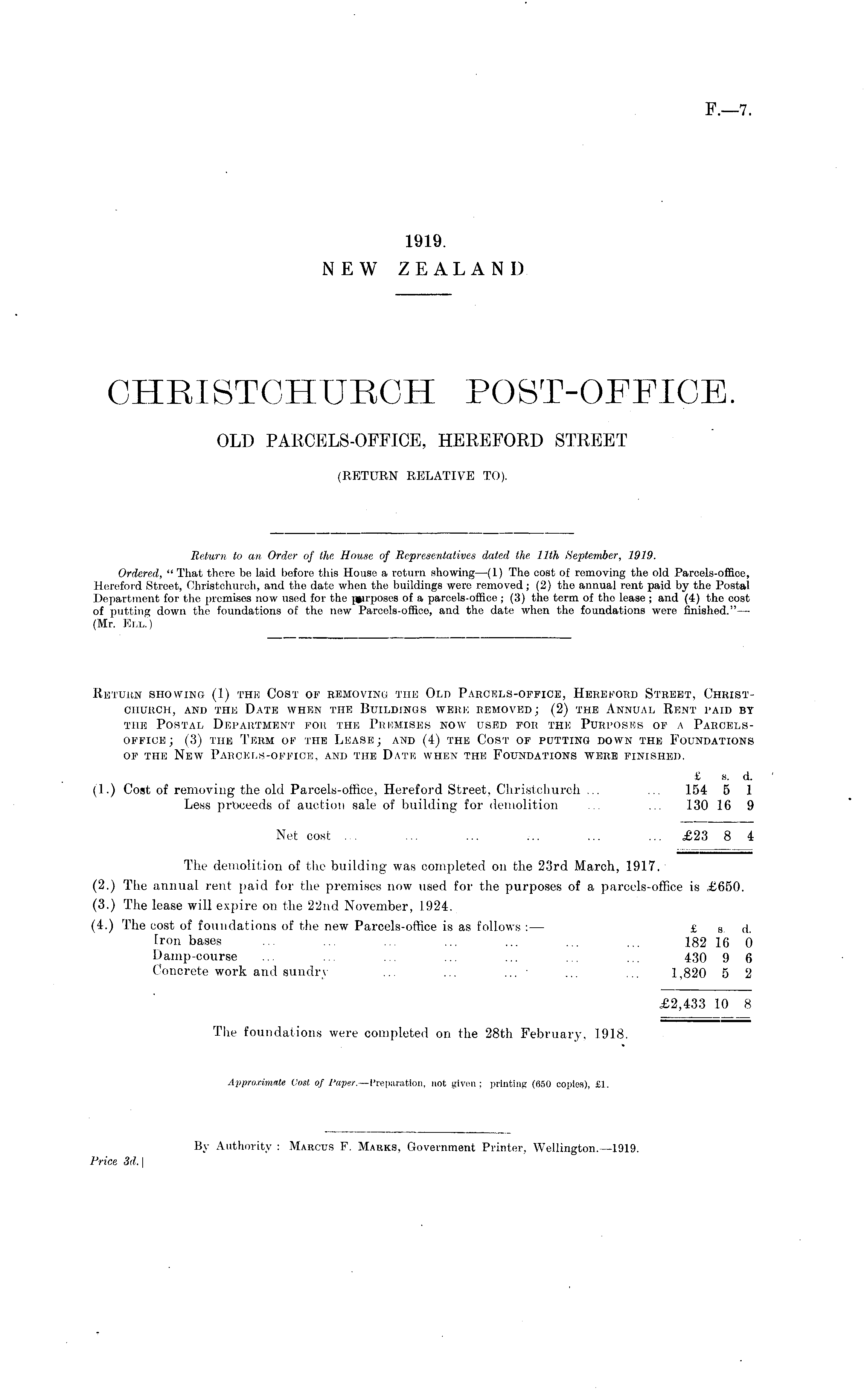 Return to an Order of the. House of Representatives dated the 11th September, 1919. Ordered, " That there be laid before this House a return showing—(l) The cost of removing the old Parcels-office, Hereford Street, Christchureh, and the date when tho buildings were removed; (2) tho annual rent paid by the Postal Department for the premises now used for the purposes of a parcels-office ; (3) the term of the lease ; and (4) the cost of putting down the foundations of the new Parcels-office, and the date when the foundations were finished."— (Mr. Ell.) I Return showing (1) the Cost of removing the Old Parcels-office, Hereford Street, Christchurch, and the Date when the Buildings were removed; (2) the Annual Rent paid by the Postal Department for the Premises now used for the Purposes of a Parcelsoffice; (3) the Term of the Lease; and (4) the Cost of putting down the Foundations of the New Parcels-office, and the Date when the Foundations were finished. £ s. d. (1.) Cost of removing the old Parcels-office, Hereford Street, Christchurch ... ... 154 5 1 Less proceeds of auction sale of building for demolition ... ... 130 16 9 Net cost ... ... ... ... ... ... £23 8 4 The demolition of the building was completed on the 23rd March, 1917. (2.) The annual rent paid for the premises now used for the purposes of a parcels-office is £650. (3.) The lease will expire on the 22nd November, 1924. (4.) The cost of foundations of the new Parcels-office is as follows :— £ s . ± Tron bases ... ... ... ... ... ... ... 182 16 0 Damp-course ... ... ... ... ... ... 430 9 6 Concrete work and sundry ... ... ... ■ ... ... 1,820 5 2 £2,433 10 8 The foundations were completed on the 28th February, 1918.