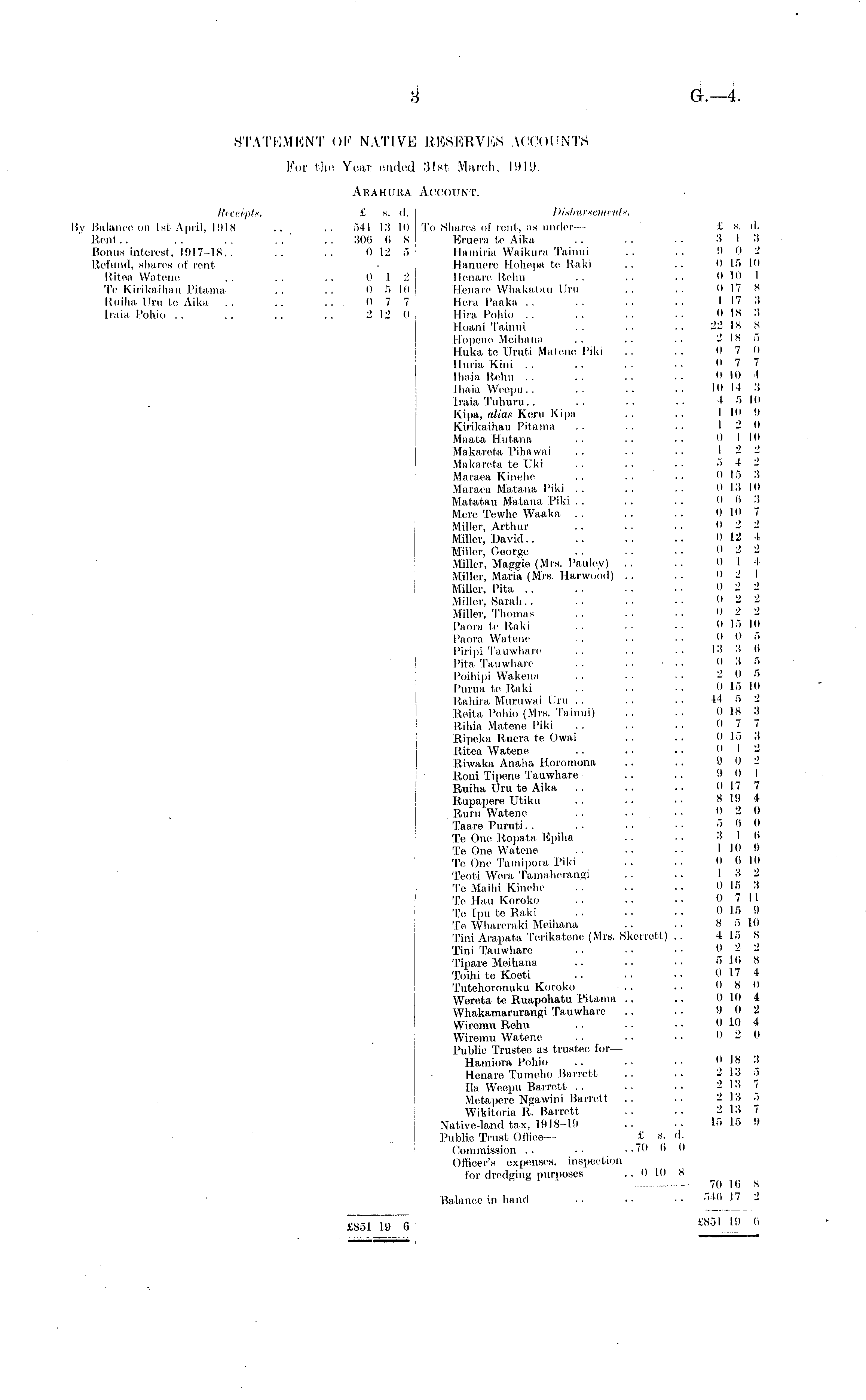 STATEMENT OF NATIVE RESERVES ACCOUNTS For Hie Yf.ar ended 3tsl March. L 919. A.RAHURA ACCOUNT. Receipts. C s. d. I Disbursements; By Balano Ist April, 1918 .. .. 541 13 10. To Shares of rent, as under £ s. d, Rant.. .. .. ..' .. 306 6 s 1 Eruera te Aika .. .. ■• 3 13 Bonus interest, 1917-18.. .. .. 0 12 5 Hamiria Waikura Tainui .. .. 9 0 2 Refund, ,shales nl rent — lianucre Hohepa te Raki .. .. 0 15 10 Ritea Watene .. .. .. 0 12 Henare Rehu .. .. .. (MO I Te Khikaihau Pitama .. .. o 5 10 Henare Whakatau Uru .. .. 0 17 8 Ruiha Uru te Aika .. .. .. o 7 7 Hera Paaka .. .. .. •• 1 17 3 Iraia Poliiu .. .. .. .. 2 12 0 Hira Pohio .. .. .. ■• 0 18 3 11 <>it 11 i Tainui .. .. .. 22 18 8 llopene Meiliana .. .. .. 2 18 5 lluka le Urnli Malrne I'iki .. .. (I 7 (I Huria Kini . . . . . . . . 0 7 7 lliaia Helm .. .. .. .. 0 10 4 Ihaiii Weepu.. .. .. •• 10 14 3 I raia Tiilinrii. . . . . . . . 4 5 10 Kipa, Mas Kern Kipa .. .. I 10 9 Kirikailian Pitama . ■ . • .. I 2 v Maala Hutana .. .. •• 0 1 10 Makareta Pihawai .. .. .. 12 2 Makareta le [Tki . . .. . • 5 4 2 Maraea Kinelie . . . . . . 0 15 3 Maraea iVlalana Piki . . . . . . 01310 Matatau Ma tana Piki . . . . . . 0 6 3 Mere Tewlie Waaka .. .. .. 0 10 7 Miller, Arthur .. .. .. 0 2 2 Miller, David.. .. .. .. 0 12 I Miller, George . . .. • • 0 2 2 Miller, Maggie (Mrs. Pauley) .. .. Oil Miller, Maria (Mrs. Harwood) .. .. 0 2 1 Miller. Pita . . . . . . • ■ 0 2 2 Miller, Sarah.. .. •■ ■■ o 2 2 Miller, Thomas . . .. .. 0 2 2 Paora le Raki .. •• •• 0 15 10 Paora Watene .. •• ■• 0 0 6 Piripi Tauwhitre . . . . . . 13 3 6 Pita Tanwhare . . . . • . . 0 3 5 Poihipi Wakena .. .. • • 2 0 8 Purua te Raki .. •. 0 15 10 Rahira Mnrnwai Uru .. .. ~ 44 5 2 .Reita Pohio (Mrs. Tainui) .. .. 0 18 3 Rihia Matene Piki .. .. •• 0 7 7 Ripeka Ruera te Owai .. .. 0 15 3 Ritea Watene .. .. .. 0 12 Riwaka Anaha tforomona .. .. 9 0 2 Roni Tipene Tauwhare .. .. 9 o I Ruiha Uru te Aika .. .. .. 017 7 Rupapere Utiku .. .. .. 8 19 I Ruru Watene . . .. . . 0 2 0 Taare Vuruti.. .. ■• •• f> » ° Te One Ropata Epiha .. . • 3 16 Te One Watene .. .. •• LlO 9 Te One Tamipora Piki .. • ■ 0 6 10 Teoti Wera Tamaherangi .. •• 13 2 Te Maihi Kinelie '. . .. 0 15 3 Te Man Koroko .. •• •• o 7 II Te l|iu te Raki .. •• ■• ( » lr > 8 Te Wliareraki Meiliana .. .. 8 5 10 Tini Arapata Terikatene (Mrs. Skerrett) .. 415 8 Tini Tauwharo .. • • • • 0 2 2 Tipare Meiliana .. .. • ■ 516 8 Toihi te Koeti . . .. •• 0 17 1 Tutehoronuku Koroko .. •• 0 8 0 Wereta te Ruapohatu Pitama .. .. o 10 4 Whakamarurangi Tauwhare .. .. 9 0 2 W'iieinu Rehu .. •• 0 10 4 Wiremu Watene .. .. .. 0 2 0 Public Trustee as trustee for — Hamiora Pohio .. • • • • " L ! Henare Tumeho Barrett .. .. 2 13 5 [la Weepu Barrett .. •■ •• 213 7 Metapere Nsawini Barrett .. .. 2 13 5 Wikitoria R. Barrett .. .. 213 7 Native-land tax, 1918-19 •■ ■• lr> lr » !) Public Trust OHiee £ «• d. Commission . . . . . .70 (i 0 Officer's expenses, inspection for dredging purposes . ■ o lo 8 70 16 s Balance in hand .. •• •■ 546 17 2 £851 19 6 *s.-,l l!l "