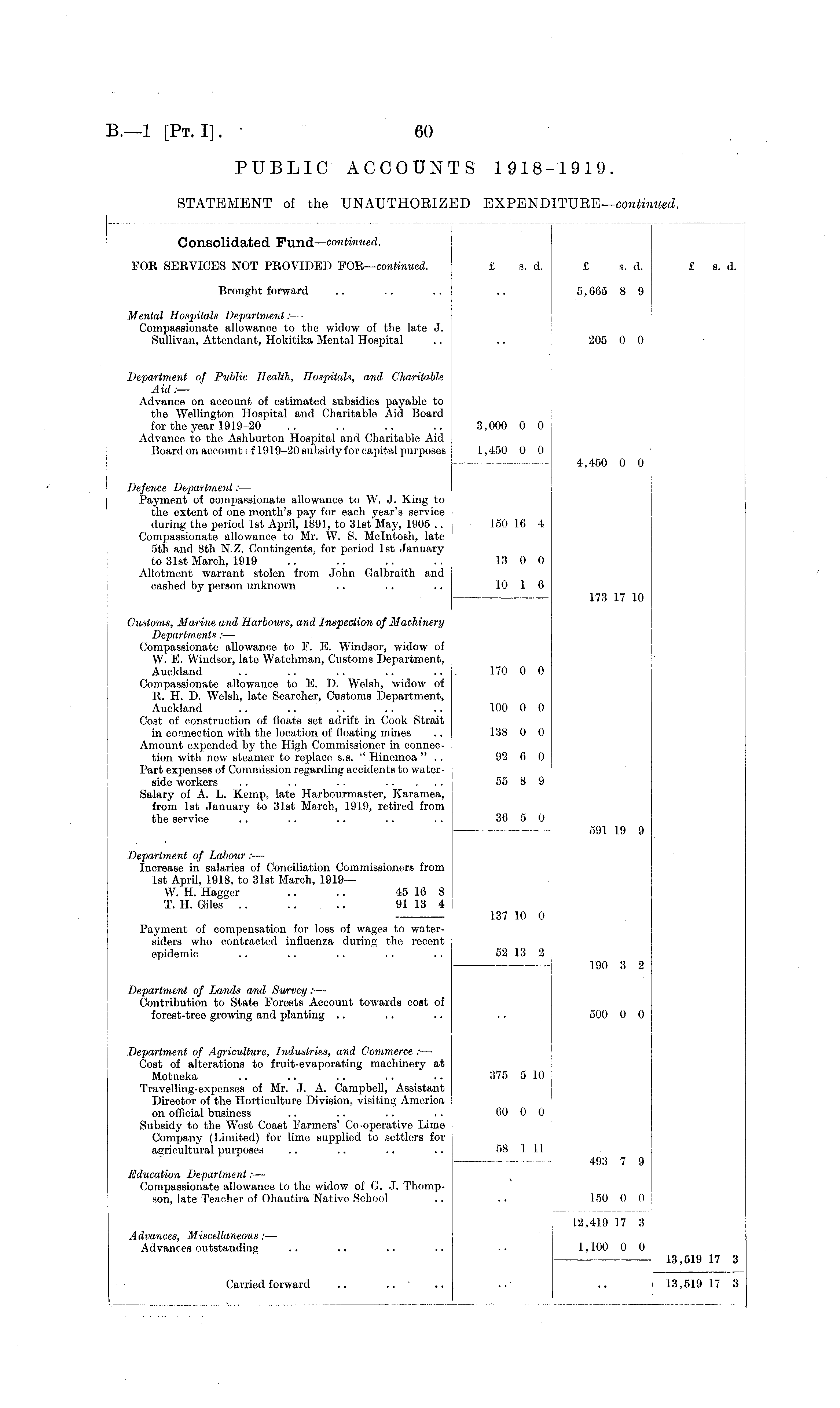 Consolidated Fund— continued. FOR SERVICES NOT PROVIDED FOR— continued. £ s. d. £ s. d. £ s. d. Brought forward 5,665 8 9 Menial Hospitals Department: — Compassionate allowance to the widow of the late J. Sullivan, Attendant, Hokitika Mental Hospital 205 0 0 Department of Public Health, Hospitals, and Charitable Aid: — Advance on account of estimated subsidies payable to the Wellington Hospital and Charitablo Aid Board for the year 1919-20 Advance to the Ashburton Hospital and Charitable Aid Board on account i f 1919-20 subsidy for capital purposes 3,000 0 0 1,450 0 0 4,450 0 0 Defence Department: — Payment of compassionate allowance to W. J. King to the extent of one month's pay for each year's service during the period 1st April, 1891, to 31st May, 1905 .. Compassionate allowance to Mr. W. S. Mcintosh, late 5th and 8th N.Z. ContingontSj for period 1st January to 31st March, 1919 Allotment warrant stolen from John Galbraith and cashed by person unknown 150 16 4 13 0 0 10 1 6 173 17 10 Customs, Marine and Harbours, and Inspection of Machinery Departments: — Compassionate allowance to F. E. Windsor, widow of W. E. Windsor, lato Watchman, Customs Department, Auckland Compassionate allowance to E. D. Welsh, widow of R. H. D. Welsh, late Searcher, Customs Department, Auckland Cost of construction of floats set adrift in Cook Strait in connection with the location of floating mines Amount expended by the High Commissioner in connection with new steamer to replace s.s. " Hinemoa " .. Part expenses of Commission regarding accidents to waterside workers .. . . .. Salary of A. L. Kemp, lato Harbourmaster, Karamea, from 1st January to 31st March, 1919, retired from the service 170 0 0 100 0 0 138 0 0 92 6 0 55 8 9 36 5 0 591 19 9 Department of Labour : — Increase in salaries of Conciliation Commissioners from 1st April, 1918, to 31st March, 1919— W. H. Hagger .. .. 45 16 8 T. H. Giles .. .. .. 91 13 4 137 10 0 Payment of compensation for loss of wages to water - siders who contracted influenza during the recent epidemic 52 13 2 Department of Lands and. Survey: — Contribution to State Forests Account towards cost of forest-tree growing and planting —i 190 3 2 500 0 0 Department of Agriculture, Industries, and Commerce : — Cost of alterations to fruit-evaporating machinery at Motueka Travelling-expenses of Mr. J. A. Campbell, Assistant Director of the Horticulture Division, visiting America on official business Subsidy to the West Coast Farmers' Co-operative Lime Company (Limited) for lime supplied to settlers for agricultural purposes 375 5 10 tit) 0 0 58 1 11 Education Department: — Compassionate allowance to the widow of G. J. Thompson, late Teacher of Ohautira Native School 493 7 9 150 0 0 Advances, Miscellaneous: — Advances outstanding 12,419 17 3 1,100 0 0 13,519 17 3 n„„~c,.A f~™,„..,i