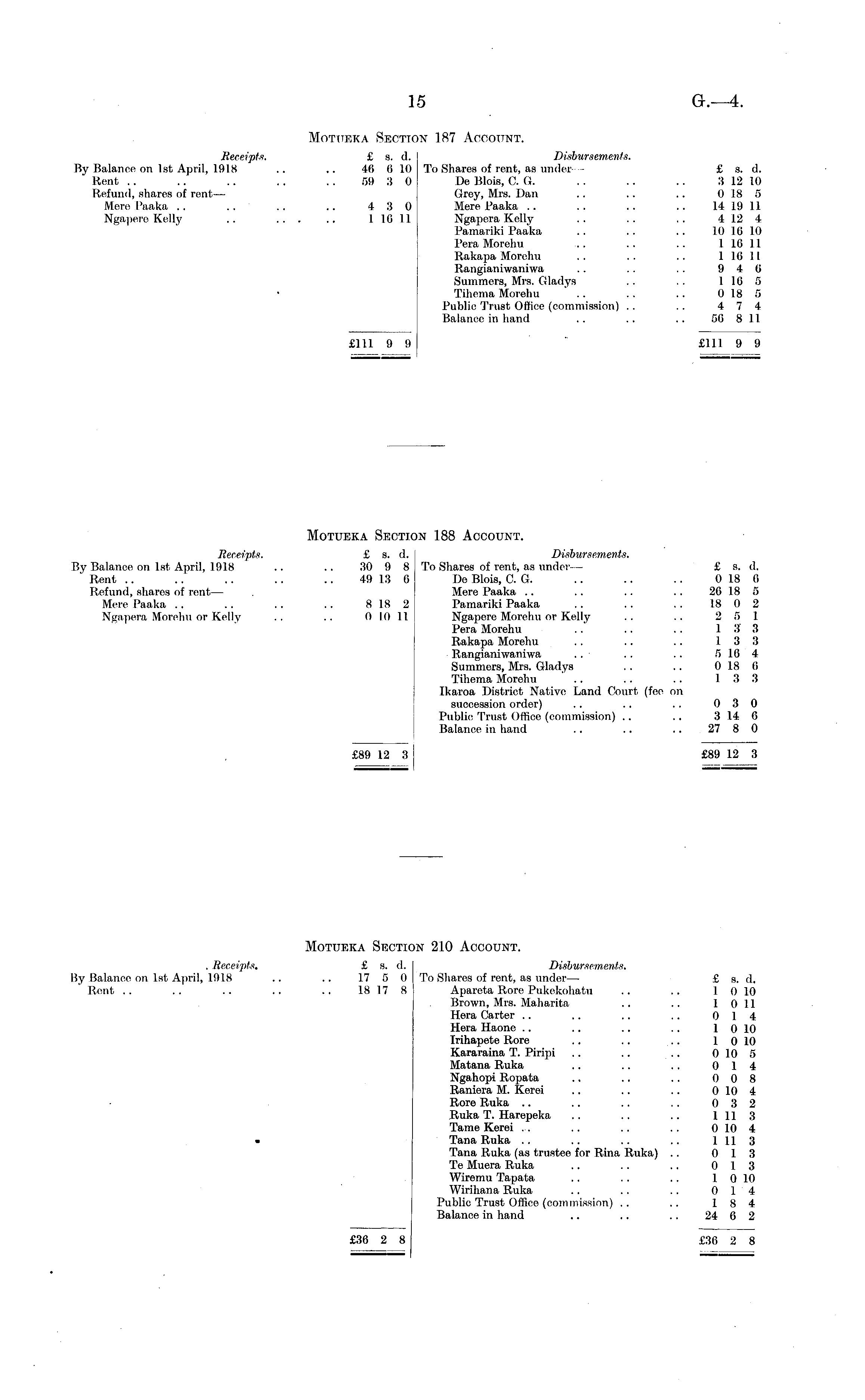 Motueka Section 187 Account. Receipts. £ s. d. Disbursements. By Balance on Ist April, 1918 .. .. 46 610 To Shares of rent, as under — £ s. d. Rent .. .. .. .. .. 59 3 0 De Blois, CO. .. .. .. 312 10 Refund, shares of rent— Grey, Mrs. Dan .. .. .. 018 5 Mere Paaka .. .. .. .. 430 Mere Paaka .. . . .. .. 14 19 11 Ngapero Kelly .. 1 16 11 Ngapera Kelly . . . . . . 4 12 4 Pamariki Paaka .. . . .. 10 10 10 PeraMorehu .. .. .. 1 10 11 Rakapa Morehu .. .. .. 1 16 11 Rangianiwaniwa .. .. .. 9 4 6 Summers, Mrs. Gladys .. .. 116 5 Tihema Morehu .. .. .. 0 18 5 Public Trust Office (commission) .. .. 4 7 4 Balance in hand .. .. .. 56 8 11 £111 9 9 £111 9 9 Motueka Section 188 Account. Receipts. £ s. d. Disbursements. By Balance on Ist April, 1918 .. .. 30 9 8 To Shares of rent, as under— £ s. d. Rent .. .. .. .. .. 49 13 0 De Blois, C. G. .. .. .. 0 18 6 Refund, shares of rent — . Mere Paaka .. .. .. .. 26 18 5 Mere Paaka .. .. .. .. 818 2 Pamariki Paaka .. .. . . 18 0 2 Ngapera Morehu or Kelly .. .. 0 10 11 Ngapere Morehu or Kelly .. .. 2 5 1 Pera Morehu .. .. . . 1 3' 3 Rakapa Morehu . . .. .. 13 3 Rangianiwaniwa . . ■ . . .. 5 16 4 Summers, Mrs. Gladys . . .. 018 6 Tihema Morehu ' .. .. .. 13 3 Ikaroa District Native Land Court, (fee on succession order) .. .. . . 0 3 0 Public Trust Office (commission) . . .. 3 14 6 Balance in hand .. .. .. 27 8 0 £89 12 3 £89 12 3 Motueka Section 210 Account. . Receipts. £ s. d. Disbursements. By Balance on Ist April, 1918 .. .. 17 5 0 To Shares of rent, as under— £ s. d. Rent .. .. .. .. .. 18 17 8 Apareta Rore Pukekohatu .. .. 1 0 10 Brown, Mrs. Maharita .. .. 1 0 11 Hera Carter .. ~ .. .. 0 14 Hera Haone .. .. .. .. 1 0 10 Trihapote Rore .. .. .. 1 010 Kararaina T. Piripi .. .. .. 0 10 5 Matana Ruka .. .. .. 0 14 Ngahopi Ropata .. .. . . 0 0 8 Raniera M. Kerei .. .. .. 010 4 Rore Ruka .. .. .. . . 0 3 2 Ruka T. Harepeka .. .. .. 1113 Tame Kerei .. .. .. . . 010 4 Tana Ruka . . .. .. .. 1113 Tana Ruka (as trustee for Rina Ruka) . . 0 13 Te Muera Ruka .. .. .. 0 13 Wiremu Tapata .. . . .. I 010 Wirihana Ruka . . .. . . 0 14 Public Trust Office (commission) . . .. 18 4 Balance in hand .. .. .. 24 6 2 £36 2 8 £36 2 8