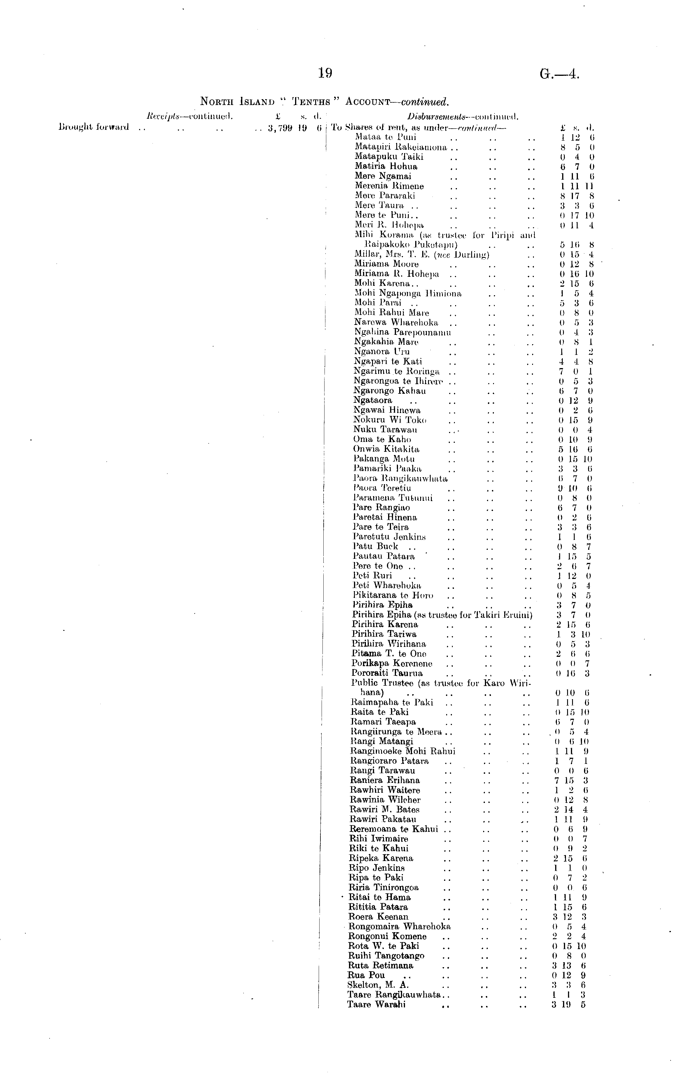 North Island ',' Tenths " Account— continued. Receipts —continued, £ s. d. Disbursements—continued. Brought forward .. .. .. .. 3,799 19 6 To Shares of rent, as under— continued— £ s. d. Mataa te Puni . . . . . . 1 12 0 Matapiri Bakeiamona .. .. .. 8 5 0 Matapuku Taiki .. .. .. 0 4 0 Matiria Hohua .. .. .. 0 7 0 Mere Ngamai .. .. .. 1 11 0 Merenia, Rimene .. .. .. 1 11 11 Mere Pararaki .. . . . . 8 17 8 Mere Taura . . , . . . . . 3 3 (i Mere te Puni. . . . . . . . 0 17 10 Meri R. Hohepa . . . . . . 0 114 Mihi Koraina (as trustee lor Piripi and Raipakoko Puketapu) .. .. 5 1(1 8 Millar, Mrs. T. E. (nee Durling) .. 0 15 4 Miriania Moore .. .. .. 012 8 Miriama R. Hohepa .. .. .. 0 10 10 Mohi Karena. . .. .. .. 2 15 0 Mohi Ngaponga Himiona .. .. 15 4 Mohi Parai . . .. .. .. 5 3 0 Mohi Rahui Mare . . .. .. 0 8 0 Narewa Wharehoka . . . . . . 0 5 3 Ngahina Parcpoiinaniu . . . . 0 4 3 Kgakahia Mare .. .. .. 0 8 1 Nganora Uru .. .. . . 112 Ngapari te Kati .. .. .. 4 18 Ngarimu te Roringa .. .. .. 7 0 1 Ngarongoa te Ihircre .. .. .. 0 5 3 Ngarongo Kahau .. .. .-. 0 7 0 Ngataora .. .. .. . . 012 9 Ngawai Hincwa .. .. .. (12 0 Nokuru Wi Toko . . . . .. 0 15 0 Nuku Tarawau ... . . . . 004 Ornate Kaho . . .. . . 0 10 0 Onwia Kitakita .. .. .. 5 Hi (i Pakanga Motu .. .. .. 0 15 10 Pamariki Paaka .. .. .. 3 3 (i Paora Bangikaiiwhata .. .. 0 7 0 Paora Teretiu . . .. . . 9 10 0 Paramena Tutunui .. .. .. 0 8 0 Pare Rangiao .. .. .. 0 7 0 Parotai Hinena . . . . . . 0 2 0 I 'are te Teira .. .. .. 3 3 0 Paretutu Jenkins .. .. . . 110 I'atu Buck .. . . . . . . 0 8 7 Pautau Patara . . .. .. 115 5 Pere, te One . . . . . . . . 2 0 7 Peti Ruri .. .. . . . . 112 0 Poti Wharehoka . . . . . . 0 5 4 Pikitarana te Horo .. .. .. 0 8 5 Pirihira Ejiiha . . . . . . 3 7 0 Pirihira Epiha (as trustee for Takiri Eruiui) 3 7 0 Pirihira Karena .. .. .. 2 15 0 Pirihira Tariwa . . .. . . I 3 10 Pirihira Wirihana . . .. . . 0 5 3 Pitama T. to One . . .. .. 2 0 0 Porikapa Koronone .. .. .. o o 7 Pororaiti Taurua .. .. .. 0 10 3 Public Trustee (as trustee for Karo Wirihana) . . . . . . . , 0I 0 (i Raimapaha te Paki .. .. .. 1110 Raita te Paid .. .. .. 0 15 10 Ramari Taeapa . . .. .. li 7 0 Rangiirunga te Meera .. .. .. .054 Hangi Matangi .. .. .. o li lo Rangimoeke Mohi Rahui .. . . 1119 Rangioraro Patara .. . . .. 17 1 Raugi Tarawau .. .. . . 0 0 0 Raniera Erihana .. . . . . 7 15 3 Rawhiri Waitere .. .. .. 12 0 Rawinia Wileher .. .. ~ 0 12 8 Rawiri M. Bates .. .. .. 2 14 4 Rawiri Pakatau .. .. ~ 1110 Reremoana te Kahui .. .. .. 0 0 0 Ribi Iwimaire .. .. .. 0 0 7 Riki te Kahui .. .. .. 0 9 2 Ripeka Karena, .. .. .. 215 0 Ripo Jenkins .. .. .. 1 I o Ripa te Paki .. .. .. 0 7 2 Riria Tinirongoa .. .. .. 0 0 li ■ Ritai te Hama .. .. .. I I I o Rititia Patara .. .. . . 1 15 0 Roera Keen an .. . . . . 312 3 Rongomaira Wharehoka .. .. 0 5 4 Rongonui Komene .. .. .. 2 2 4 Rota W. te Paki .. .. .. 015 10 Ruihi Tango tango .. .. .. II 8 0 Ruta Retimana .. .. .. 3 13 6 Rua Pou .. .. .. .. 0 12 9 Skelton, M. A. .. .. .. 3 3 0 Taare Rangikauwhata. . .. .. 113 Taare Waralii .. .. .. 3 19 5