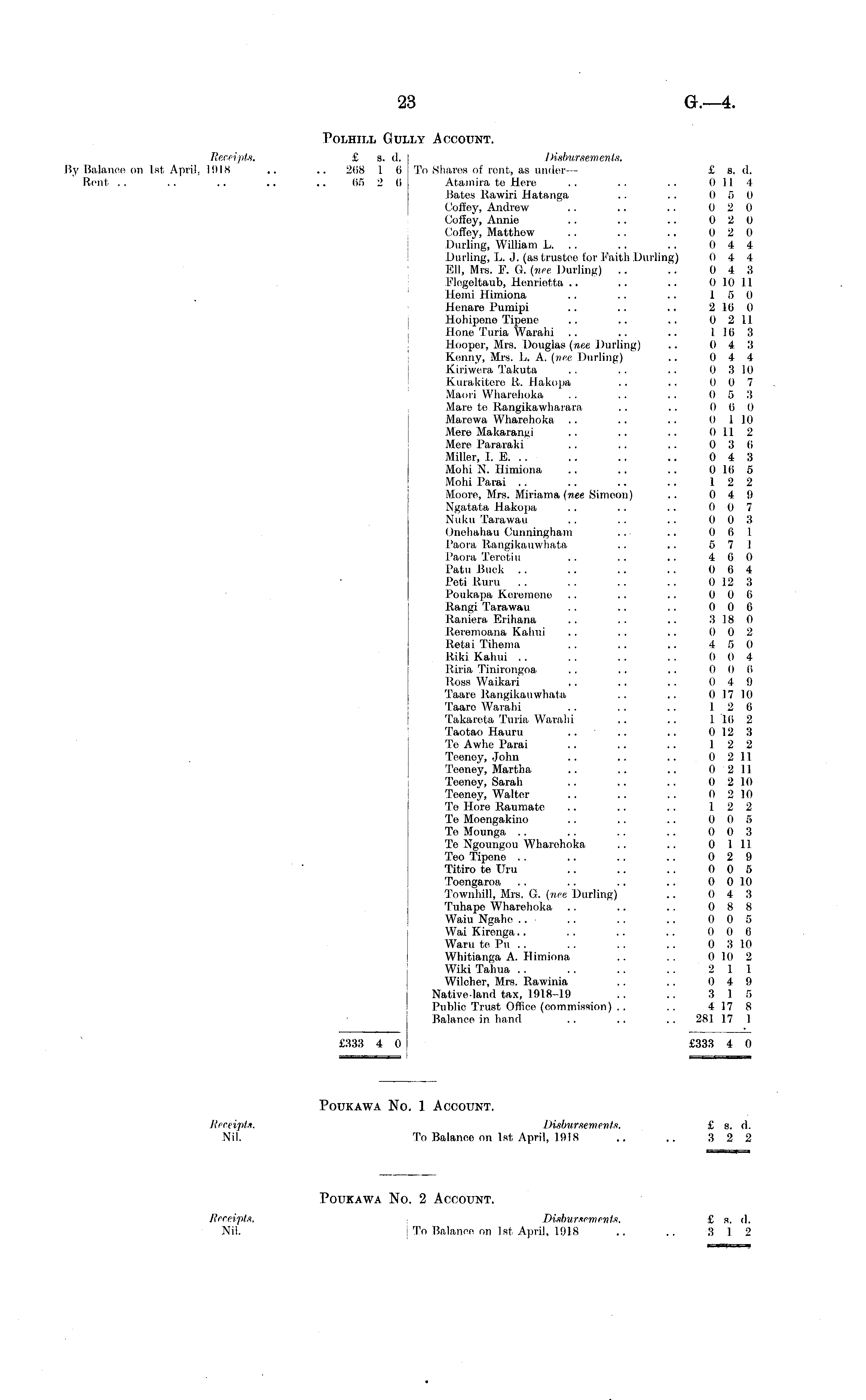 Polhill Gully Account. Receipts. £ s. d. Disbursements. By Balance on Ist April, 1918 .. .. 208 1 0 To Shares of rent, as under— £ s. d. Rent .. .. .. .. .. 05 2 0 Atamira te Here .. .. .. 0 11 4 Bates Rawiri Hatanga .. .. 0 5 0 Coffoy, Andrew .. .. .. 0 2 0 Coffey, Annie .. .. .. 0 2 0 Coffey, Matthew .. .. .. 0 2 0 Durling, William L. .. .. .. 0 4 4 Durling, L. J. (as trustee for Faith Durling) 0 4 4 Ell, Mrs. F. G. (nee Durling) .. .. 0 4 3 Elegeltaub, Henrietta .. .. .. 0 10 11 Hemi Himiona .. .. .. 15 0 Henare Pumipi .. .. .. 216 0 Hohipene Tipene .. .. .. 0 2 11 Hone Turia Warahi .. .. .. I 10 3 Hooper, Mrs. Douglas (nee Durling) .. 0 4 3 Kenny, Mrs. L. A. (nee Durling) .. 0 4 4 Kiriwera Takuta .. .. .. 0 3 10 Kurakitore R. ilakopa .. .. 0 0 7. Maori Wharehoka .. .. .. 0 5 3 Mare to Rangikawharara . . .. 0 (i 0 Marewa Wharehoka .. .. .. 0 I 10 Mere Makaranfj .. .. .. 0 112 Mere Pararalri .. .. .. 0 3 0 Miller, I. E. .. .. .. .. 0 4 3 Mohi N. Himiona .. .. .. 0 10 5 Mohi Parai .. .. .. .. 12 2 Moore, Mrs. Miriama (nee Simeon) .. 0 4 9 Ngatata Hakopa .. .. .. 0 0 7 Nuku Tarawau .. .. .. 0 0 3 Onehahau Cunningham .. .. 0 0 1 Paora Rangikauwhata .. .. 5 7 1 Paora Tcret iv .. .. .. 4 0 0 Patu Buck .. .. .. .. 0 0 4 Peti Rum . . . . .. .. 0 12 3 Poukapa Keremene .. .. .. 0 0 0 Rangi Tarawau .. .. .. 0 0 0 Raniera, Eriliana .. .. .. 3 18 0 Reremoana Kahui .. .. .. 0 0 2 Retai Tihema .. .. .. 4 5 0 Riki Kahui .. .. .. . . 0 0 4 Riria Tinirongoa .. .. .. 0 0 0 Ross Waikari .. .. .. 0 4!) Taare Rangikauwhata .. .. 0 17 10 Taare Warahi .. .. .. 12 6 Takareta Turia Warahi .. .. 1 16 2 Taotao Hauru .. .. .. 0 12 3 Te Awhe Parai .. .. .. 12 2 Teeney, John .. .. .. 0 211 Teeney, Martha, .. .. .. 0 2 11 Teenov, Sarah .. .. .. 0 2 10 Teeney, Walter .. .. .. 0 2 10 To Here Raumate .. .. .. 12 2 To Moengakino .. .. .. 0 0 5 Te Motinga .. . . .. .. 0 0 3 Te Ngoungou Wharehoka .. .. 0 111 Teo Tipene . . .. .. .. 0 2 9 Titiro te Uru .. .. .. 0 0 5 Toengaroa . . .. .. .. 0 010 Townhill, Mrs. G. (nee Durling) .. 0 4 3 Tuhape Wharehoka .. .. .. 0 8 8 Waiu Ngahe .. .. .. .. 005 Wai Kirenga.. .. .. .. 0 0 0 Warn te Pu .. .. .. .. 0 3 10 Whitianga A. Himiona .. .. 0 10 2 Wiki Tahua .. .. .. .. 2 11. Wilcher, Mrs. Rawinia .. .. 0 4 9 Native-land tax, 1918-19 .. .. 3 1 5 Public Trust Offioe (commission) . . .. 4 17 8 Balance in hand . . . . . . 281 17 1 £333 4 0 £333 4 0 Poukawa No. I Account. Receipts. Disbursements. £ s. d. Nil. To Balance on Ist April, 1018 .. .. 3 2 2 Poukawa No. 2 Account. Receipts, Disbursements. £ s. <|. Nil. To Balance on Ist April, 1918 .. .. 3 12