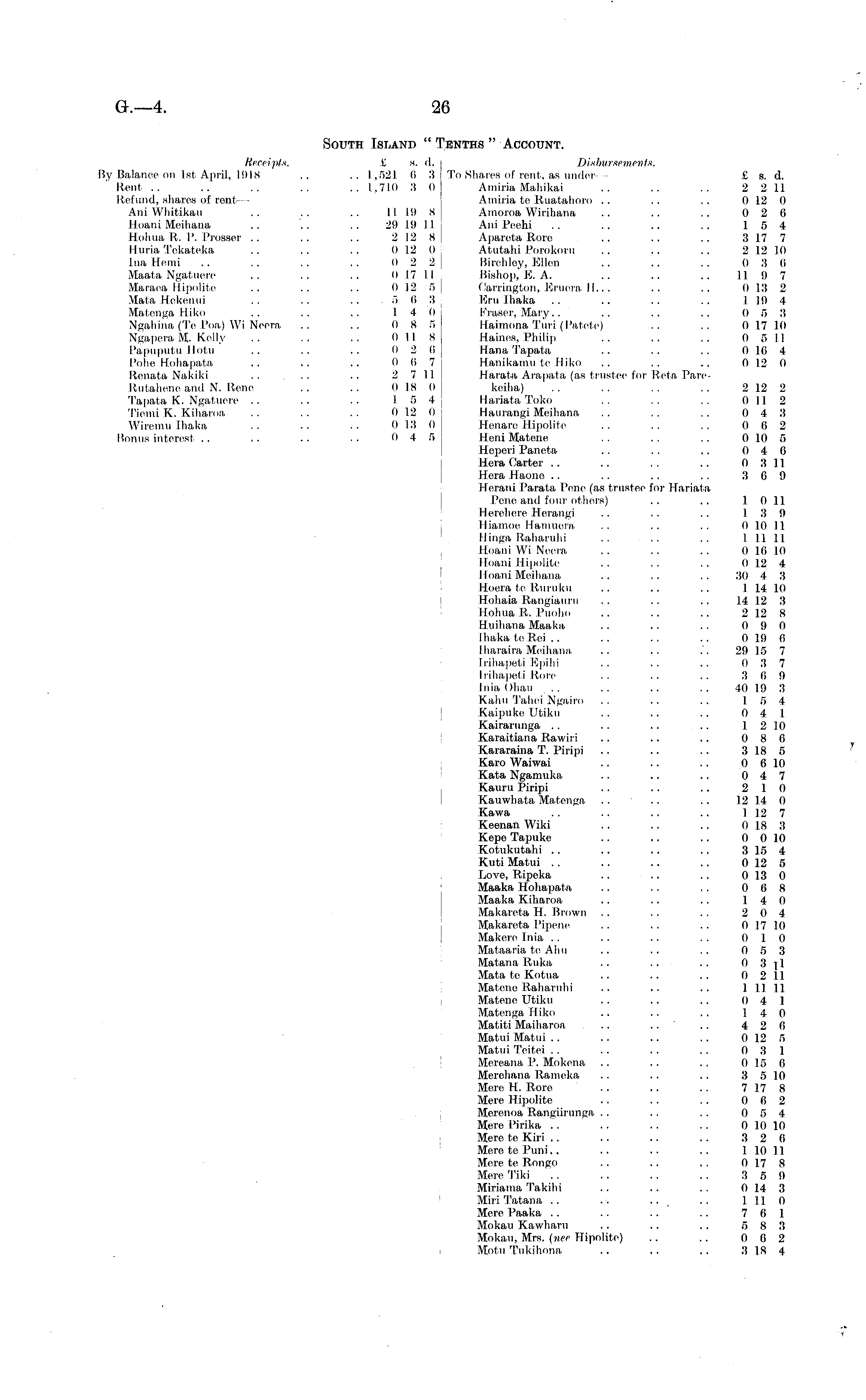 South Island " Tenths " Account. Receipts. £ s. d. Disbursements. By Balance on Ist April, 1918 .. ..1,521 (i 3 To Shares of rent, as under — £ s. d. Bent .. .. .. .. .. 1.710 3 0 Anuria Mahikai .. .. .. 2 2 11 Refund, shares of rent— Anuria te Ruatahoro .. . . . . 0 12 0 Ani Whitikau .. .. .. II 19 s Amoroa Wirihana .. .. .. 0 2 6 Hoani Meihana .. '.. .. 29 19 I I Ani Peehi .. .. .. .. 15 4 Hohua R. P. Prosser .. .. .. 2 12 8 Apareta Rore .. .. .. 3 17 7 Huria Tekateka .. .. .. 0 12 0 Atutahi Porokoru .. .. .. 2 12 10 Ina Hemi .. . . . . .. 0 2 2 Birchley, Ellen .. .. .. 0 3 0 Maata Ngatuere .. .. .. 017 I I Bishop,' E. A. .. .. .. 11 9 7 Maraea Hipolite .. .. .. 0 .12 5 Carrington, Eruera. 11... .. .. 0 13 2 Mata Hekeuui .. .. ..-503 Eru Ihaka .. .. .. .. I 19 4 MfttengaHiko .. .. .. 14 0 Fraser, Mary.. .. ' .. .. 0 5 3 Ngahina (Te Poa) Wi Neera .. .. 0 8 5 Haimona Turi (Patete) .. .. 017 10 Ngapera M. Kelly .. .. .. 0 11 8 Haines, Philip .. .. .. 0 5 11 Papuputu Ilotu .. . . . . 0 2 6 Hana Tapata .. .. .. 0 16 4 Potte Hohapata .. .. .. 0 0 7 Hanikamu te Hiko .. .. .. 012 0 Ronata Nakiki .. .. .. 2 7 11 Ilarata Arapata (as trustee for Rota PareRutahene and N. Rene .. .. 0 18 I) keiha) .. .. .. .. 2 12 2 Tapata K. Ngatuere .. .. .. 15 4 Hariata Toko .. .. .. 0 11 2 Tiemi K. Kiharoa .. .. .. 0 12 0 Haurangi Meihana .. .. .. 0 4 3 Wiremu Ihaka .. .. .. 0 13 (I Henare Hipolite .. .. .. 0 0 2 Bonus interest .. . . .. . . 0 4 5 Heni Matene . . . . . . 010 5 Heperi Paneta .. . . .. 0 4 6 Hera Carter .. .. .. .. 0 3 11 Hera Haone .. .. .. .. 3 6 9 llerani Parata Pcne (as trustee for Hariata Pone and four others) .. .. 1 0 11 Herehere Hcrangi .. .. .. 13 9 lliamoe Hamuera, .. .. .. 0 10 11 Hinga Raharuhi . . . . . . I 11 11 11 nan iWi Neera . . .. . . 010 10 Hoani Hipolite .. . . .. 012 4 Hoani Meihana .. .. .. 30 4 3 Hoera te Ruruku .. .. .. 1 14 10 Hohaia Rangiauru .. .. .. 14 12 3 Hohua R. Puoho .. .. .. 212 8 lluihana Maaka .. .. .. 0 9 0 Ihaka te Rei .. .. .. .. 0 19 fi I haraira Meihana .. .. .'. 29 15 7 Irihapeti Epilii .. .. .. 0 3 7 hihapeli Rore .. .. .. 3 (i 9 Inia. Ohau ... .. .. . . 40 19 3 Kahu Tahei Ngairo .. .. .. 1 5 4 Kaipuke Utiku .. .. .. 0 4 1 Kairarunga .. .. .. .. 12 10 Karaitiana Rawiri .. .. .. 0 8 0 Kararaina T. Piripi .. .. .. 318 5 Karo Waiwai .. .. .. 0 6 10 Kata Ngamuka .. .. .. 0 4 7 Kauru Piripi .. . . .. 2 10 Kauwhata Matenga, .. .. .. 12 14 0 Kawa . . .. .. .. 1 12 7 Keenan Wiki .. .. .. 0 18 3 Kepe Tapuke .. .. .. 0 010 Kotukutahi . . .. .. .. 3 15 4 Kuti Matui . . .. .. .. 0 12 5 Love, Ripeka .. .. .. 013 0 Maaka Hohapata .. .. .. 0 6 8 Maaka Kiharoa .. .. .. 14 0 Makareta H. Brown .. . . . . 2 0 4 Makareta Pipene .. .. .. 0 17 10 Makere Inia . . .. .. .. 0 10 Mataaria te Aim .. .. .. 0 5 3 Matana Ruka .. .. .. 0 3]l Mata te Kotua .. .. .. 0 2 11 Matene Raharuhi .. .. . . 1 11 11 Matene Utiku .. .. .. 0 4 1 Matenga Hiko .. . . .. 14 0 Matiti Maiharoa ... .. .. 426 Matui Matui . . .. .. .. 0 12 5 Matui Teit.ei .. . . .. .. 0 3 1 Mereana P. Mokena .. .. .. 015 0 Merehana Rameka .. .. .. 3 5 10 Mere H. Rore .. .. .. 717 8 Mere Hipolite .. . . .. 0 6 2 Merenoa Rangiirunga . . . . . . 0 5 4 Mere Pirika . . .. .. .. 0 10 10 Mere te Kiri . . . . .. .. 3 2 6 Mere te Puni.. .. .. .. 1 10 11 Mere te Rongo . . .. .. 017 8 Mere Tiki . . .. .. . . 3 5 9 Miriama Takihi .. .. .. 0 14 3 Miri Tatana .. . . .. .. 1110 Mere Paaka .. . . .. .. 7 6 1 Mokait Kawharu . . .. .. 5 8 3 Mokau, Mrs. (nee Hipolite) .. .. 0 6 2 Motu Tukihona .. , . ~ 3IS 4