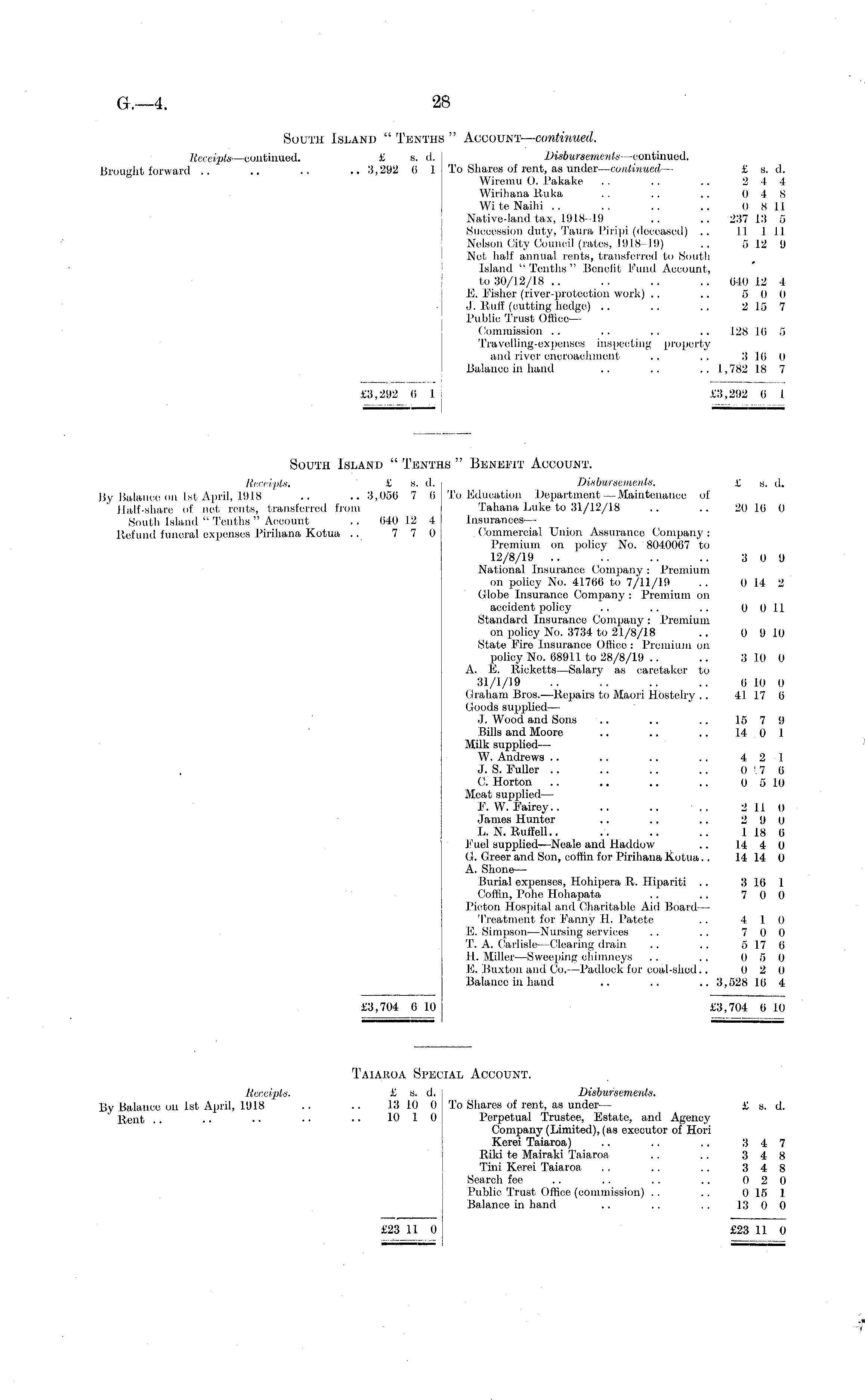 South Island " Tenths " Account — continued. Receipts— oontinued. £ s. d, Disbursements -continued. Brought forward .. .. .. .. 3,292 (i 1 To Shaies of rent, as under— continued — £ s. d. Wiremu 0. Pakake . . . . . . 2 4 4 Wirihana Ruka . . .. .. 0-18 Wi te Naihi .. . . .. .. 0 8 11 Native-land tax, 1918 19 .. .. 237 13 5 Succession duty, Taura Piripi (deceased) .. 11 1 11 Nelson City Council (rates, 1918 19) .. 5 12 9 Not half annual rents, transferred to South Island "Tenths" Benefit Fund Account, to 30/12/18 .. .. .. 040 12 4 E. Fisher (river-protection work) .. .. 5 0 0 J. Ruff (cutting hedge) .. .. .. 2 15 7 Public Trust Office— Commission .. .. .. .. 128 10 5 Travelling-expenses inspecting property and river encroachment .. .. 3 10 0 Balance in hand .. .. .. 1,782 18 7 £3,292 0 I £3,292 0 1 I ; — South Island " Tenths " Benefit Account. Receipts. £ s. tl. Disbursements. £ g. d. By Balance on Ist April, 1918 .. .. 3,050 7 (i To Education Department — Maintenance of Half-share of net rents, transferred from Tahana Luke to 31/12/18 .. .. 20 10 0 South Island " Tenths " Account .. 040 12 4 Insurances — Refund funeral expenses Pirihana Kotua .. 7 7 0 Commercial Union Assurance Company : Premium on policy No. 8040007 to 12/8/19 .. '.. .. .. 3 0 9 National Insurance Company : Premium on policy No. 41700 to 7/11/19 . . 0 14 2 Globe Insurance Company : Premium on accident policy .. .. .. 0 011 Standard Insurance Company : Premium on policy No. 3734 to 21/8/18 .. 0 9 10 State Eire Insurance Office : Premium on policy No. 6891.1. to 28/8/19 .. .. 3 10 0 A. E. Ricketts—Salary as caretaker to 31/1/19 .. '.. .. .. 0 1.0 0 Graham Bros.—Repairs to Maori Hostelry .. 41 17 0 Goods supplied— J. Wood and Sons •.. .. .. 15 7 9 Bills and Moore .. .. .. 14 0 1 Milk supplied— W. Andrews .. .. .. .. 4 2 1 J. S. Puller .. .. .. .. 0 L 7 6 C. Horton .. .. .. .. 0 510 Meat supplied' — E. W. Fairey.. .. .. .. 2 110 James Hunter .. .. .. 2 9 0 L. N. Ruff ell.. .. .. .. 1 18 0 Fuel supplied—Neale and Haddow .. 14 4 0 0. Oreer and Son, coffin for Pirihana Kotua.. 14 14 0 A. Shone— Burial expenses, Hohipera R. Hipariti .. 3 16 1 Coffin, Pohe Hohapata .. .. 7 0 0 Picton Hospital and Charitable Aid Board — Treatment for Fanny H. Patete .. 4 1 (I E. Simpson—Nursing services . . . . 7 0 0 T. A. Carlisle —Clearing drain .. .. 5 17 6 H.Miller—Sweeping chimneys .. .. 0 5 0 E. Buxton and Co. —Padlock for coal-shod.. 0 2 0 Balance in hand .. .. .. 3,528 10 4 £3,704 6 10 £3,704 0 10 Taia.uoa Special Account. Receipts. £ s. d. Disbursements. By Balance on Ist April, 1918 .. .. 13 10 OTo Shares of rent, as under — £s. d. Rent .. .. • ■ • • • • 10 1 0 Perpetual Trustee, Estate, and Agency Company (Limited), (as executor of Hori Kerei Taiaroa) .. .. .. 3 4 7 Riki te Mairaki Taiaroa .. .. 3 4 8 Tini Kerei Taiaroa .. .. .. 3 4 8 Search fee .. .. . . .. 0 2 0 Public Trust Office (commission) .. .. 0 15 1 Balance in hand .. .. .. 13 0 0 £23 11 0 £23 11 0