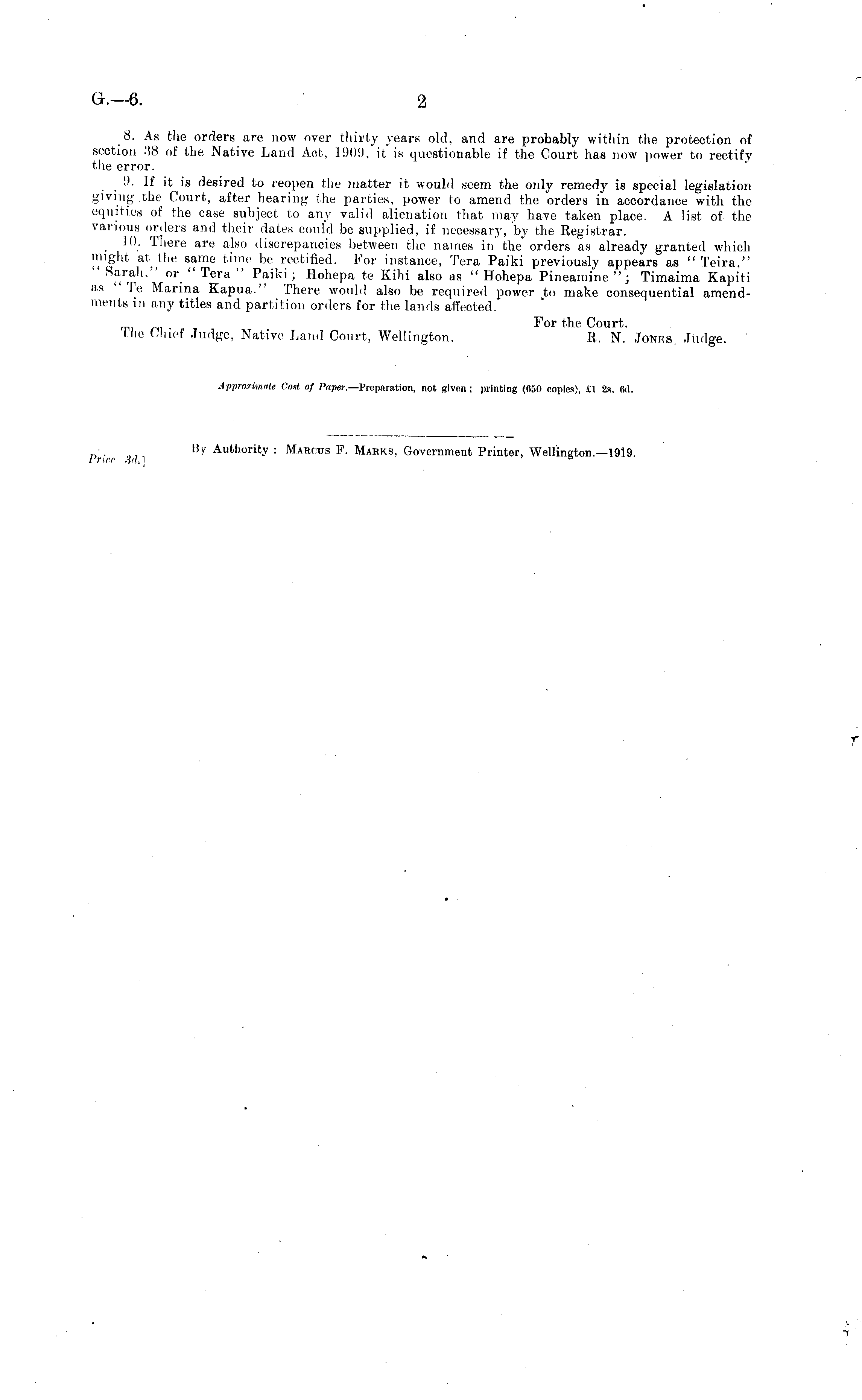 8. As the orders are now over thirty years old, and are probably within the protection of section 38 of the Native Land Act, 1909,'it is questionable if the Court has now power to rectify the error. 9. If it is desired to reopen the matter it would seem the only remedy is special legislation giving the Court, after hearing the parties, power to amend the orders in accordance with the equities of the case subject to any valid alienation that may have taken place. A list of the various orders and their dates could be supplied, if necessary, 'by the Registrar. 10. There are also discrepancies between the names in the" orders as already granted which might at the same time be rectified. For instance, Tera Paiki previously appears as " Teira." Sarah," or " Tera " Paiki; Hohepa te Kihi also as "Hohepa Pineamine"; Timaima Kapiti as ■' Te Marina Kapua." There would also be required power to make consequential amendments in any titles and partition orders for the lands affected. r[l For the Court. Lhe Chief Judge, Native Land Court, Wellington. R. N. Jones Judge.