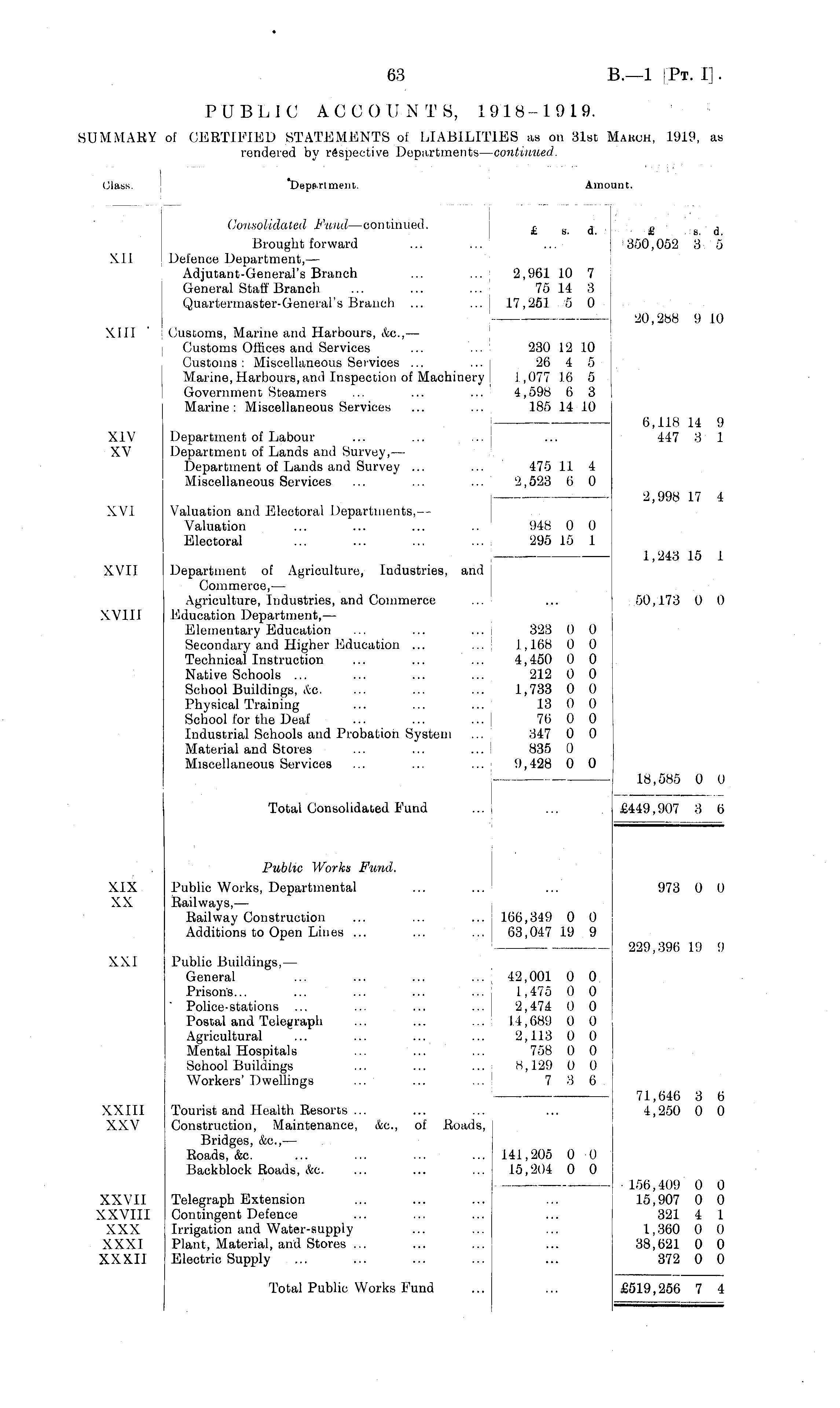 Class. Department. Amoi lit. Consolidated Fund —continued. s d Brought forward Defence Department, — Adjutant-General's Branch ... ...| 2,961 10 7 General Staff Branch ... ... ... ! 75 14 3 Quartermaster-General's Branch ... ... 17,251 5 0 ' Xli £ . s. d. 350,052 3 5 20,288 9 10 Customs, Marine and Harbours, &c., — Customs Offices and Services ... ... j 230 12 10 Customs: Miscellaneous Services ... ... ! 26 4 5 Marine, Harbours, and Inspection of Machinery 1,077 16 5 Government Steamers ... ... ... 4,598 6 3 Marine: Miscellaneous Services ... ... 185 14 10 Department of Labour Department of Lands and Survey,— Department of Lands and Survey ... ... 475 11 4 Miscellaneous Services ... ... ... 2,523 6 0 6,118 14 9 447 8 1 XIV XV XVI 2,998 17 4 Valuation and Electoral Departments,— Valuation ... ... ... .. 948 0 0 Electoral ... ... ... ... 295 15 1 1,243 15 1 XVII Department of Agriculture, Industries, and Commerce, — Agriculture, Industries, and Commerce Education Department, — Elementary Education ... ... ... 323 0 0 Secondary and Higher Education ... ... 1,168 0 0 Technical Instruction ... ... ... 4,450 0 0 Native Schools ... ... ... ... j 212 0 0 School Buildings, <te. ... ... ... 1,733 0 0 Physical Training ... ... ...I .13 0 0 School for the Deaf ... ... ... | 76 0 0 Industrial Schools and Probation System ... 347 0 0 Material and Stores ... ... ...I 835 0 Miscellaneous Services ... ... ... 9,428 0 0 50,173 0 0 XVIII Total Consolidated Fund 18,585 0 0 £449,907 3 6 XIX XX Public Works Fund. Public Works, Departmental Railways,— Railway Construction ... ... ... 166,349 0 0 Additions to Open Lines ... ... ... 63,047 19 9 973 0 0 XXI 229,396 19 9 Public Buildings, — General ... ... ... ... 12,001 0 0 Prison's... ... ... ... ... 1,475 0 0 " Police-stations ... ... ... ... \ 2,474 0 0 Postal and Telegraph ... ... ... 1.4,689 0 0 Agricultural ... ... ... ... 2,113 0 0 Mental Hospitals ... ... ... 758 0 0 School Buildings ... ... ... i 8,129 0 0 Workers'Dwellings ... ... ... 7 3 6 XXIII XXV Tourist and Health Resorts ... Construction, Maintenance, Ac, of Roads, Bridges, &c, — Roads, &c. ... ... ... ... 141,205 0 0 Backblock Roads, &c. ... ... ... 15,204 0 0 71,646 4,250 3 0 6 0 141,205 15,204 0 0 0 0 ■ 156,409 15,907 321 1,360 38,621 372 0 0 4 0 0 0 0 0 1 0 0 0 XXVII XXVIII XXX XXXI XXXII Telegraph Extension Contingent Defence Irrigation and Water-supply Plant, Material, and Stores ... Electric Supply Total Public Works Fund £519,256 7 4