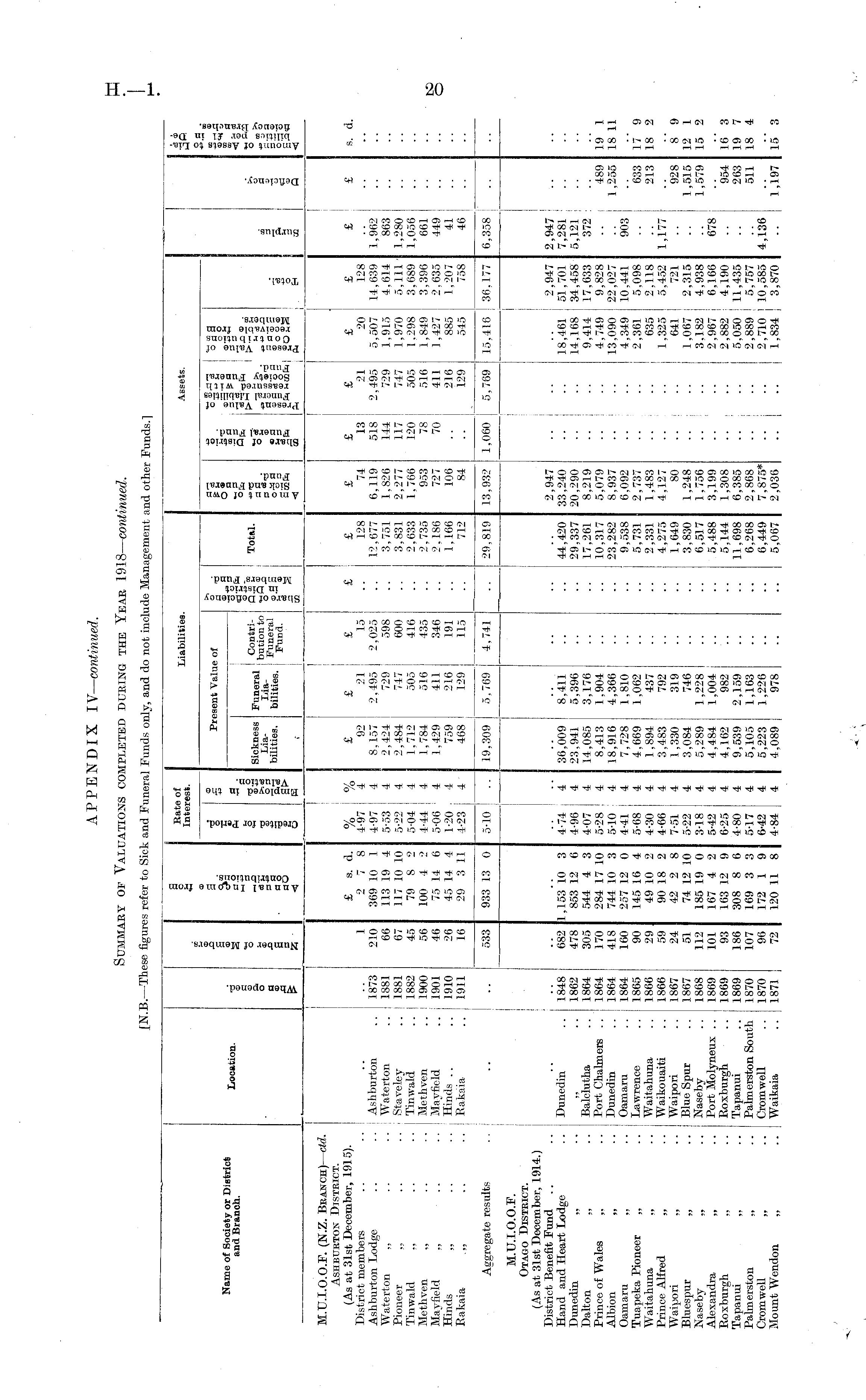 [N.B. —These figures refer to Sick and Funeral Funds only, and do not include Management and other Funds.] a o Bate of Interest. Liabilities. Assets. S a . HI 03'S < Name of Society or District and Branch. Location. © © © ED © S © o © a © «B a o ao © •a 5 © X3 a "" a ©43 O 3 ft* a> Pr, isent Value of Lass. WHties. ; **££ J a 01 a^ -« 3 3 "ts r. 2 a .2 . 0 s~g °bb u-° ' ©st: I ©-ss Q3 OS "- 1 .— < -^ O g •B 3 >> "<• 55 PL, [cm Total. © © © Sickness Liabilities. id a a. o M.U.I.O.O.F. (N.Z. Branch)— ctd. Ashburton District. (As at 31st December, 1915). District members Ashburton Lodge .. .. Ashburton Waterton ,, .. .. j Waterton Pioneer ,, .. .. | Staveley Tinwald „ .. . . Tinwakl Methven ,, .. .. Methven Mayfield „ .. .. Mayfield Hinds „ .. .. Hinds Rakaia .,, .. .. Rakaia. 1873 1881 I 1881 I 1882 1 1900 1901 1910 1911 1 210 66 67 45 56 46 26 16 £ s. d. 2 7 8 369 10 1 113 19 4 117 10 10 79 8 2 100 4 2 75 14 6 45 14 4 29 3 11 o/ o/ /o /o 4-97 4 4-97 4 5-53 4 5-22 4 5-04 4 4-44 4 5-06 1 4 1-20 ■ 4 4-23 | 4 £ 92 8,157 2,424 2,484 1.712 1,784 1,429 759 468 £ 21 2,495 729 747 505 516 411 216 129 £ 15 2,025 598 600 416 435 346 191 115 £ £ 128 12,677 3,751 3,831 2,633 2.735 2.186 1.166 712 £ 74 6,119 1,826 2,277 1,766 953 727 106 84 £ 13 518 144 117 120 78 70 £ 21 2,495 729 747 505 516 4-11 216 129 £ 20 5,507 1,915 1,970 1,298 1,849 1,427 885 545 £ 128 14,639 4,614 5,111 ' 3.689 3.396 2,635 1,207 758 £ 1,962 863 1,280 1,056 661 449 41 46 £ s. d. Aggregate results .. I 533 933 13 0 5-10 19,309 5,769 4,741 29,819 13,932 1,060 5,769 15,416 36,177 6,358 "" I M.U.I.O.O.F. Otago District. (As at 31st December, 1914.) District Benefit Fund Hand and Heart Lodge .. Dunedin Dunedin ,, .. ,, Dalton ,, .. Balclutha Prince of Wales „ .. ] Port Chalmers .. Albion „ .. | Dunedin Oamaru ,, .. i Oamaru Tuapeka Pioneer „ .. I Lawrence Waitahuna „ .. j Waitahuna Prince Alfred „ .. j Waikouaiti Waipori „ .. I Waipori Bluespur „ .. Blue Spur Naseby „ .. Naseby Alexandra „ .. Port Molyneux .. Roxburgh „ .. Roxburgh Tapanui ,, .. Tapanui Palmerston „ .. Palmerston South Cromwell ,, .. Cromwell Mount Wendon ,, .. Waikaia 1848 1862 1864 1864 1864 1864 1865 1866 1866 1867 1867 1868 1869 1869 1869 1870 1870 1871 682 478 305 170 418 160 90 29 59 24 51 112 101 93 186 107 96 72 1,153 10 3 853 12 6 544 4 3 284 17 10 744 10 3 257 12 0 145 16 4 49 10 2 90 18 2 42 2 8 74 12 10 185 19 0 167 4 2 163 12 9 308 8 6 169 3 3 172 1 9 120 11 8 4-74 4-96 4-07 5-28 5-10 4-41 5-68 4-30 4-66 7-51 5-22 3-18 5-42 6-25 4-80 5-17 6-42 4-84 4 4 4 4 4 4 4 4 4 4 4 4 4 4 4 4 4 4 36,009 23,941 14,085 8,413 18,916 7,728 4,669 1,894 3,483 1,330 3,084 5,289 4,484 4,162 9,539 5,105 5,223 4.089 8,411 5,396 3,176 1,904 4,366 1,810 1,062 437 792 319 746 1,228 1,004 982 2,159 1,163 1.226 978 44,420 29,337 17,261 10,317 23,282 9,538 5,731 2,331 4,275 1,649 3,830 6,517 5,488 5,144 11.698 6,268 6,449 5,067 2,947 33,240 20,290 8,219 5,079 8,937 6,092 2,737 1,483 4,127 80 1,248 1,756 3.199 1,308 6,385 2,868 7,875* 2,036 2,947 18,461 51,701 14,168 34,458 9,414 17,633 4,749 9,828 13.090 22,027 4,349 10,441 2,361 5,098 635 2.118 1,325 5,452 641 721 1,067 2,315 3.182 4.938 2,967 6,166 2,882 ' 4,190 5,050 ; 11,435 2,889 ■ 5,757 2,710 10,585 1,834 ! 3,870 2,947 7,281 5,121 372 903 1,177 678 4,136 489 1,255 633 213 928 1,515 1,579 954 263 511 1,197 19 1 18 11 17 9 18 2 8 9 12 1 15 2 16 3 19 7 18 4 15 3 I I
