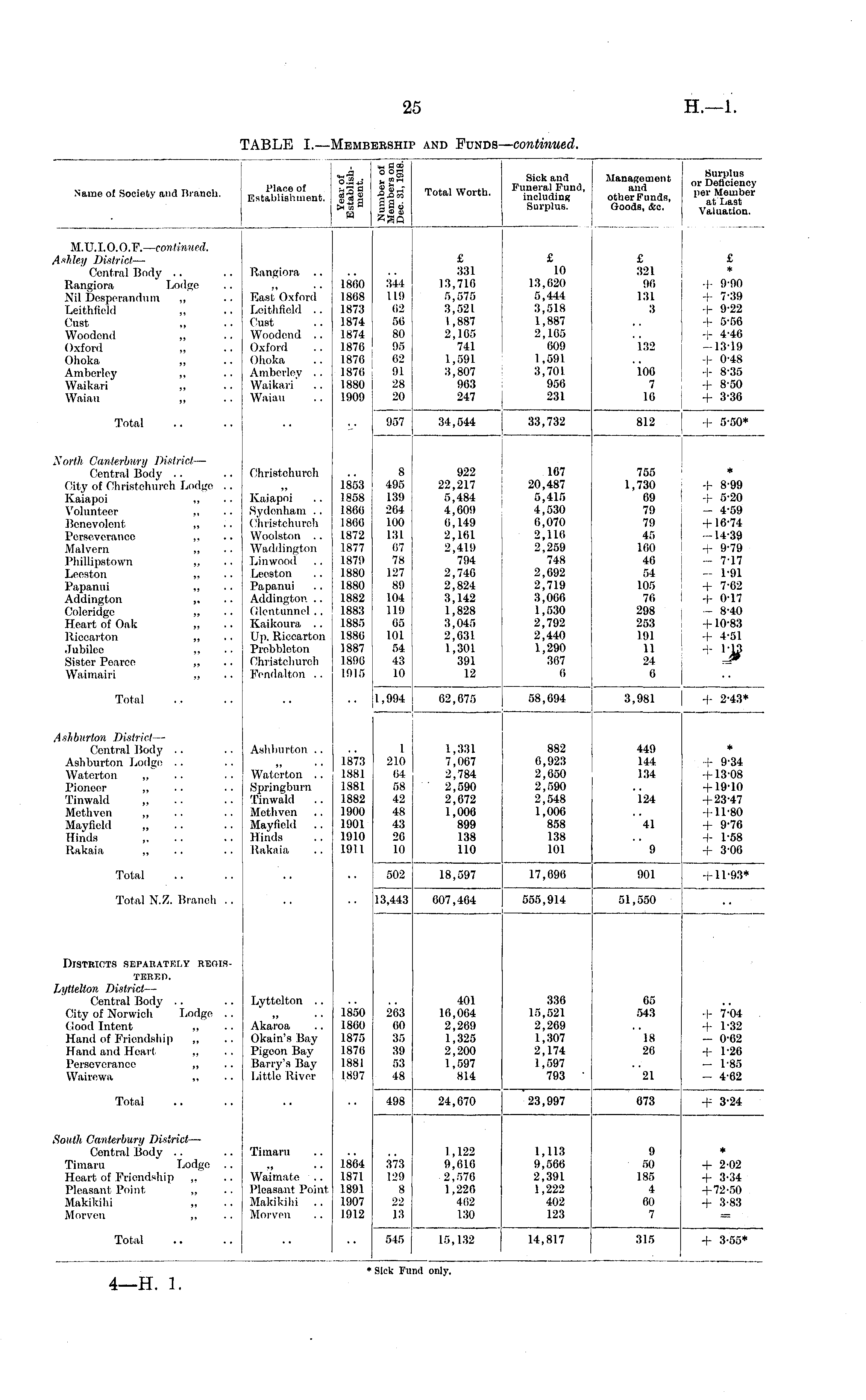 Name of Society and Branch. __.a O.r.*. Place of fa 3 a Establishment. Jug -*» H H •rr 3 00 Mi Total Worth. Sick and Funeral Fund, including Surplus. Management and other Funds, Goods, &c. Surplus or Deficiency per Member at Last Valuation. M.V.I.O.O.V.—continued. Ashley District — Central Body Rangiora Lodge Nil Desperandum ,, Leithfield „ Cust Woodend ,, Oxford ,, Ohoka ,, Amberley ,, Waikari „ Waiau „ Rangiora .. East'Oxford Leithfield .. Cust Woodend .. Oxford Ohoka Amberley . . Waikari Waiau I860 1868 1873 1874 1874 1876 1876 1876 1880 1909 344 119 62 56 80 95 62 91 28 20 £ 331 13,716 5,575 3,521 1,887 2,165 741 1,591 3,807 963 247 £ 10 13,620 5,444 3,518 1,887 2,165 609 1,591 3,701 956 231 £ 321 96 131 3 £ * -I- 9-90 -I- 7-39 + 9-22 + 5*56 + 4*46 1319 + 0-48 -I- 8-35 -|- 8-50 + 3-36 132 106 7 16 Total 957 34,544 33,732 812 -I- 5-50* North Canterbury District — Central Body City of Christchurch Lodge .. Kaiapoi ,, Volunteer ,, Benevolent „ Perseverance ,, Malvern ,, Phillipstown „ Leeston „ Papanui „ Addington „ Coleridge „ Heart of Oak „ Riccarton „ Jubilee ,, Sister Pearce ,, Waimairi „ Oliristchurch Kaiapoi Sydenham .. Christchurch Woolston .. Waddington Linwood Leeston Papanui Addington .. Glentuimel.. Kaikoura .. Up. Riccarton Prebbleton Christchurch Fendalton .. 1853 1858 1866 I860 1872 1877 1879 1880 1880 1882 1883 1885 1880 1887 1896 1915 8 495 139 264 100 131 67 78 127 89 104 119 65 101 54 43 10 922 22,217 5,484 4,609 6,149 2,161 2,419 794 2,746 2,824 3,142 1,828 3,045 2,631 1,301 391 12 167 20,487 5,415 4,530 0,070 2,116 2,259 748 2,692 2,719 3,006 1,530 2,792 2,440 1,290 367 6 755 1,730 69 79 79 45 160 46 54 105 76 298 253 191 11 24 6 * + 8-99 + 5-20 - 4-59 -1-16-74 -14-39 + 9*79 - 7-17 1*91 + 7-62 + 0*17 - 8-40 +10-83 + 4-51 ,-,3 Total 1,994 02,675 58,094 3,981 I- 2-43* Ashburton District — Central Body Ashburton Lodge Waterton „ Pioneer „ Tinwald „ Methven „ Mayfield „ Hinds „ Rakaia „ Ashburton .. Waterton .. Springburn Tinwald Methven .. Mayfield Hinds Rakaia 1873 1881 .1881 .1882 1900 1901 1910 1911 I 210 64 58 42 48 43 26 10 1,331 7,067 2,784 2,590 2,672 1,006 899 138 110 882 6,923 2,650 2,590 2,548 1,006 858 138 101 449 144 134 .24 * + 9-34 1-13-08 + 19*10 + 23*47 -1-11*80 + 9*76 + 1-58 + 3-06 41 9 Total 502 18,597 17,696 901 -I 11-93* Total N.Z. Branch . . 13,443 607,404 555,914 51,550 Districts separately reoisterep. Lyttelton District — Central Body City of Norwich Lodge .. Good Intent ,, Hand of Friendship „ Hand and Heart ,, Perseverance ,, Wairewa „ Lyttelton .. 1850 1860 1875 1876 1881 1897 263 60 35 39 53 48 401 16,004 2,269 1,325 2,200 1,597 814 336 15,521 2,269 1,307 2,174 1,597 793 65 543 -I- 7*04 + 1-32 - 0-62 -I 1-26 - 1-85 - 4-62 Akaroa Okain's Bay Pigeon Bay Barry's Bay Little River 18 26 21 Total 498 24,670 23,997 673 + 3-24 South Canterbury District —• Central Body Timaru Lodge .. Heart of Friendship „ Pleasant Point ,, Makikihi M or ven ,, Timaru •* • - Waimate .. Pleasant Point Makikihi Morvi'u 1864 1871 1891 1907 1912 373 129 8 22 18 1,122 9,616 2,576 1,226 462 130 1,113 9,506 2,391 1,222 402 123 9 50 185 4 60 7 * + 2-02 + 3*34 + 72-50 + 3-83 Total 545 15,132 14,817 315 + 3-55* * Sick Fund only.