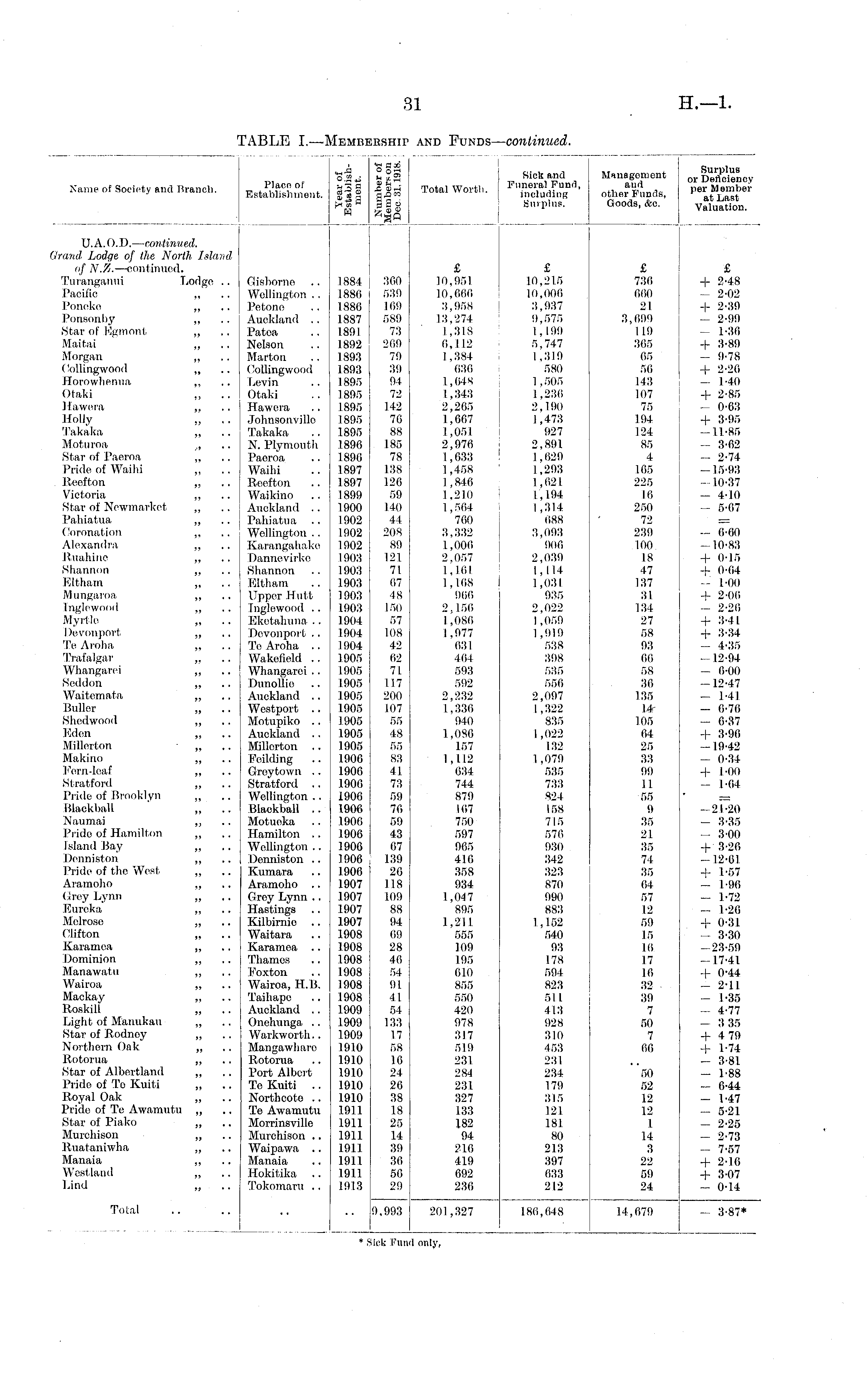 Name of Society and Branch. Place of Establishment. «H.a o.2!.j rl-3 3 $$ a r-i ca -i H O "rr u $o> Sick and Management _=»_- m.i Wai+i. ' Funeral Fund, and |js. total Woith. , lnolu ding other Funds, § 2 o Surplus. Goods, &c. Surplus or Deficiency per Member at Last Valuation. U.A.O.D. — continued. Grand Lodge of the North Island of N.Z. —continued. Turanganui Lodge .. Pacifio ,, Poneke ,, Ponsonby „ Star of Egmont „ Maitai „ Morgan ,, Oollingwood ,, Horowhemia ,, Otaki Hawera ,, Holly Takaka ,, Motnroa „ Star of Paeroa ,, Pride of Waihi ,, Reefton „ Victoria ,, Star of Newmarket ,, Pahiatua ,, Coronation ,, Alexandra ,, Ruahine ,, Shannon „ Eltham „ Mungaroa ,, Inglewood ,, Myrtle Devonport ,, Te Aroha ,, Trafalgar ,, Whangarei ,, Seddon ,, Waitemata „ Buller „ .. Shedwood ,, Eden „ Millerton „ Makino „ Fern-leaf ,, Stratford ,, Pride of Brooklyn „ Blackball „ Naumai ,, Pride of Hamilton „ Island Bay ,, Denniston ,, Pride of the West „ Aramoho „ Grey Lynn ,, Eureka „ Melrose „ Clifton Karamca „ Dominion ,, Manawatu „ Wairoa „ Mackay „ Roskill Light of Manukau „ Star of Rodney „ Northern Oak „ Rotorua „ Star of Albertland ,, Pride of To Kuiti ,, Royal Oak „ Pride of Te Awamutu „ Star of Piako „ Murchison „ Ruataniwha „ Manaia ., Wostland „ Lind „ Gisborne Wellington .. Petone Auckland .. Patea Nelson Marlon Oollingwood Levin Otaki Hawera Johnsonville Takaka N. Plymouth Paeroa Waihi Reefton Waikino Auckland . . Pahiatua Wellington .. Karangahake Dannevirke Shannon Eltham Upper Hutt Inglewood .. Eketahuna .. Devonport .. To Aroha .. Wakefield .. Whangaroi .. Dunollio Auckland .. Westport .. Mfltupiko .. Auckland .. Millerton .. Feilding Greytown .. Stratford .. Wellington .. Blackball .. Motueka Hamilton .. Wellington .. Denniston .. Kumara Aramoho .. Groy Lynn .. Hastings Kilbirnic Waitara Karamca .. Thames Foxton Wairoa, H.B. Taihape Auckland .. Onehunga .. Warkworth.. Mangawhare Rotorua Port Albert Te Kuiti North cote .. Te Awamutu Morrinsville Murchison .. Waipawa .. Manaia Hokitika Tokomaru .. 1884 1880 i 1880 1887 1891 1892 1893 1893 1.895 1895 1895 1895 1895 1890 1890 1897 1897 1899 1900 1902 1902 1902 1903 1903 1903 1903 1903 1904 1904 1904 1905 1905 1905 1905 1905 1905 1905 1905 1900 1900 1900 1900 1900 1900 1.906 1900 1900 I 1900 1907 1907 1907 1907 1908 1908 1908 1908 1908 1908 1909 1909 1909 1910 1910 1910 1910 1910 1911 1911 1911 1911 1911 1911 1913 £ £ £ 300 10,951 10,215 730 539 10,060 10,006 660 11)9 3.95S 3,937 21 589 13,274 9,575 3,099 73 1,318 1,199 119 209 0,112 5,747 365 79 1,384 1,319 65 39 636 580 56 94 1,648 1,505 143 72 1,343 1,230 107 142 2,265 2,190 75 70 1,667 1,473 194 88 1,051 927 124 185 2,970 2,891. 85 78 1,033 1,629 4 13S 1,458 1,293 105 126 I,846 1,621 225 59 1,210 1,194 16 140 1,564 1,314 250 44 700 088 72 208 3,332 | 3,093 239 89 1,000 906 100 121 2.057 2,039 18 71 1,161 1,114 47 07 1,168 I 1,031 137 48 906 935 31 150 2,150 2,022 134 57 1,086 1,059 27 108 1,977 1,919 58 42 031 538 93 62 464 398 66 71 593 535 58 I 17 592 556 36 200 2,232 2,097 135 107 1,330 1,322 .1455 940 835 105 48 1,080 1,022 04 55 157 132 25 83 1,112 1,079 33 41 634 535 99 73 744 733 I I 59 S79 824 55 76 167 158 9 59 750 715 35 43 597 570 21 67 965 930 35 139 410 342 74 20 358 323 35 118 934 870 04 109 1,047 990 57 88 895 883 12 94 1,211. 1,152 59 09 555 540 15 28 109 93 10 46 195 178 17 54 010 594 10 91 855 823 32 41 550 511 39 54 420 413 7 133 978 928 50 17 317 310 7 58 519 453 00 10 231 231 24 284 234 50 20 231 179 52 38 327 315 12 18 133 121 12 25 182 181 1 14 94 80 14 39 210 213 3 30 419 397 22 50 692 633 59 29 230 212 24 300 539 109 589 73 209 79 39 94 72 142 76 88 185 78 138 120 59 140 44 208 89 121 71 07 48 150 57 108 42 02 71 117 200 107 55 48 55 83 41 73 59 70 59 43 67 139 20 118 109 88 94 09 28 46 54 91 4 1 54 133 17 58 16 24 26 38 18 25 14 39 36 56 29 £ 10,21.5 10,006 3,937 9,575 1,199 5,747 1,319 580 1,505 1,230 2,190 1,473 927 2,891 1,629 1,293 1,621 1,194 1,314 688 3,093 906 2,039 1,114 1,031 935 2,022 1,059 1,919 538 398 535 550 2,097 1,322 835 1,022 132 1,079 535 733 824 158 715 570 930 342 323 870 990 883 1,152 540 93 178 594 823 511 413 928 310 453 231 234 179 315 121 181 80 213 397 633 212 £ 736 660 21 3,099 119 365 65 56 143 107 75 194 124 85 4 105 225 16 250 72 239 100 18 47 137 31 134 27 58 93 66 58 36 135 14105 04 25 33 99 II 55 9 35 21 35 74 35 04 57 12 59 15 10 17 10 32 39 7 50 7 00 £ + 2-48 - 2*02 + 2-39 2*99 - 1*36 + 3-89 - 9-78 + 2-26 - 1-40 + 2*85 - 0-03 + 3-95 --11-85 - 3-62 - 2-74 -15-93 10-37 - 4-10 - 5-07 - 0-60 -10-83 + 0-15 + 0-04 - 1-00 + 2-00 - 2-20 + 3-41 + 3-34 - 4-35 -12-94 - 6-00 -12-47 - 1-41 - 0-70 - 6-37 + 3-96 -19-42 - 0-34 + 1-00 1-64 -21-20 - 3-35 - 3-00 + 3-20 -12*61 + 1*57 .... i.t)fi - 1-72 - 1-26 + 0-31 - 3-30 -23-59 -17-41 + 0-44 - 2-11 - 1-35 - 4-77 - 3 35 + 4 79 + 1-74 ■ - 3-81 - 1-88 - 6-44 - 1-47 - 5-21 - 2-25 - 2-73 - 7-57 + 2-16 + 3-07 - 0-14 50 52 12 12 1 14 3 22 59 24 Total 9,993 201,327 186,648 14,679 - 3-87* »S rl only, lick Fnm