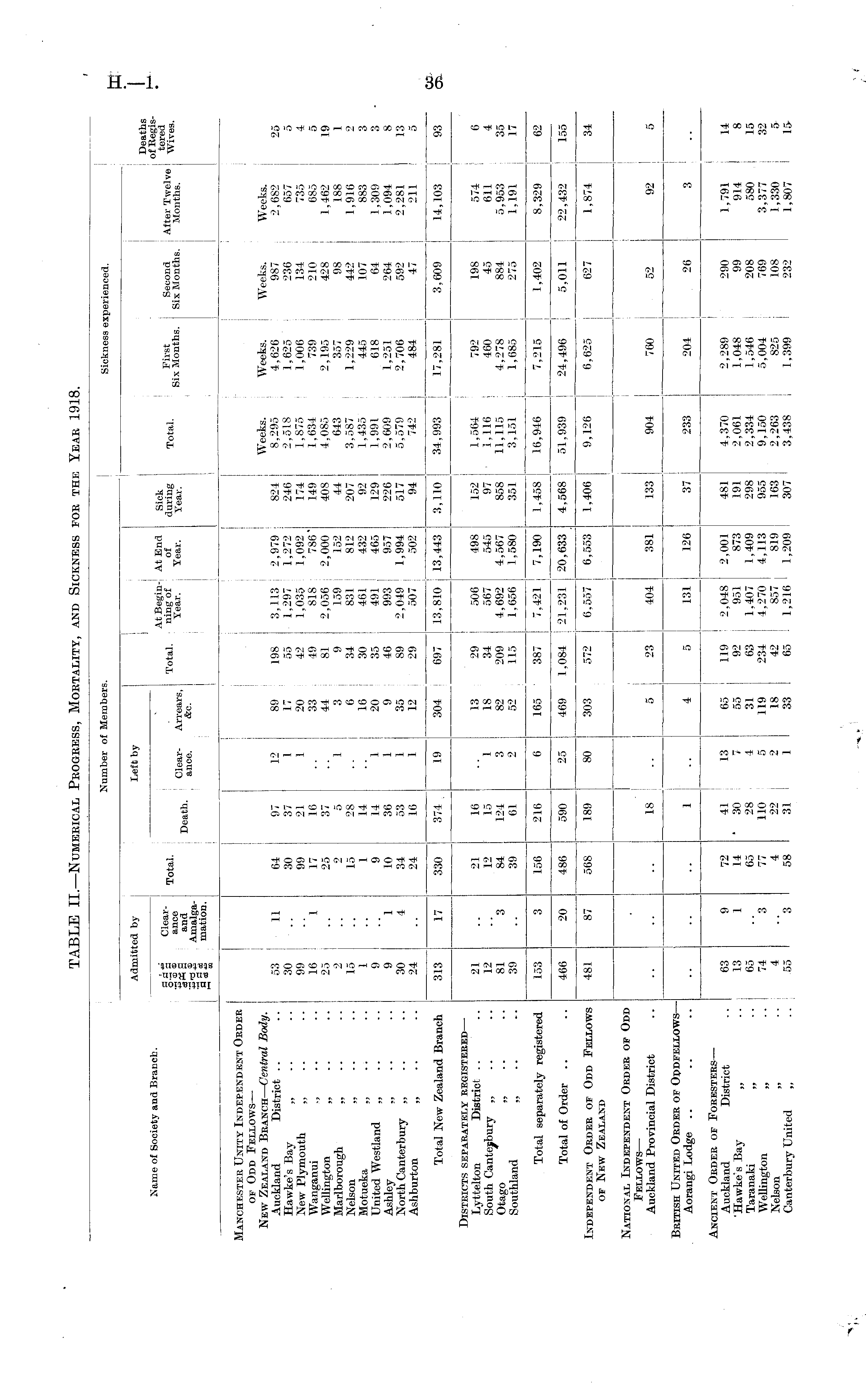 Number of Members. Sickness experienced. Total. Left by tx .i, ClearDeath - t ance. i Total. Arrears, &c. I At Begin-! At End ning of ; of Tear. Year. . Admitted by Left by Sick during Year. Total. First Second After Twelve Six Months. Six Months. Months. Name of Society and Branch. I ga-g Clear.2 '3 cd ance diHd and Amalgams .2 mation. I -H CO Deaths of Registered Wives. Manchester Unity Independent Order of Odd Fellows — New Zealand Branch — Central Body. Auckland District. Hawke's Bay „ New Plymouth „ Wanganui „ Wellington „ Marlborough ,, Nelson „ Motueka „ United Westland „ Ashley „ North Canterbury „ Ashburton „ 53 30 99 16 25 15 1 9 9 30 24 11 1 64 30 99 17 25 15 1 9 10 34 24 97 37 21 16 37 5 28 14 14 36 53 10 12 1 1 "l 89 17 20 33 44 3 6 16 20 9 35 12 198 55 42 49 81 9 34 30 35 40 89 29 3,113 1,297 1.035 818 2,050 159 831 461 491 993 2,049 507 2,979 1,272 1,092 786" 2,000 152 812 432 465 957 1,994 502 824 246 174 149 408 44 207 92 129 226 517 94 Weeks. 8,295 2,518 1,875 1,634 4.085 043 3,587 1,435 1,991 2,009 5,579 742 i Weeks. 4,626 1,625 1,006 739 2,195 357 1,229 445 618 1,251 2,700 484 Weeks. 987 236 134 210 428 98 442 107 64 264 592 47 Weeks. 2,682 657 735 685 1,462 188 1,916 883 1,309 1,094 2,281 211 25 5 5 19 1 2 3 3 8 13 5 "l 4 1 1 1 1 Total New Zealand Branch 313 17 330 374 , 19 304 697 13,810 13,443 3,110 34,993 17,281 3,609 14,103 93 Districts separately registered — Lyttelton District South Canterbury „ Otago „ Southland „ 21 12 81 39 "3 21 12 84 39 16 15 124 61 1 3 2 13 18 82 52 29 34 209 115 506 567 4,692 1,656 498 545 4,567 1,580 152 97 858 351 1,564 1,116 11,115 3,151 792 460 4,278 1,685 198 45 884 275 574 611 5,953 1,191 6 4 35 17 Total separately registered 153 O O 156 216 6 105 387 7,421 7,190 1,458 i 16,946 7,215 1,402 8,329 62 Total of Order 466 20 486 590 25 469 1,084 21,231 20,633 4,568 51,939 24,496 5,011 22,432 155 Independent Order of Odd Fellows of New Zealand 481 87 56S 189 80 303 572 6,557 6,553 1,406 9,126 6,625 627 1,874 34 National Independent Order of Odd Fellows — Auckland Provincial District 904 760 52 18 5 23 i 404 381 133 92 I 5 British United Order of Oddfellows — Aorangi Lodge 1 233 204 131 126 37 26 3 Ancient Order of Foresters — Auckland District Hawke's Bay „ Taranaki „ Wellington „ Nelson „ Canterbury United ,, 63 13 65 74 4 55 9 1 3 72 14 65 77 4 58 41 30 28 110 22 31 13 4 5 2 1 65 55 31 119 18 33 119 2,048 92 951 63 1,407 234 4,270 42 857 65 1,216 2,001 873 1,409 4,113 819 1.209 481 191 298 955 163 307 4,370 2,061 2,334 9,150 2,263 3,438 2,289 1,048 1,546 5,004 825 1.399 290 99 208 709 108 232 1,791 914 580 3,377 1,330 1,807 l i 14 8 15 32 5 15 3