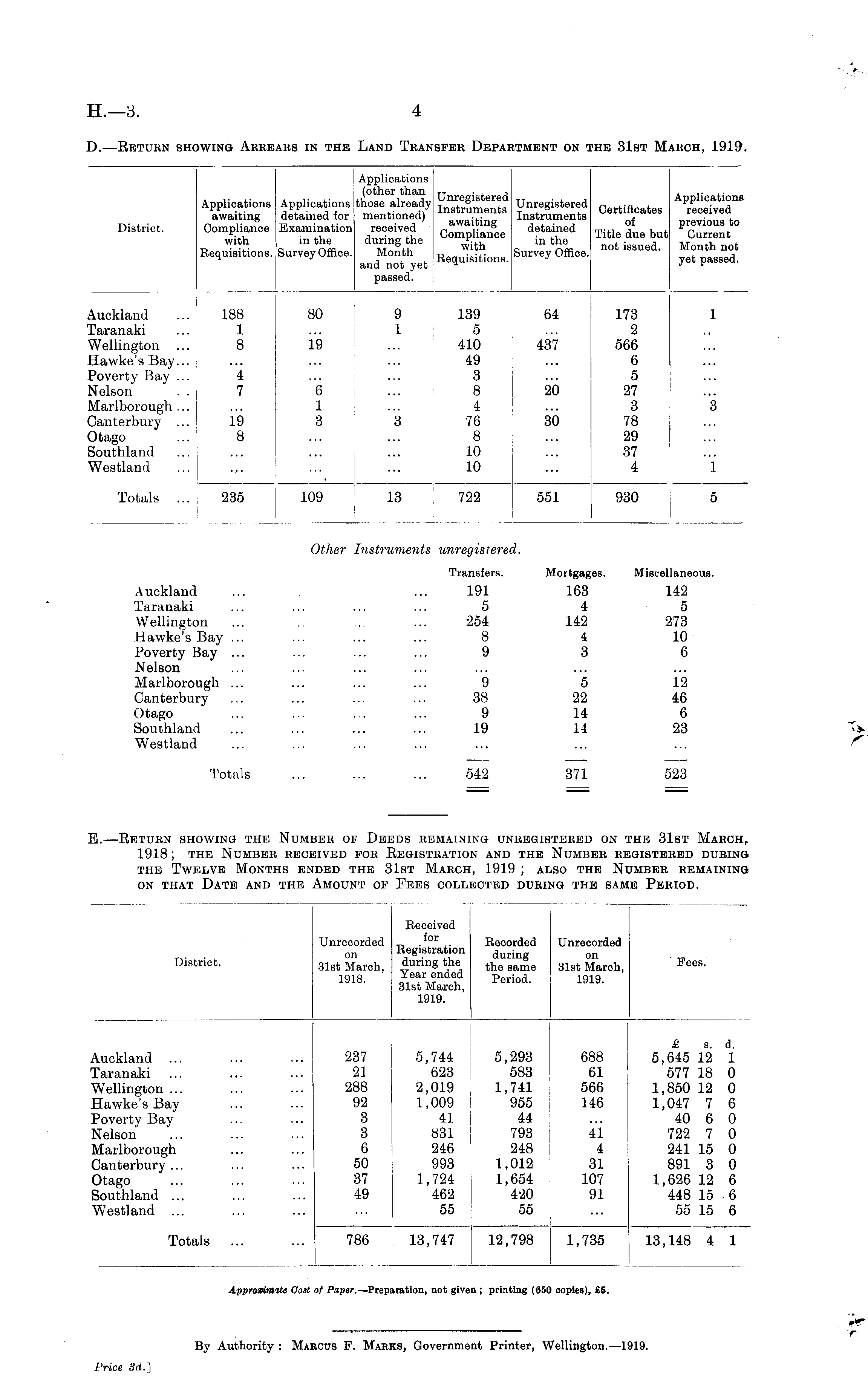 District. Unrecorded on 31st March, 1918. Received for Registration during the Year ended 31st March, 1919. Recorded during the same Period. Unrecorded on 31st March, 1919. ' Pees. Auckland Taranaki Wellington ... Hawke's Bay Poverty Bay Nelson Marlborough Canterbury ... Otago Southland ... Westland ... 237 21 288 92 3 3 6 50 37 49 5,744 623 2,019 1,009 41 831 246 993 1,724 462 55 5,293 583 1,741 955 44 793 248 1,012 1,654 420 55 688 61 566 146 41 4 31 107 91 £ s. d. 5,645 12 1 577 18 0 1,850 12 0 1,047 7 6 40 6 0 722 7 0 241 15 0 891 3 0 1,626 12 6 448 15 6 55 15 6 Totals 786 13,747 12,798 1,735 13,148 4 1