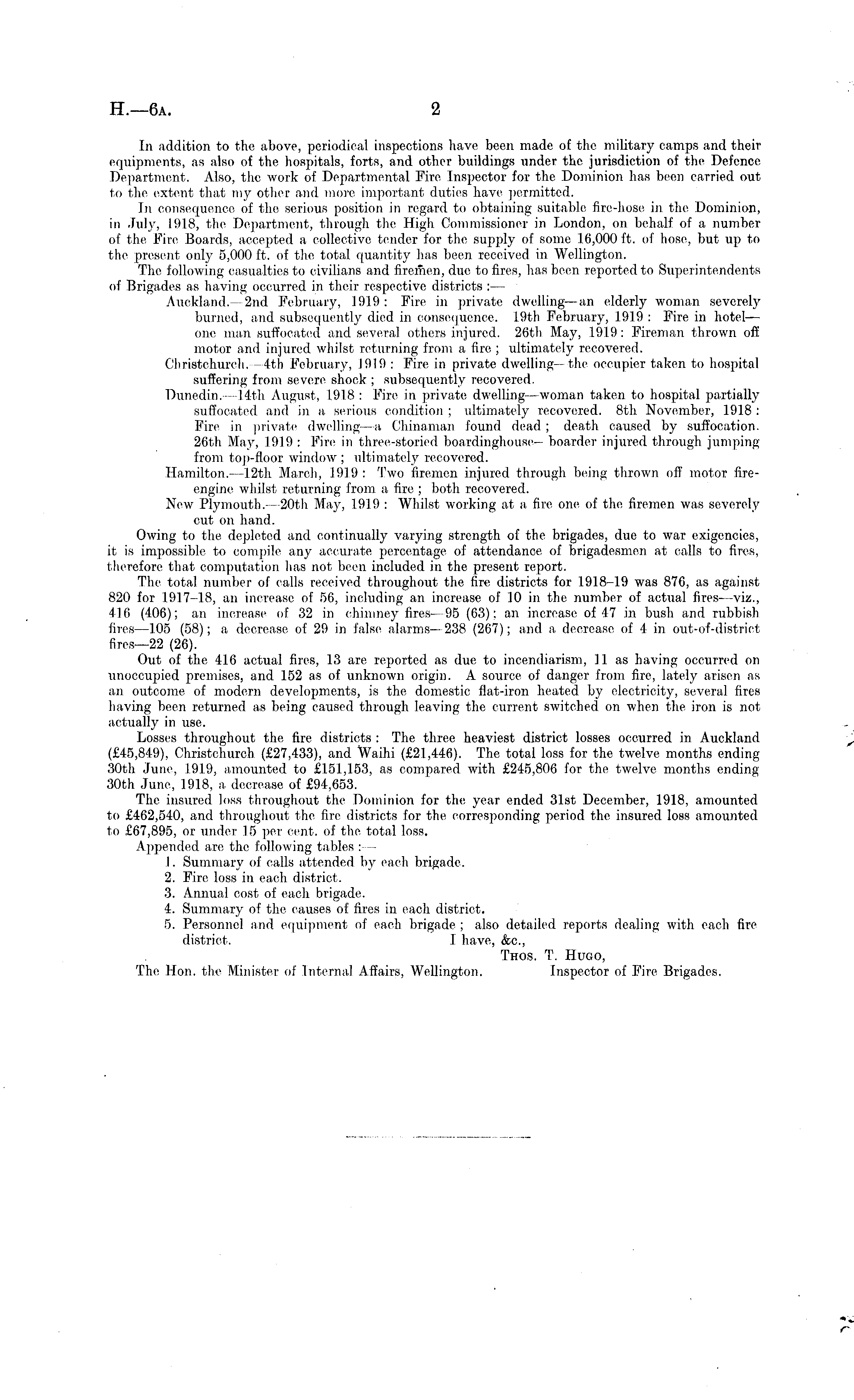 In addition to the above, periodical inspections have been made of the military camps and their equipments, as also of the hospitals, forts, and other buildings under the jurisdiction of the Defence Department. Also, the work of Departmental Fire Inspector for the Dominion has been carried out to the extent that my other and more important duties have permitted. In consequence of the serious position in regard to obtaining suitable (ire-hose in the Dominion, in July, 1918, the Department, through the High Commissioner in London, on behalf of a number of the, Fire Boards, accepted a, collective tender for the supply of some 16,000 ft. of hose, but up to the present only 5,000 ft. of the total quantity has been received in Wellington. The following casualties to civilians and firemen, due to fires, has been reported to Superintendents of Brigades as having occurred in their respective districts : — Auckland. —2nd February, 1919 : Fire in private dwelling—an elderly woman severely burned, and subsequently died in consequence. 19th February, 1919 : Fire in hotelone man suffocated and several others injured. 26th May, 1919: Fireman thrown off motor and injured whilst returning from a fire ; ultimately recovered. Cliristchurch. 4th February, 1919 : Fire in private dwelling- the occupier taken to hospital suffering from severe, shock ; subsequently recovered. Dunedin. —14th August, 1918: Fire in private dwelling- woman taken to hospital partially suffocated and in a, serious condition ; ultimately recovered. Bth November, 1918 : Fire in private dwelling—a, Chinaman found dead ; death caused by suffocation. 26th May, 1919 : Fire in three-storied boarding-house boarder injured through jumping from top-floor window ; ultimately recovered. Hamilton.--I.2th March, 1919: Two firemen injured through being thrown off motor fireengine whilst returning from a fire ; both recovered. New Plymouth.—2oth May, 1919 : Whilst working at a, fire one of the firemen was severely cut on hand. Owing to the depleted and continually varying strength of the brigades, due to war exigencies, it is impossible to compile any accurate percentage of attendance, of brigadesmen at calls to fires, therefore that computation has not been included in the present report. The total number of calls received throughout the fire districts for 1918-19 was 876, as against 820 for 1917-18, an increase of 56, including an increase of 10 in the number of actual fires —viz., 416 (406); an increase of 32 in chimney fires—9s (63); an increase of 47 in bush and rubbish fires —105 (58); a decrease of 29 in false alarms— 238 (267); and a decrease of 4in out-of-distriet fires—22 (26). Out of the 416 actual fires, 13 are reported as due to incendiarism, 11 as having occurred on unoccupied premises, and 152 as of unknown origin. A source of danger from fire, lately arisen as an outcome, of modern developments, is the domestic flat-iron heated by electricity, several fires having been returned as being caused through leaving the current switched on when the iron is not actually in use. Losses throughout the fire districts : The three heaviest district losses occurred in Auckland (£45,849), Christchurch (£27,433), and Waihi (£21,446). The total loss for the twelve months ending 30th June, 1.919, amounted to £151,153, as compared with £245,806 lor the twelve months ending 30th June, 1918, a decrease of £94,653. The insured loss throughout the Dominion for the year ended 31st December, 1918, amounted to £462,540, and throughout the fire districts for the corresponding period the insured loss amounted to £67,895, or under 15 per cent, of the total loss. Appended are the following tables : — 1. Summary of calls attended by each brigade. 2. Fire loss in each district. 3. Annual cost of each brigade. 4. Summary of the causes of fires in each district. 5. Personnel and equipment of each brigade ; also detailed reports dealing with each fire district. .1 have, &c, Thos. T. Hugo, The Hon. the Minister ol Interna] Affairs, Wellington. Inspector of Fire Brigades.