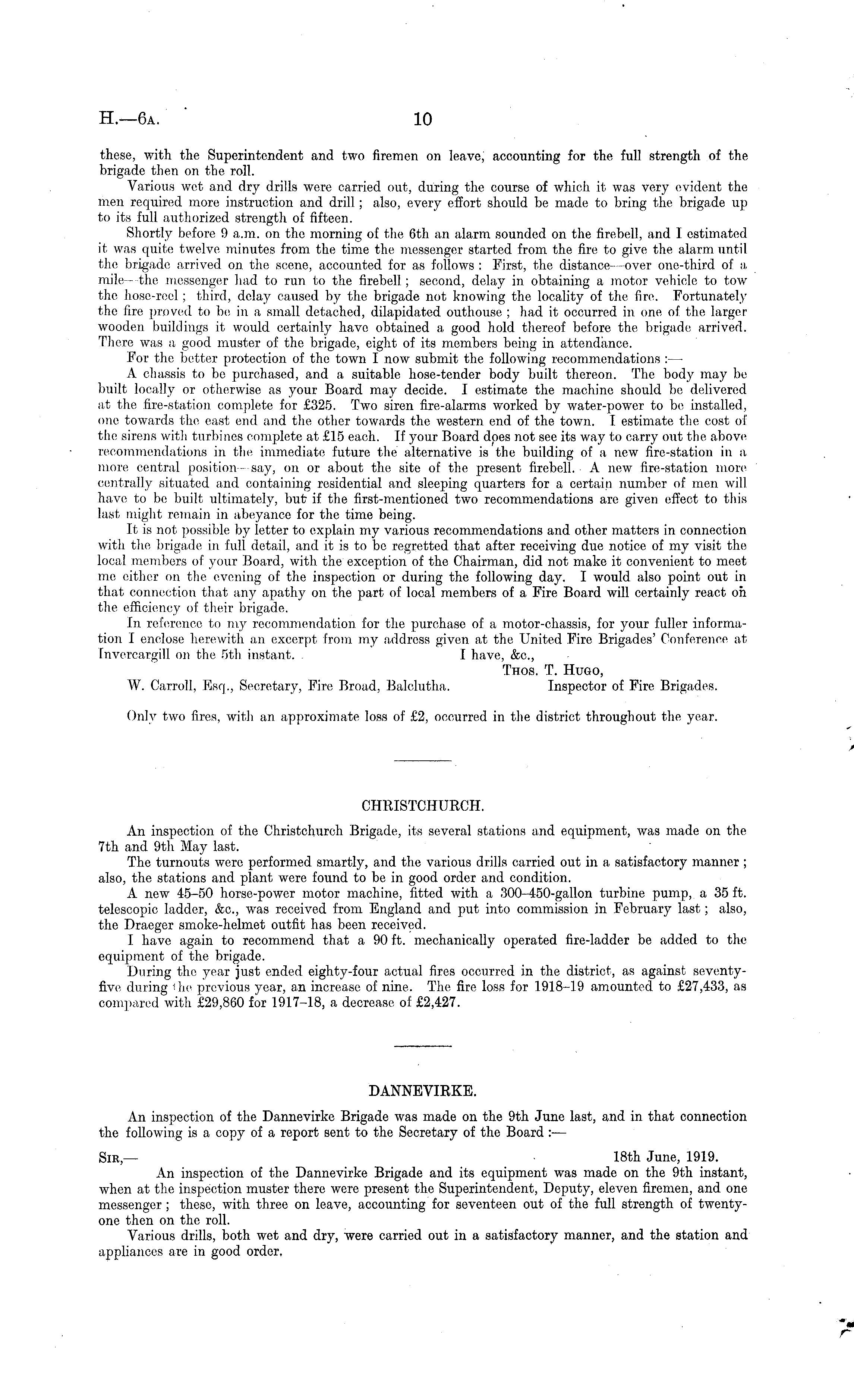 these, with the Superintendent and two firemen on leave, accounting for the full strength of the brigade then on the roll. Various wet and dry drills were carried out, during the course of which it was very evident the men required more instruction and drill; also, every effort should be made to bring the brigade up to its full authorized strength of fifteen. Shortly before 9 a.m. on the morning of the 6th an alarm sounded on the firebell, and I estimated it, was quite twelve minutes from the time the messenger started from the fire to give the alarm until tho brigade arrived on the scene, accounted for as follows : First, the distance over one-third of a mile —the messenger had to run to the firebell ; second, delay in obtaining a motor vehicle to tow the hose-reel; third, delay caused by the brigade not knowing the locality of the fire. Fortunately the fire proved to be in a small detached, dilapidated outhouse ; had it occurred in one of the larger wooden buildings it would certainly have obtained a good hold thereof before tho brigade arrived. There was a good muster of the brigade, eight of its members being in attendance. For the better protection of the town I now submit the following recommendations : — A chassis to bo purchased, and a suitable hose-tender body built thereon. The body may be built locally or otherwise as your Board may decide. I estimate the machine should bo delivered at the fire-station complete for £325. Two siren fire-alarms worked by water-power to be installed, one towards the east end and the other towards the western end of the town. I estimate the cost of the sirens with turbines complete at £15 each. If your Board does not see its way to carry out the above recommendations in the immediate future the alternative is the building of a new fire-station in a more central position—say, on or about the site of the present firebell. A new fire-station more centrally situated and containing residential and sleeping quarters for a certain number of men will have to be built ultimately, but if the first-mentioned two recommendations are given effect to this last might remain in abeyance for the time being. It is not possible by letter to explain my various recommendations and other matters in connection with tho brigade in full detail, and it is to bo regretted that after receiving due notice of my visit the local members of your Board, with, the exception of the Chairman, did not make it convenient to meet me either on the evening of the inspection or during the following day. I would also point out in that connection that any apathy on the part of local members of a Fire Board will certainly react oh the efficiency of their brigade. In reference to my recommendation for the purchase of a motor-chassis, for your fuller information I enclose herewith an excerpt from my address given at the United Fire Brigades' Conference at Invercargill on the sth instant. . I have, &c, Thos. T. Hugo, W. Carroll, Esq., Secretary, Fire Broad, Balclutha. Inspector of Fire Brigades. Only two fires, with an approximate loss of £2, occurred in the district throughout the year. CHRISTCHURCH. An inspection of the Christchurch Brigade, its several stations and equipment, was made on the 7th and 9th May last. The turnouts were performed smartly, and the various drills carried out in a satisfactory manner ; also, the stations and plant were found to be in good order and condition. A new 45-50 horse-power motor machine, fitted with a 300-450-gallon turbine pump, a 35 ft. telescopic ladder, &c, was received from England and put into commission in February last; also, the Draeger smoke-helmet outfit has been received. I have again to recommend that a 90 ft. mechanically operated fire-ladder be added to the equipment of the brigade. During tho year just ended, eighty-four actual fires occurred in the district, as against seventyfive during the previous year, an increase of nine. The fire loss for 1918-19 amounted to £27,433, as compared with £29,860 for 1917-18, a decrease of £2,427. DANNEVIRKE. An inspection of the Dannevirke Brigade was made on the 9th June last, and in that connection the following is a copy of a report sent to the Secretary of the Board : — Sir— • 18th June, 1919. An inspection of the Dannevirke Brigade and its equipment was made on the 9th instant, when at the inspection muster there were present the Superintendent, Deputy, eleven firemen, and one messenger ; these, with three on leave, accounting for seventeen out of the full strength of twentyone then on the roll. Various drills, both wet and dry, were carried out in a satisfactory manner, and the station and appliances are in good order,