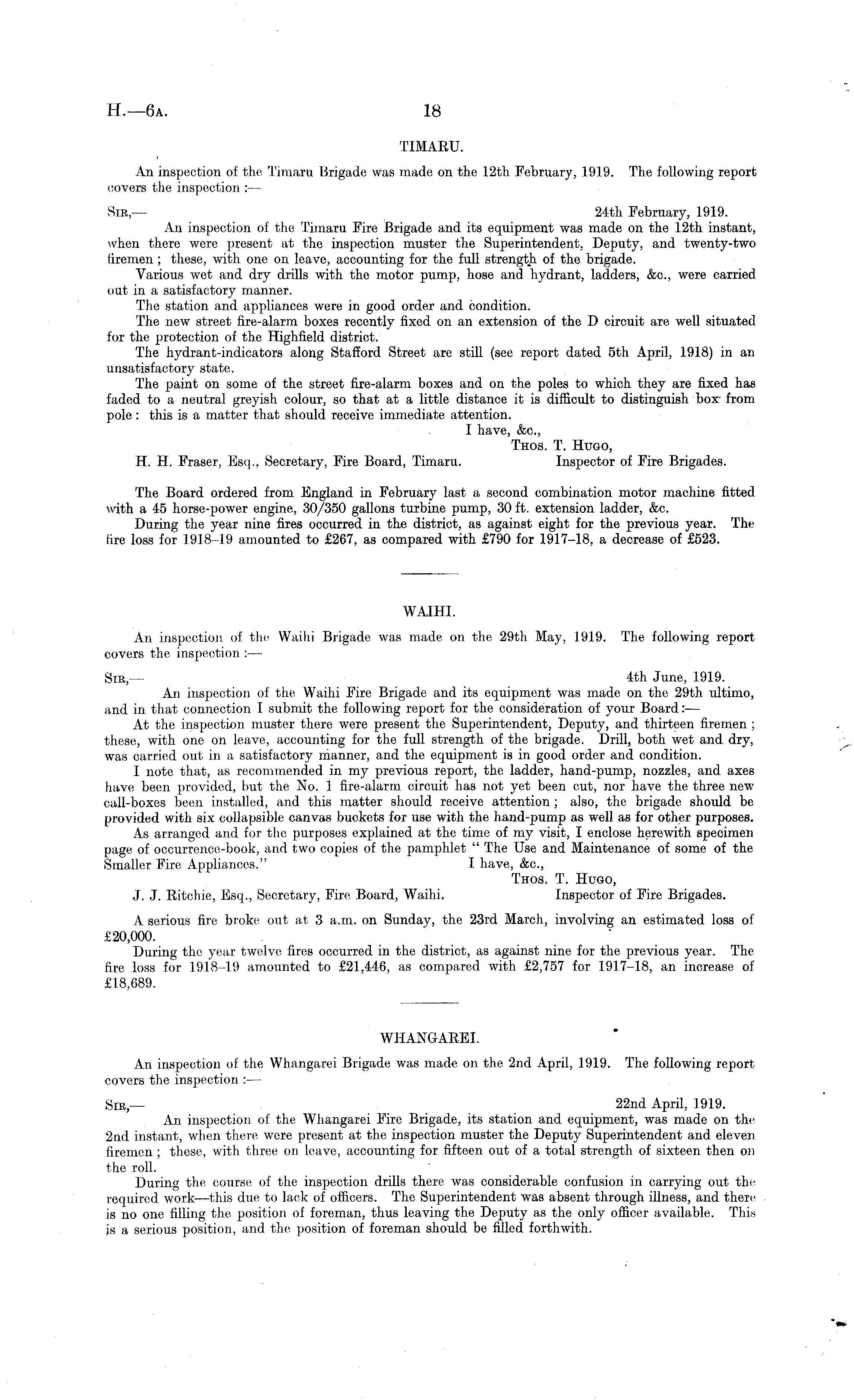 TIMARU. An inspection of the Timaru Brigade was made on the 12th February, 1919. The following report covers the inspection : — Sir,— 24th February, 1919. An inspection of the Timaru Fire Brigade and its equipment was made on the 12th instant, when there were present at the inspection muster the Superintendent, Deputy, and twenty-two firemen ; these, with one on leave, accounting for the full strength of the brigade. Various wet and dry drills with the motor pump, hose and hydrant, ladders, &c, were carried out in a satisfactory manner. The station and appliances were in good order and condition. The new street fire-alarm boxes recently fixed on an extension of the D circuit are well situated for the protection of the Highfield district. The hydrant-indicators along Stafford Street are still (see report dated sth April, 1918) in an unsatisfactory state. The paint on some of the street fire-alarm boxes and on the poles to which they are fixed has faded to a neutral greyish colour, so that at a little distance it is difficult to distinguish box from pole : this is a matter that should receive immediate attention. I have, &c, Thos. T. Hugo, H. H. Fraser, Esq., Secretary, Fire Board, Timaru. Inspector of Fire Brigades. The Board ordered from England in February last a second combination motor machine fitted with a 45 horse-power engine, 30/350 gallons turbine pump, 30 ft. extension ladder, &c. During the year nine fires occurred in the district, as against eight for the previous year. The lire loss for 1918-19 amounted to £267, as compared with £790 for 1917-18, a decrease of £523. WAIHI. An inspection of the Waihi Brigade was made on the 29th May, 1919. The following report covers the inspection : — Sir,— 4th June, 1919. An inspection of the Waihi Fire Brigade and its equipment was made on the 29th ultimo, and in that connection I submit tho following report for the consideration of your Board: — At the inspection muster there were present the Superintendent, Deputy, and thirteen firemen ; these, with one on leave, accounting for the full strength of the brigade. Drill, both wet and dry, was carried out in a satisfactory manner, and the equipment is in good order and condition. I note that, as recommended in my previous report, the ladder, hand-pump, nozzles, and axes have been provided, but the No. 1 fire-alarm circuit has not yet been cut, nor have the three new call-boxes been installed, and this matter should receive attention ; also, the brigade should be provided with six collapsible canvas buckets for use with the hand-pump as well as for other purposes. As arranged and for the purposes explained at the time of my visit, I enclose herewith specimen page of occurrence-book, and two copies of the pamphlet " The Use and Maintenance of some of the Smaller Fire Appliances." I have, &c, Thos. T. Hugo, J. J. Ritchie, Esq., Secretary, Fire Board, Waihi. Inspector of Fire Brigades. A serious fire broke out at 3 a.m. on Sunday, the 23rd March, involving an estimated loss of £20,000. During the year twelve fires occurred in the district, as against nine for the previous year. The fire loss for 1918-19 amounted to £21,446, as compared with £2,757 for 1917-18, an increase of £18,689. WHANGAREI. An inspection of the Whangarei Brigade was made on the 2nd April, 1919. The following report covers the inspection : — Sir— 22nd April, 1919. An inspection of the Whangarei Fire Brigade, its station and equipment, was made on the 2nd instant, when there were present at the inspection muster the Deputy Superintendent and eleven firemen ; these, with three on leave, accounting for fifteen out of a total strength of sixteen then on the roll. During the course of the inspection drills there was considerable confusion in carrying out the required work —this due to lack of officers. Tho Superintendent was absent through illness, and there is no one filling the, position of foreman, thus leaving the Deputy as the only officer available. This is a serious position, and the position of foreman should be filled forthwith.